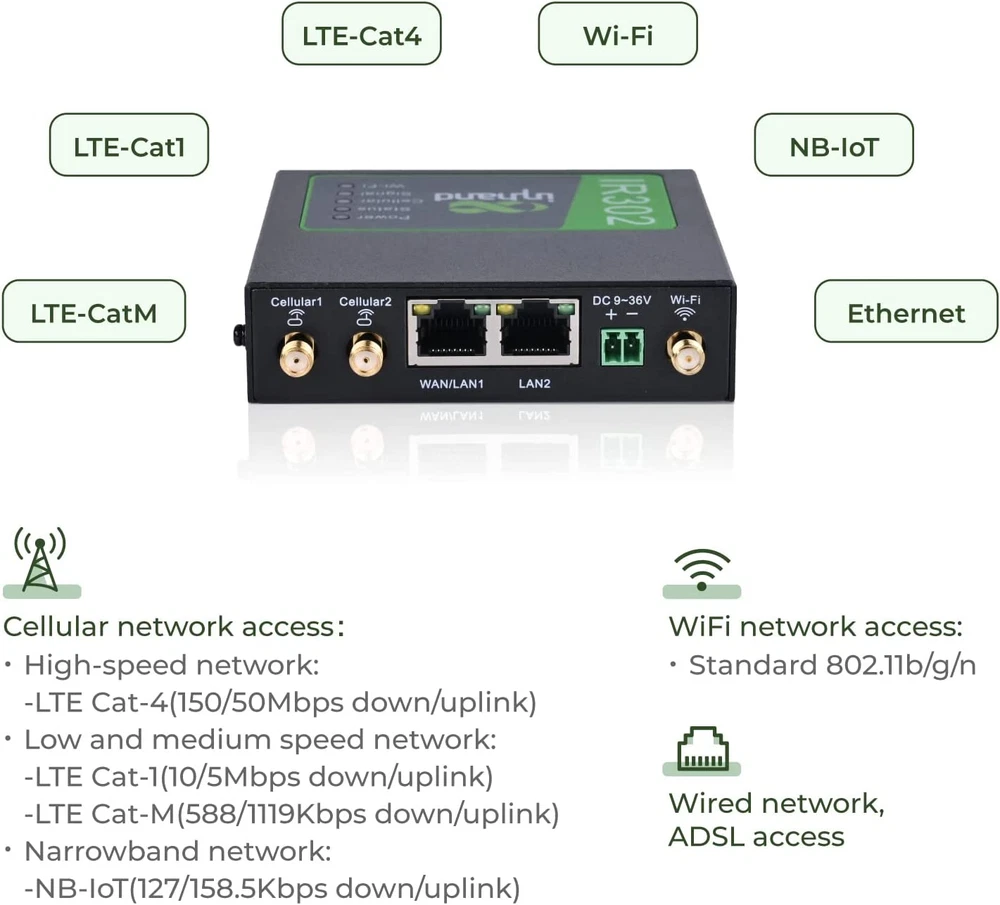 IR302 Industrial IoT 4G LTE VPN Cellular Router LTE Cat 4+ Wi-Fi Dual sim Card 4G LTE Router: working band: LTE CAT4, FDD: B2/ B4/ B5/ B12/ B13/ B14/ B66/ B71, WCDMA: B2/ B4/ B5; Dual sim card slot, use this cellular router with any mobile carriers that using the same frequency bands; Equipped with complete functions, it is applied in various industries and applications, suitable for family, business, outdoor, industry. Industrial Design & Wide Coverage: Industrial rugged metal casing, compact size for mass deployment; Transmission Distance can reach to 80 meters; Featuring both panel and DIN-rail installation.Working Temperature -4 ℉ to 158 ℉ (-20 to 70℃), Working Voltage DC 9V to 36V, works well even in harsh environments Multiple Means for Internet Access: Available with wired network access, high speed LTE CAT4 and Wi-Fi connection. One LAN port, one WAN/LAN switchable port and Wi-Fi access. Support multiple WAN access methods, including PPP、PPPoE、DHCP ; Supports WIFI, Compatible with 802.11b/g/n, AP, Client and WDS modes The IR300 is a compact M2M LTE router integrating 4G LTE, Wi-Fi, and VPN technologies. Strong Security Protection: Supports VPN, firewall and user authorization management. Strong security measures for data transmission, network and device access. -Firewall Protections: Stateful Packet Inspection (SPI), DoS attack defense; Multicast filter/Ping probe packet, Access Control List (ACL); Content URL filter, port mapping, virtual IP mapping, IP-MAC binding; - Data Security, OPENVPN protocols, Supports CA digital certificate. High Reliability & Efficient Remote management: Watchdog and multi-layer link detection mechanisms ,automatic redial and recovery; Dual-SIM failover; VRRP mechanism for backup; Failover between wired, cellular LTE networks and Wi-Fi. With InHand Device Manager cloud platform. Shipping We offer FREE shipping on all orders! We ship within Three business days of payment, usually sooner. We use a selection of shipping services such as UPS, FedEx, USPS etc. We only ship to the lower 48 states, no APO/FPO addresses or PO Boxes allowed. Local pickups and combined shipping options are not provided at this time. Returns and payment You can return a product for up to 30 days from the date you purchased it. Any product you return must be in the same condition you received it and in the original packaging. Please keep the receipt. We allow only PayPal as payment method FeedBack Your feedback very important to us, after you get your package and you are satisfied with our service please leave us positive feedback If you have any problem with your order / any questions please before leave any type of feedback For any questions, using eBay contact system Please visit our eBay store to check out other items for sale! Thank you for shopping at our store.