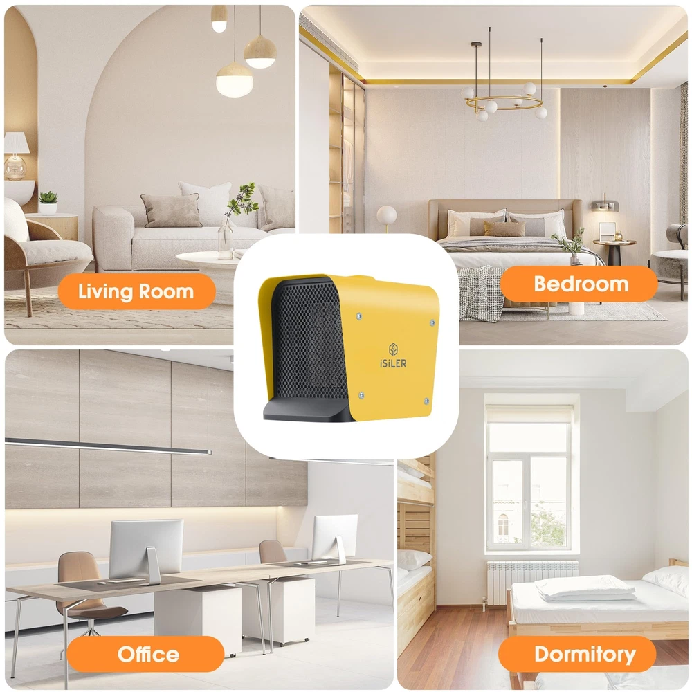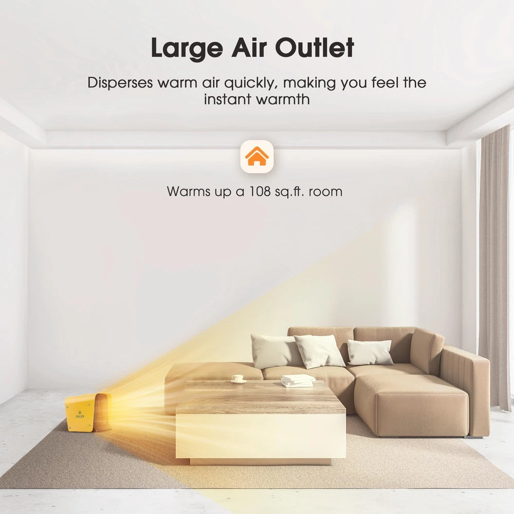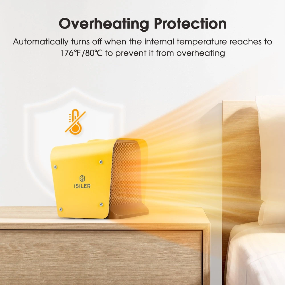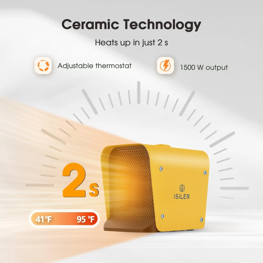 SAFE & RELIABLE: This small space heater made from fire-retardant materials; The ceramic heater has a self-regulating element and automatic overheating protection for added safety. Tip-Over Protection will shut off the room heater if it gets knocked over accidentally to avoid accident happens. It will automatically shut it off if the temperature exceeds the limit value and back to work once it gets to a safe temperature inside. ADJUSTABLE THERMOSTAT CONTROL: Features a temperature range of 41 °F-95 °F; Rotate the thermostat control dial to lower the temperature once the room is warm, this ceramic heater will greatly reduce power consumption. INSTANT WARM-UP: The small space heater heats up a room within seconds thanks to its 1,500 W output, reliable ceramic heating elements and large air outlet; Distributes warm air evenly around a large area of up to 108 sq. ft.; The space heater suitable for living rooms, dressing rooms, bedrooms, studies, offices and more. COMPACT, PORTABLE & CONVENIENT: The space heater only measures 6.7 in x 6.4 in x 6.2 in and weighs in at just 42.3 oz; The light weight and ergonomic handle allow for easy transportation. IMPORTANT SAFETY NOTICES: Please note these for safety: 1. To avoid burns, do not let bare skin touch hot surfaces. 2. Do not use the heater outdoors. 3. In order to avoid overheating, do not cover the heater. 4. Do not use the heater in the immediate surroundings of a bath, a shower or a swimming pool. If you want to use the heater in the bathroom, please use it when the bathroom is dry and avoid the heater/plug splashed water!