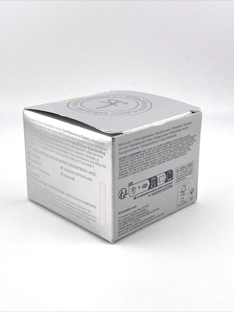 T Cosmetics Confidence In A Cream Anti-Aging Armour - 2 oz Condition : Brand New, Sealed Product Overview : IT Cosmetics Confidence In A Cream Anti-Aging Armour is a multi-tasking moisturizer that works to improve the look of skin’s firmness, elasticity, and radiance while delivering long-lasting hydration. This anti-aging moisturizer is formulated with a blend of powerful ingredients to provide a boost in skin’s moisture while visibly reducing the appearance of fine lines and wrinkles. Key Benefits : Reduces the look of fine lines, wrinkles, and pores Visibly firms and lifts the skin Delivers intense hydration for soft, supple skin Promotes a brighter, more even complexion Key Ingredients : Collagen : Helps improve skin elasticity and firmness Peptides : Support natural collagen production to reduce the look of wrinkles Hyaluronic Acid : Provides deep hydration, plumping the skin Antioxidants : Protect the skin from environmental stressors Ceramides : Strengthen and restore the skin’s moisture barrier Size : 2 oz / 60 ml (Perfect for travel or daily use) How to Use : Apply to clean skin in the morning and evening. Smooth gently onto face, neck, and décolleté using upward motions. Perfect for : Ideal for those looking for a potent anti-aging moisturizer that provides hydration and targets multiple signs of aging, including wrinkles and skin firmness. This IT Cosmetics Confidence In A Cream Anti-Aging Armour in a 2 oz jar is a great addition to your skincare routine for maintaining youthful, hydrated skin.