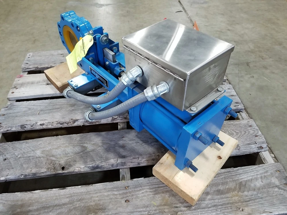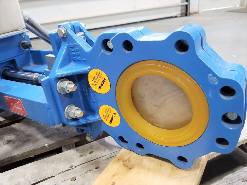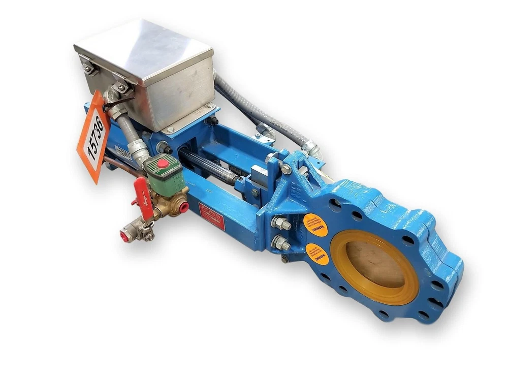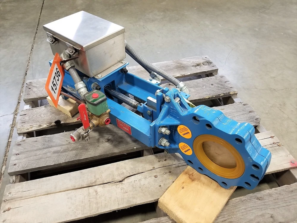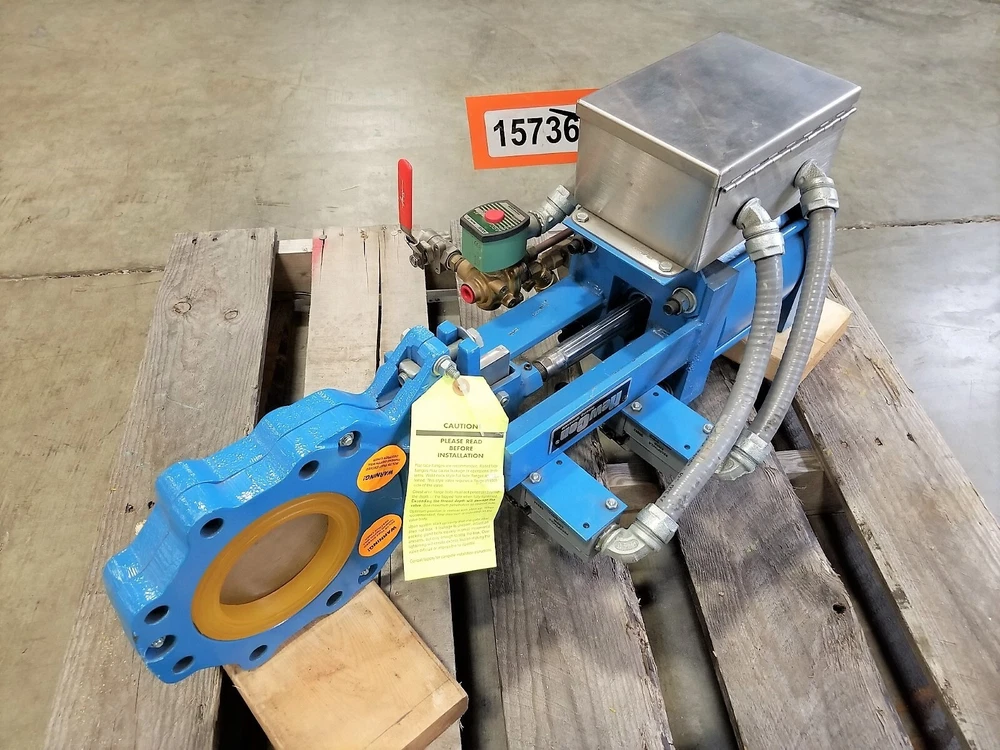 ITEM 15736: 4" Newcon Knife Gate Valve - Automated [UNUSED!] Threaded lug conection. Rated for 150PSI @ 200°F. Includes stainless steel enclosure, control valve, and proximity switches. Demonstration video available. Valve weight: 108 LBS PRICE FOB WV………….. $ 1 ,667 .00