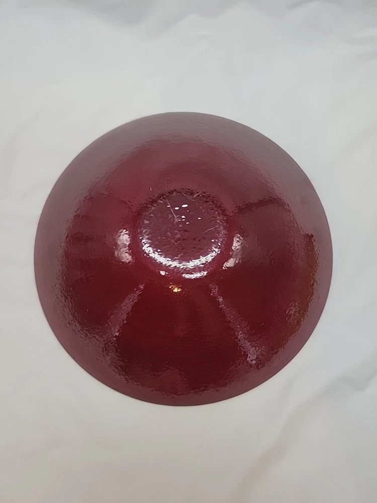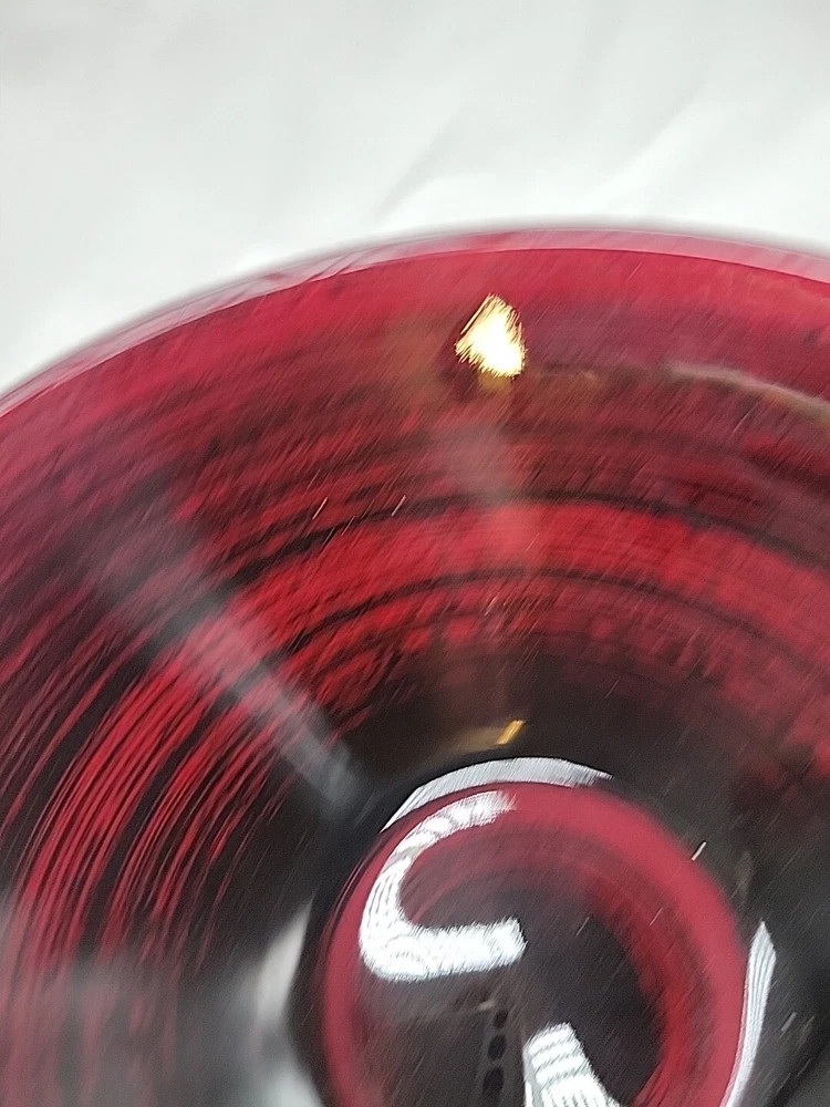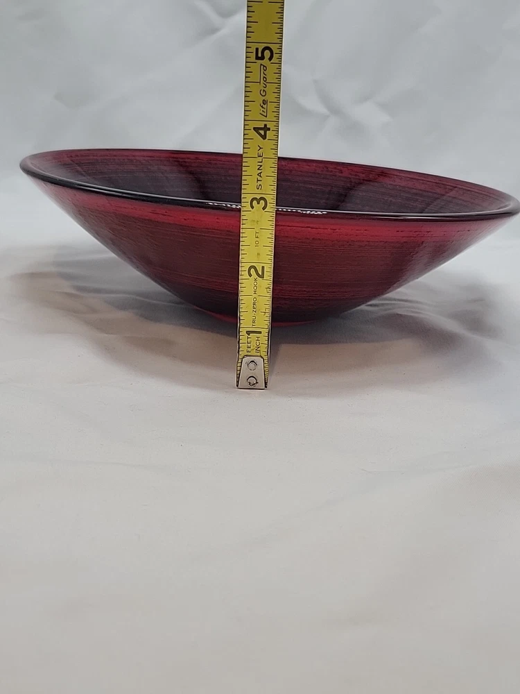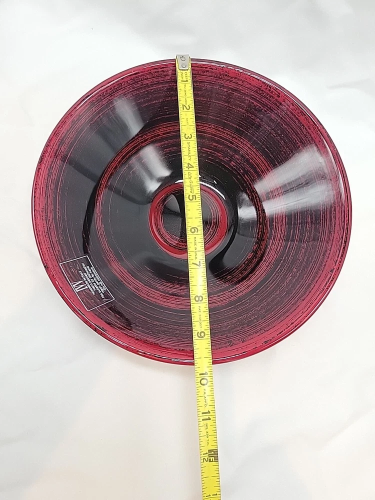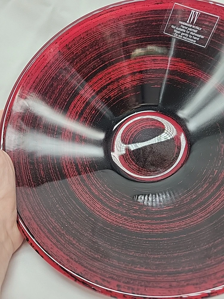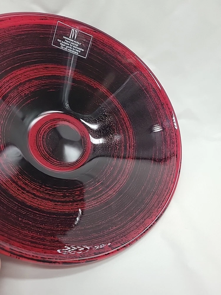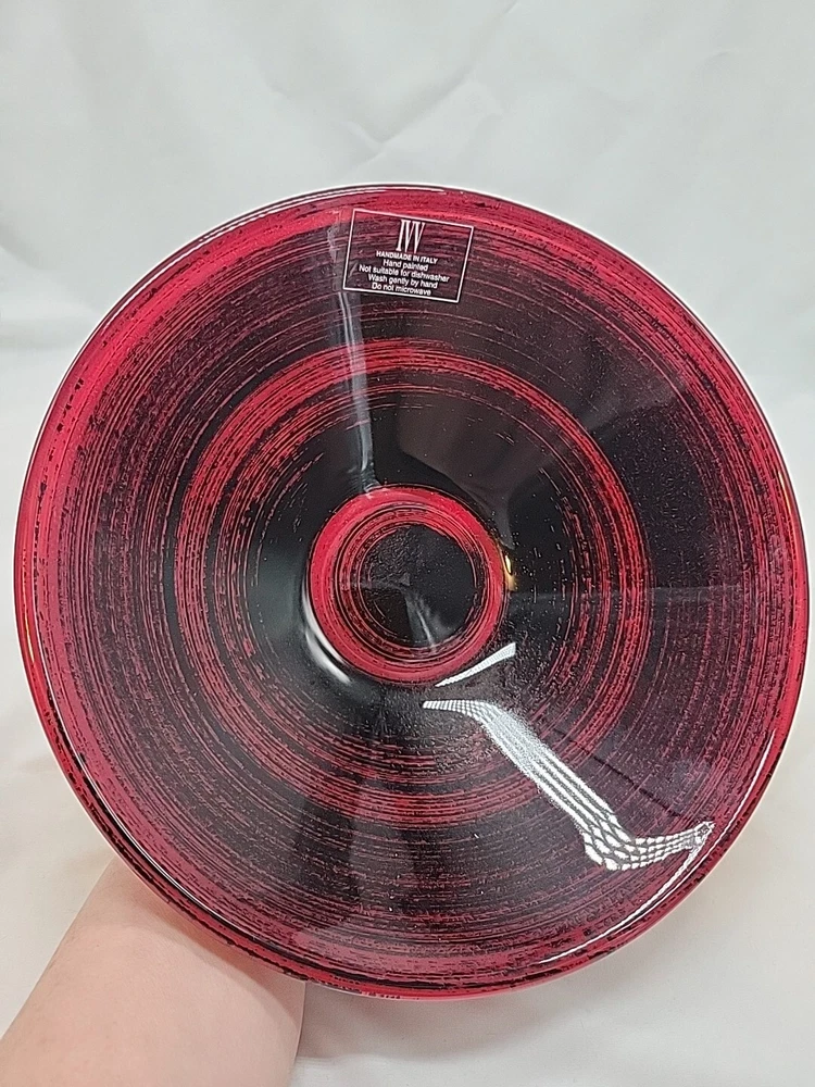This IVV Handmade in Italy decorative bowl is a beautiful red and black art glass piece. The round bowl features an all-over pattern with a glossy finish, perfect for all occasions. The bowl is 3 inches in height and 9.75 inches wide, weighing 1 lb 14 oz. Hand wash only. Made from glass, it adds a touch of beauty to any space with its artistic production style from Italy.