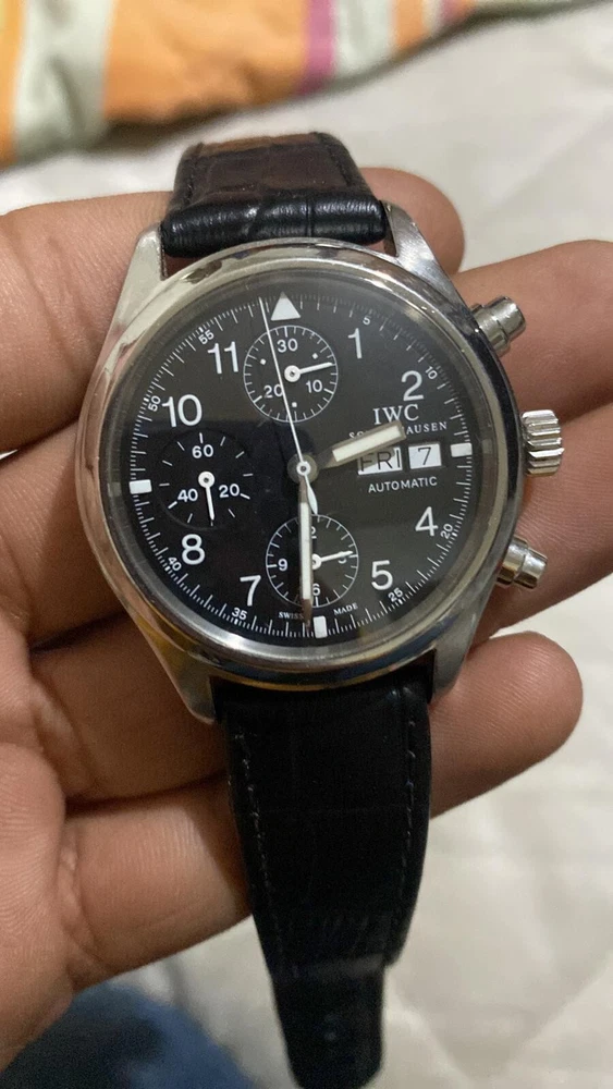 Introducing the IWC The Pilot's Chronograph Men's Watch, Automatic, Day/Date - Ref. 3706 Uesd. This remarkable timepiece boasts a mechanical (automatic) movement, making it a reliable choice for any occasion. Its water resistance capability of up to 3 m (0.3 ATM) makes it suitable for use while diving or other water activities. The watch was manufactured between 1980-1989 in Switzerland by IWC, a renowned brand in the watch industry. It features an alarm and chronograph, making it a versatile tool for aviation and other industries. The stainless steel case and black leather band give it a sleek and sophisticated look, perfect for any style-conscious man.