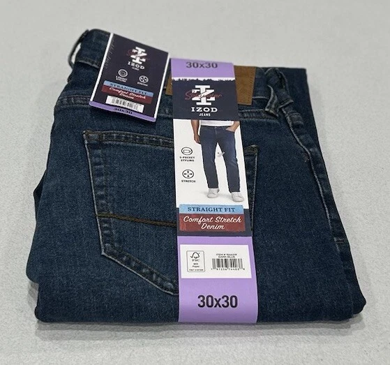 IZOD Men's Straight Fit Comfort Stretch Denim Jeans Stained (See the Pictures Please) Size: 30X30 Color: Dark Blue Content: 68% Cotton / 26% Polyester / 4% Other Fiber / 2 % Spandex