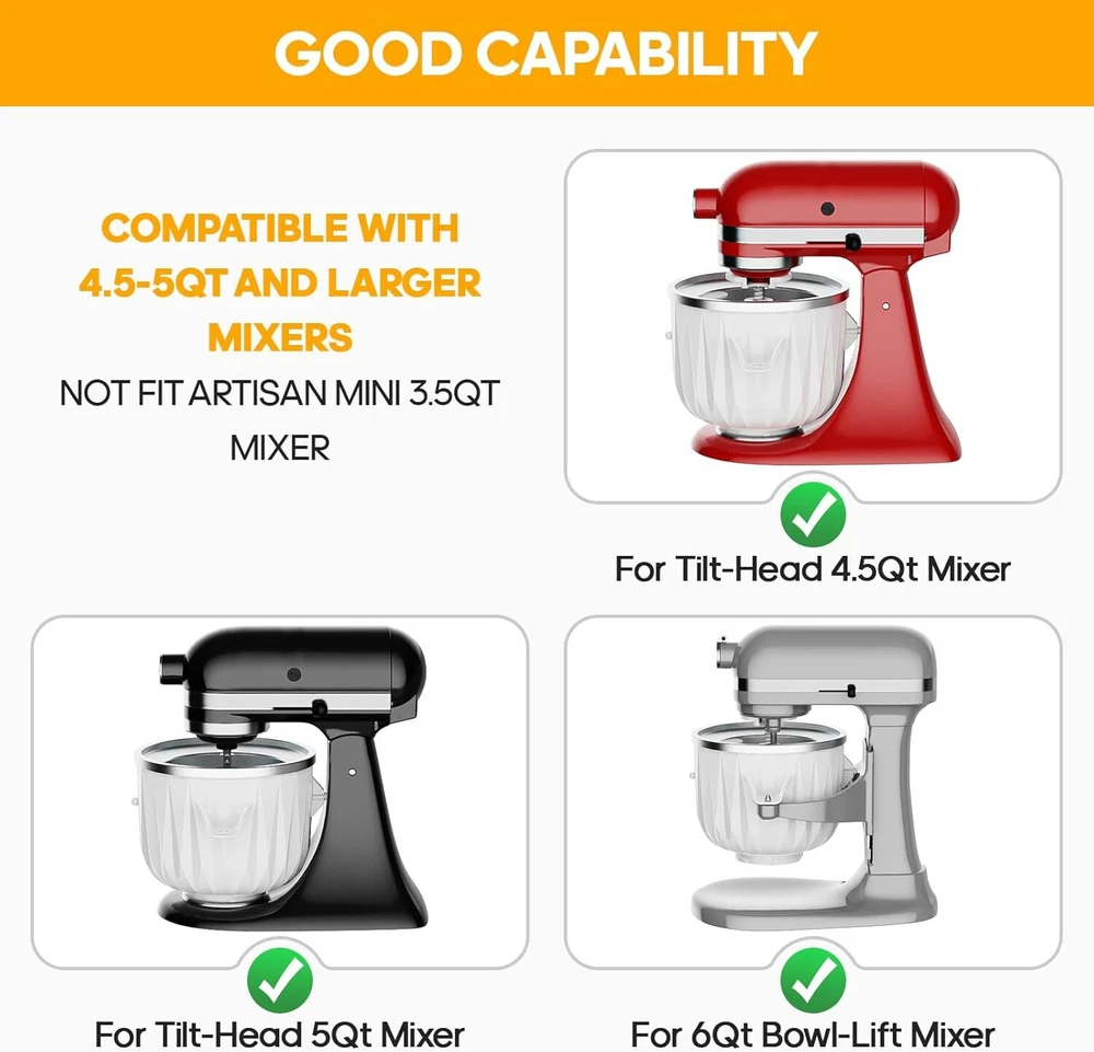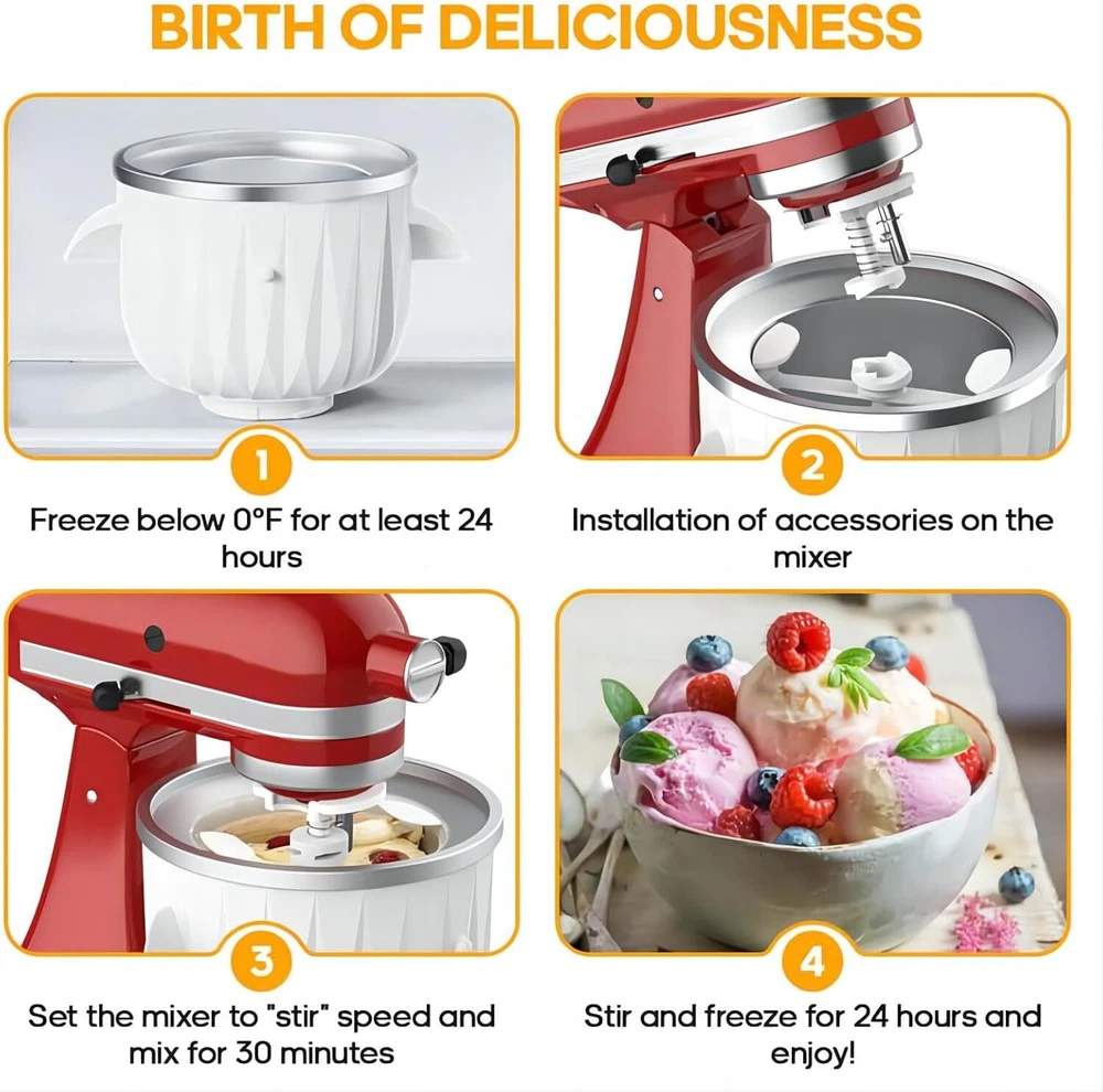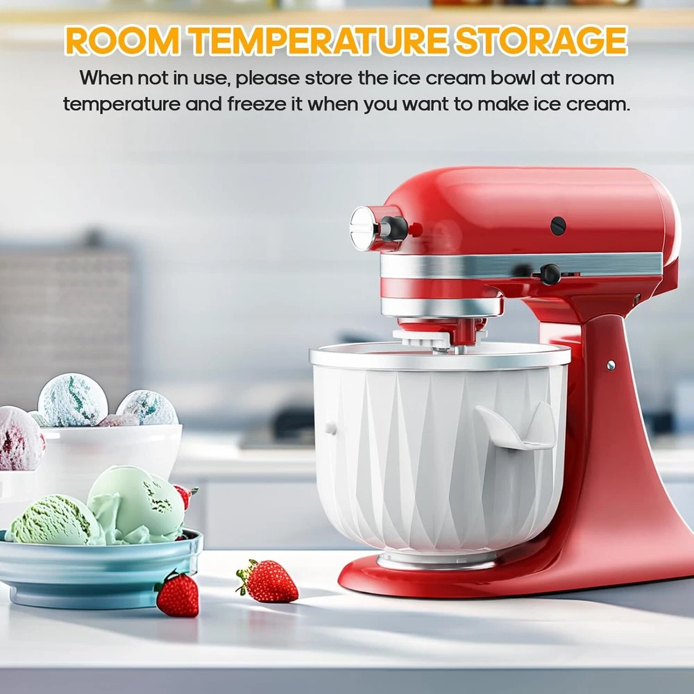 Menu Other Items Feedbacks About Us Contact Us Add To Favorites Ice Cream Maker Attachment for Kitchenaid Stand Mixers, Bowl for 4.5QT and Larger Kitchenaid Stand Mixers, 2 Quart Frozen Yogurt, Ice Cream, and Sorbet Gelato Maker by Perfect Fit:This kitchenaid ice cream maker attachment works perfectly for 4.5QT and larger capacity kitchenaid stand mixers, whether your mixer is tilt-head or bowl-lift. Note that this kitchenaid ice cream attachment does not work with the 3.5 QT Artisan Mini models of the kitchenAid mixer - KSM3316 and KSM3317. Multi-functional:The kitchen aid ice cream attachment for kitchenaid stand mixer is able to make you a wide range of cool and refreshing treats, such as the ability to make 2 quarts of ice cream, frozen yogurt, juice sorbet and gelato. Please note that before using this kitchen aid ice cream attachment, you need to freeze this kitchen aid mixers attachment for 24 hours until the liquid in the ice cream bowl is completely solidified. Food Grade Material:The inner liner of this kitchenaid mixer attachments is made of aluminum alloy and the plastic shell is made of PVC material, these two food-grade materials ensure that this kitchenaid attachments won't leak and break even after a long period of time, but it is important to note that you shouldn't use a metal spatula or metal utensils to scoop the ice cream as this will damage the inside of the freezer bowl. Cleaning and Storage: the ice cream maker kitchen aid contains crusher and drive assembly parts. the crusher and drive assembly parts can be washed in a dishwasher, but the ice cream bowl can only be washed manually with warm or cool water. The ice cream bowl must be thoroughly dried before it can be placed in the freezer. If you do not intend to use the ice cream bowl, it is recommended that you store the ice cream bowl at room temperature. Product Description Safe Cleaning Brushes and drive assembly are dishwasher safe, while freezer bowls are handwash only. Safe Storage The ice cream bowl and its components need to be cleaned after use to prevent the ice cream from solidifying and adhering to the bowl and other components. Drain after cleaning and store at room temperature. What is the capacity of the Kitchenaid stand mixer ice cream attachment? The Kitchenaid stand mixer ice cream attachment 2qt large capacity for your use Does this Ice Cream Attachment for KitchenAid Stand Mixer work with all models of kitchenaid mixers as well as others? Compatible to Fit Most Kitchenaid Tilt-Head Mixer and Bowl-Lift Mixer, NOT Fit Kitchenaid Artisan Mini 3.5QT Mixer Can I use this ice cream attachment for KitchenAid Stand Mixer directly without refrigeration? No. For best results, store the Freeze Bowl in the back of your freezer where the temperature is coldest for at least 16 hours. Item Specification Color WHITE Material Silicone, Plastic Included Components 1 x Dasher (Dishwasher Safe), 1 x Drive Assembly Package Dimensions 10.35 x 10.24 x 7.76 inches Product Care Instructions Dishwasher Safe, Hand Wash Shipping FREE FREE SHIPPING We are always working hard to ensure your package arrives as soon as possible. Please understand that some factors like weather, high postal traffic, and the performance of shipping companies are outside of our control. We offer free shipping to the lower 48 states. We do not accept P.O. Boxes. Please provide a physical address. If you have a problem or question regarding your transaction please contact us immediately. We will work with you to resolve any problem you may have. Thank you
