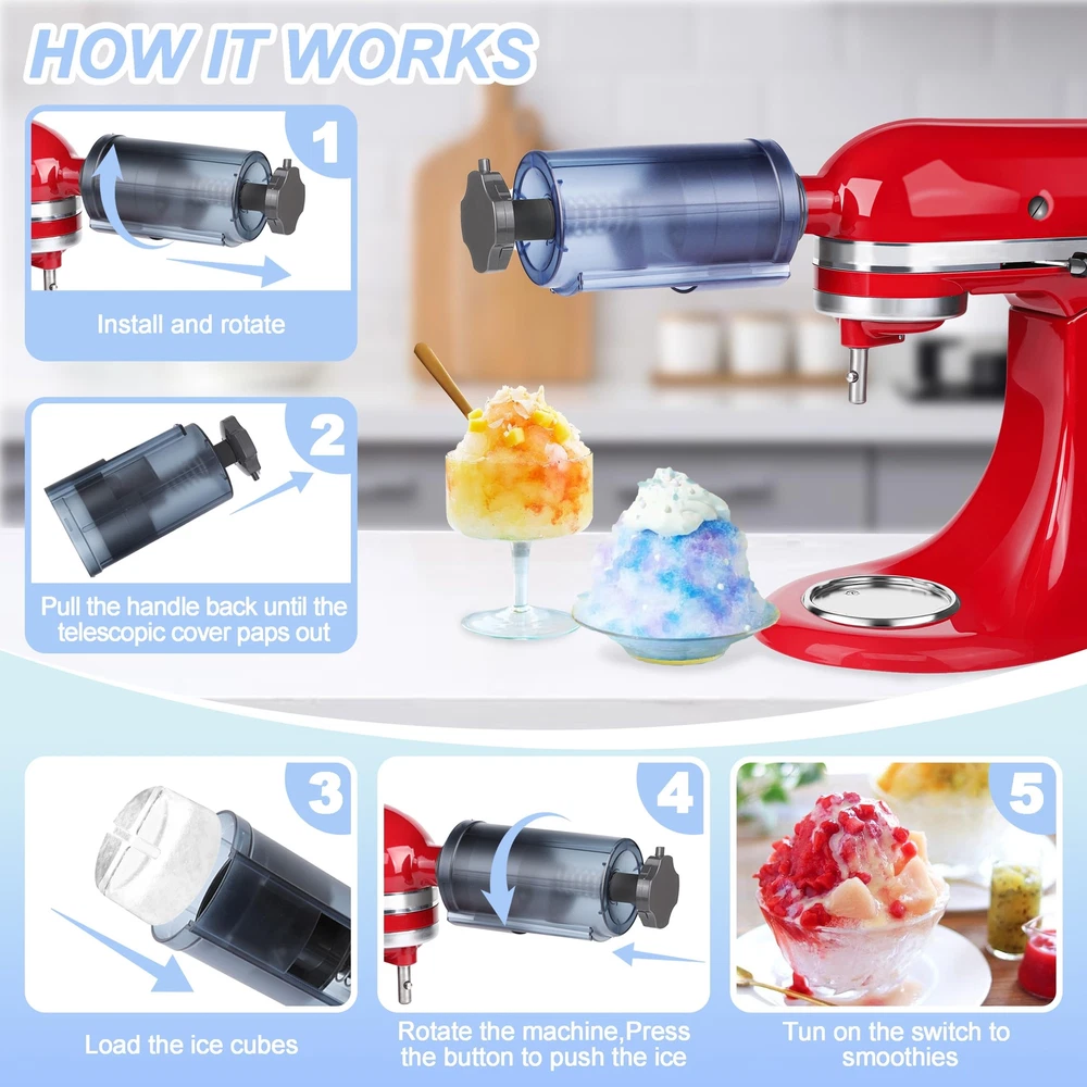 ๐๐ซ๐๐ง๐ฌ๐๐จ๐ซ๐ฆ ๐๐จ๐ฎ๐ซ ๐๐ข๐ฑ๐๐ซ ๐๐ง๐ญ๐จ ๐๐ง ๐๐๐ ๐๐๐ซ๐๐๐ข๐ฌ๐: Upgrade your KitchenAid stand mixer with our shave ice attachment. Crafted specifically for all KitchenAid models, this shaved ice attachment for KitchenAid mixer lets you effortlessly create light, fluffy, and refreshingly cool shaved ice. ๐๐ข๐ ๐ก-๐๐๐๐ข๐๐ข๐๐ง๐๐ฒ ๐๐๐ ๐๐ก๐๐ฏ๐ข๐ง๐ : Enjoy the efficiency at its finest! With our KitchenAid ice maker attachment, swiftly churn out heaps of shaved ice for any occasion. Whether it's a small pool party, a festive barbecue, or a cozy dinner gathering, stay prepped for all - thanks to the large quantity producing capacity of our 8 ice molds. ๐๐ฎ๐ฌ๐ญ๐จ๐ฆ๐ข๐ณ๐๐๐ฅ๐ ๐๐๐ฅ๐ข๐ ๐ก๐ญ:The KitchenAid ice shaver attachment opens a world of flavorful icy treats to you. Experiment with snowflake-style shaved ice recipes using a plethora of fresh ingredients like water, juice, or dairy. Add your favorite syrups, or venture out making margaritas, slushies, granitas, iced coffee, and more! ๐๐ฎ๐๐ฅ๐ข๐ญ๐ฒ ๐๐จ๐ฎ ๐๐๐ง ๐๐ซ๐ฎ๐ฌ๐ญ:When it comes to durability, the KitchenAid ice shaver attachment for KitchenAid stand mixer stands strong. Engineered from high-quality materials, this accessory is designed to withstand continuous use, while ensuring an extraordinary performance. ๐๐๐ฅ๐ข๐๐๐ฅ๐ ๐๐ฎ๐ฌ๐ญ๐จ๐ฆ๐๐ซ ๐๐๐ซ๐ฏ๐ข๐๐ ๐๐๐๐๐ฒ ๐ญ๐จ ๐๐ฌ๐ฌ๐ข๐ฌ๐ญ ๐๐จ๐ฎ: We believe in not just selling products, but also in building lasting relationships with our customers. Our team of experts is just a click away to address any queries or concerns you may have regarding your shave ice attachment for KitchenAid. Your satisfaction is our priority, and we are committed to ensuring your experience with us is as smooth as the shaved ice our KitchenAid accessory produces.