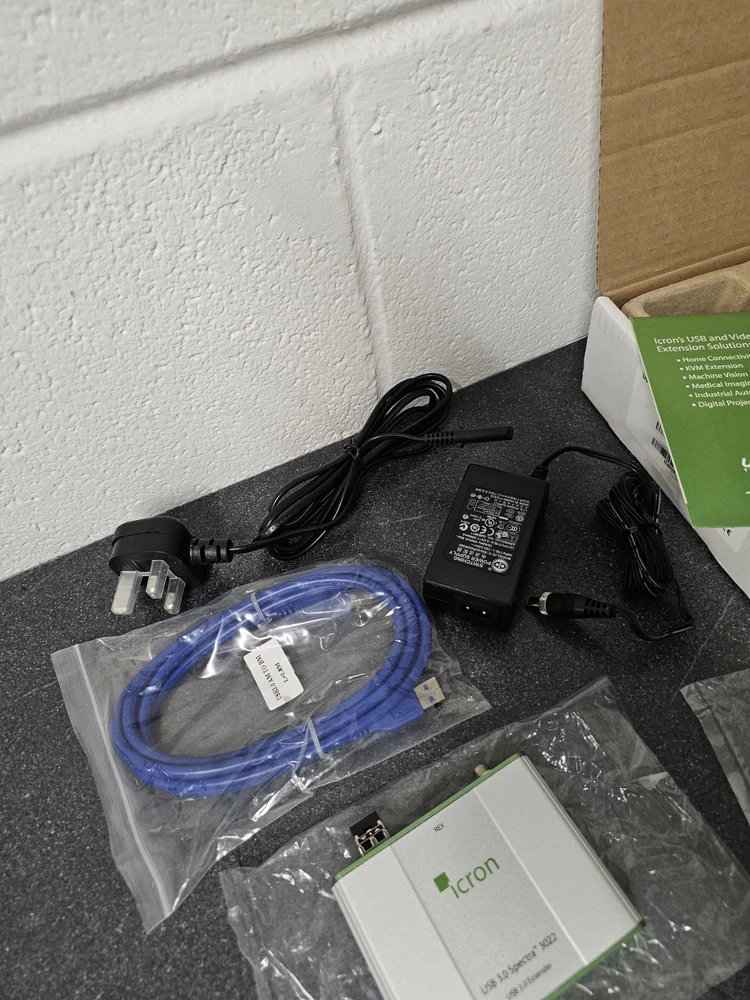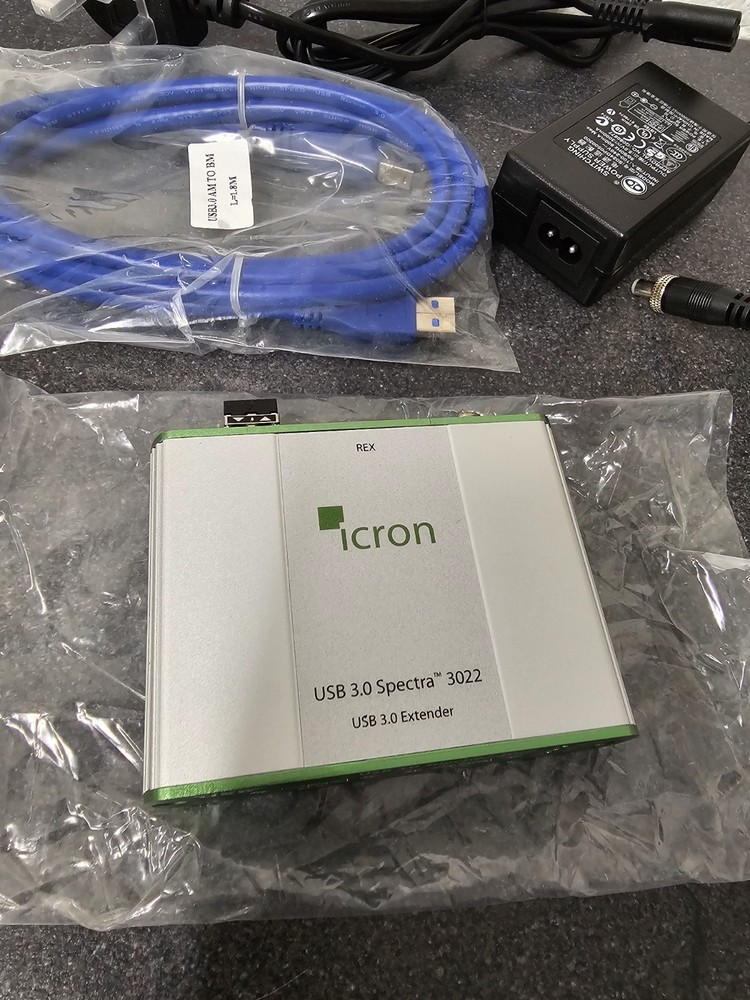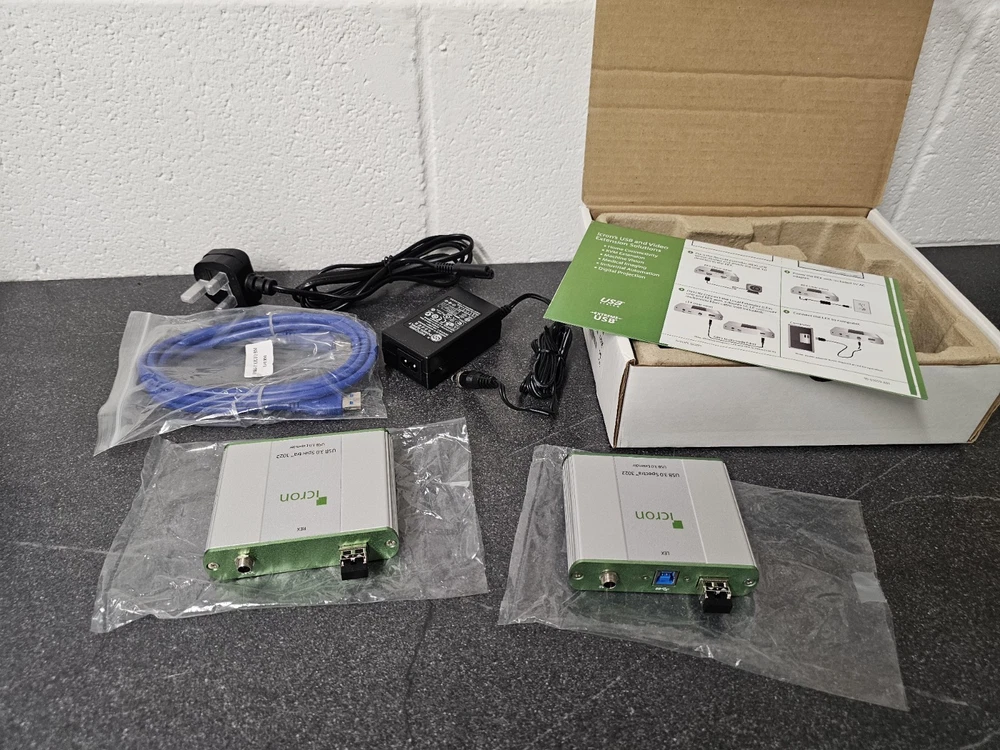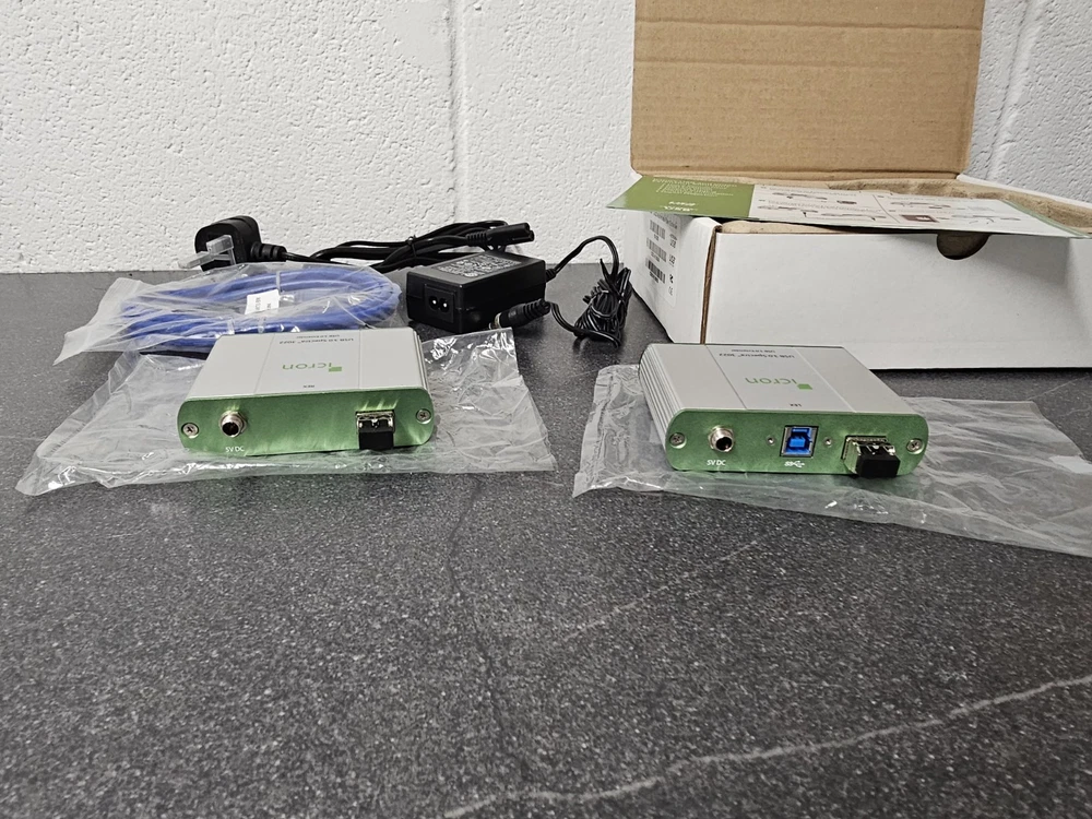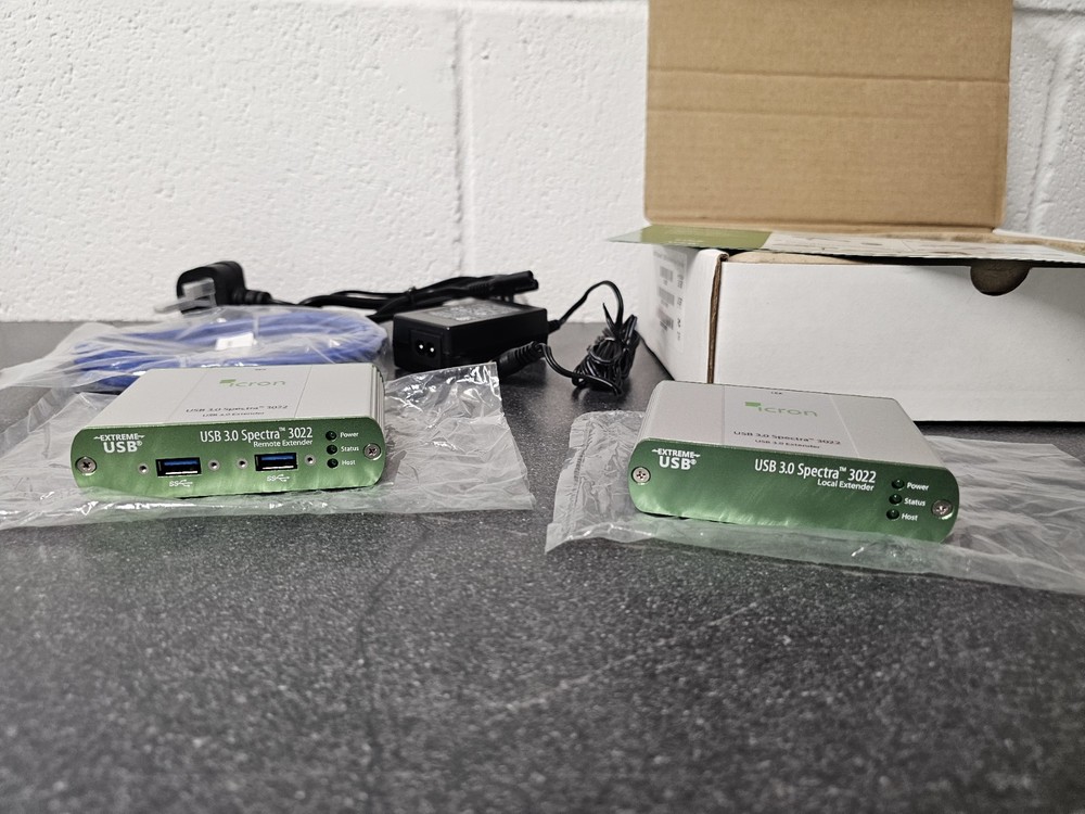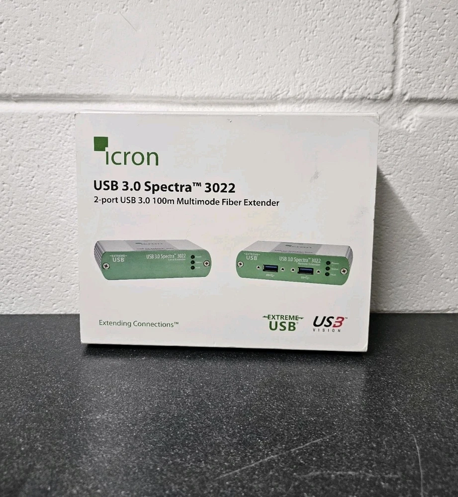 This is opened unused in new condition (tested by us) The box has some shelf ware Description The Icron's Spectra 3022 is a USB 3.0 SuperSpeed extender that can reach up to 100m over a multi-mode fibre cable. Compatible with USB 3.0 at 5Gbps throughput speeds True Plug-and-Play capability, ready to operate right out of the box Supports USB 3.0 throughputs of up to 5 Gbps Delivers speed, isolation, and security over multimode fibre. Integrated 2-port hub suitable for industrial environments The USB 3.0 Spectra 3022 is a two-port USB 3.0 SuperSpeed extension solution, enabling USB 3.0 connections at up to 5 Gbps over 100m/330ft of multimode fiber optic cable. The Spectra 3022 features two locking USB 3.0 ports delivering 900mA power to each port perfectly suited for USB3 Vision camera applications. Fast dispatch Thanks for looking.