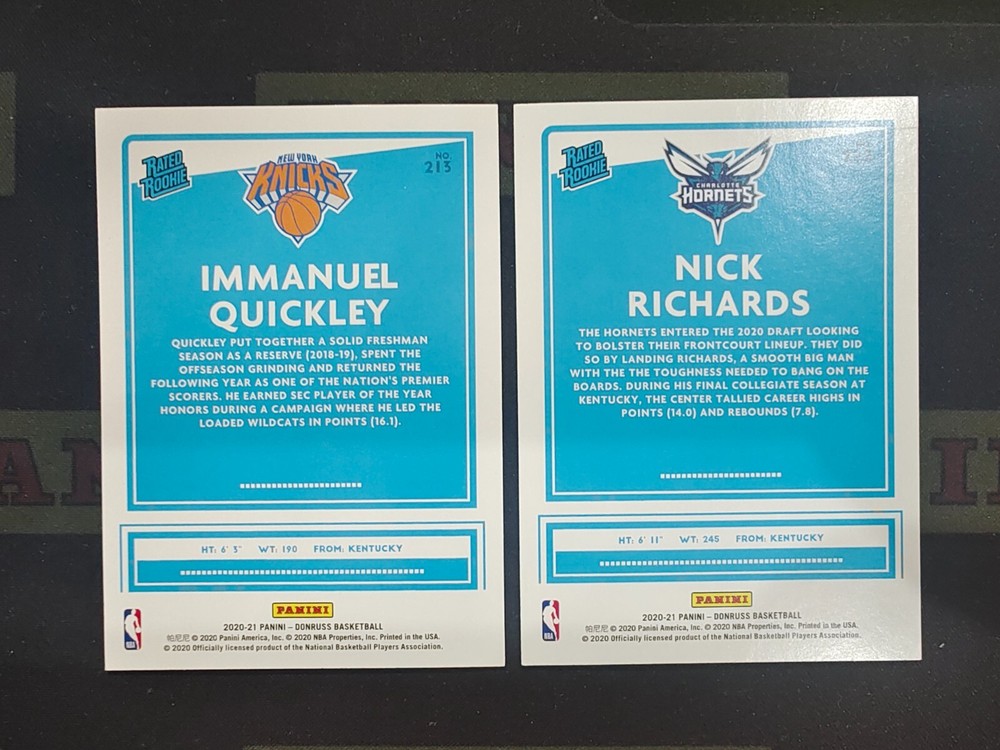 League: National Basketball Association (NBA) Player/Athlete: Immanuel Quickley, Nick Richards Sport: Basketball Autographed: No Type: Sports Trading Card Country/Region of Manufacture: United States Card Size: Standard Number of Cards: 2 Season: 2020-21 Year Manufactured: 2021 Features: Rookie Language: English Set: 2020-21 Panini Donruss Manufacturer: Panini