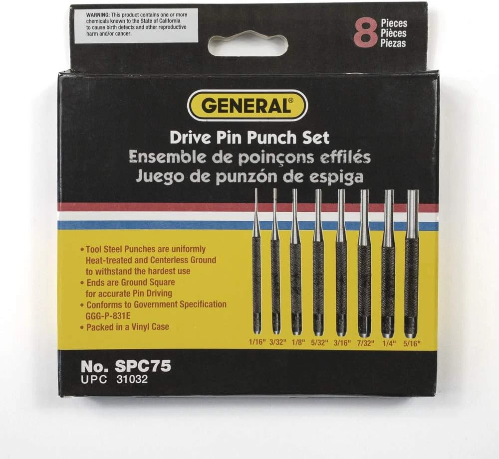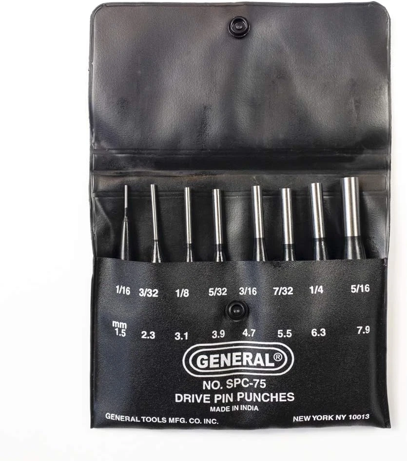 SPC75 Drive Pin Punches Impact-Resistant Compact Portable Precision Engineering General Tools SPC75 Drive Pin Punches, Set of 8 , Grey Product Description: The General Tools SPC75 Drive Pin Punch Set includes 8 high-quality pin punches designed for precision work in various applications. These tools are perfect for removing pins, fasteners, and other small components with ease and accuracy. The set is ideal for automotive, machinery, and general repair work, providing the durability and reliability needed for long-lasting use. Features: Set of 8 Punches – This set includes 8 different sizes of drive pin punches, providing a range of options for various pin removal tasks. Durable Construction – Made from high-quality steel, these pin punches are built to withstand heavy use and maintain their shape over time. Grey Finish – The grey finish offers a professional look while also helping to resist corrosion and wear. Precision Engineering – Designed for accuracy, these punches allow for precise pin removal with minimal damage to surrounding materials. Ergonomic Handle – The punches feature ergonomic handles that provide a secure and comfortable grip for added control and reduced hand fatigue. Versatile Application – Ideal for use in automotive repair, machinery maintenance, and other mechanical tasks that require pin removal. Impact-Resistant – These punches are designed to handle high-impact strikes, making them perfect for tackling tough tasks. Compact and Portable – The set is compact and easy to store, making it convenient to carry and access for quick jobs. Part Number SPC75 Style Drive Pin Size Set of 8 Power Source Hand Powered Item Package Quantity 1 Color Grey Product Dimensions 5.25 x 5.13 x 0.75 inches Material Hardened tool steel Batteries Required? No Item Weight 0.01 ounces Batteries Included? No Number Of Pieces 8 Included Components Set contains 8 punches, one of each size (1/16, 3/32, 1/8, 5/32, 3/16, 7/32, 1/4, and 5/16 inch) Shipping Fast shipping is very important for us. Our standard USA shipping service is FREE. Your order will be shipped within 1-2 business days upon full payment received. Your order will be delivered within 1-3 business days after the handling time. We only ship to the confirmed address. We reserve the right to cancel any order for any reason at any time. We are not responsible for undeliverable addresses. Returns and payment We offer a 30 days return policy from checkout winning date. FeedBack Your feedback very important to us, after you get your package and you are satisfied with our service please leave us positive feedback If you have any problem with your order / any questions please before leave any type of feedback For any questions, using eBay contact system Please visit our eBay store to check out other items for sale! Thank you for shopping at our store.