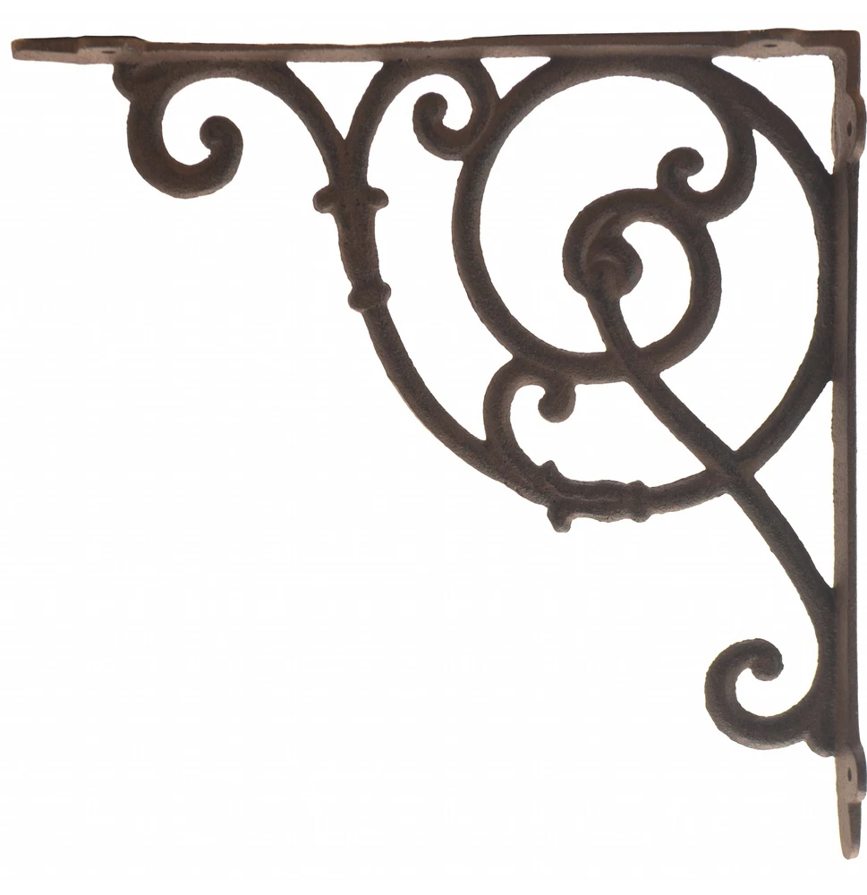 This Ornate Curly Vine Pattern Cast Iron Shelf Bracket can be used to Craft DIY Custom Shelves, hold up mailboxes or in the corner of doorways as decorations. This new brace is 10" Deep and features an Antique Style with a Distressed Brown Coloring that adds to it's rustic vintage appeal. Single 10" Deep Shelf Bracket With Ornate Curly Vine pattern Sturdy Cast Iron Design With Distressed Brown Color For Rustic Vintage Look Fun DIY Shelf Crafting Project Combine Shelf Brackets To Make Shelves The Specific Length You Desire A Single Brace Adds Decorative Appeal As A Mailbox Mount