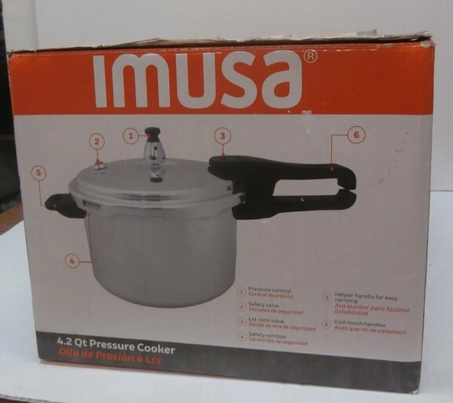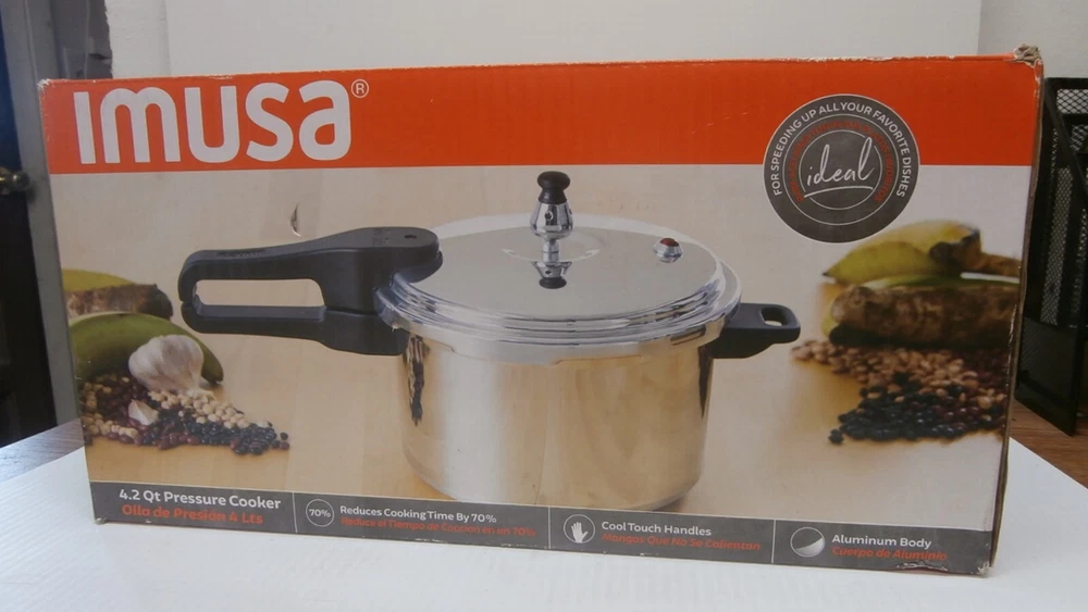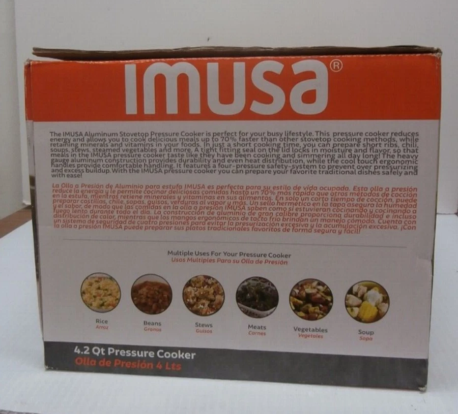 You are bidding on: Imusa 4.2Qt Stovetop Aluminum Pressure Cooker with Safety Regulator Distribution Description Condition: open box, used once This is a Imusa 4.2Qt Stovetop Aluminum Pressure Cooker with Safety Regulator Distribution The IMUSA aluminum stovetop pressure cooker model number A417-80401 is perfect for your busy lifestyle. Pressure cookers speed up cooking time by 70%, retain more minerals and vitamins, reduce energy and heat while cooking, and are easy to clean up! The unit traps steam inside, which builds up pressure to create hotter temperatures, and its tight seal locks in heat, moisture, and flavor. Use your IMUSA pressure cooker for beans, soups, chili, poultry, and other one-dish entrees. You’re about to experience a better, faster, and healthier way of cooking! The pressure cookers features stay-cool Bakelite handles with Helper Handle on the opposite side which is perfect for Easy Transport and Maneuvering. It also features a Safety Locking Lid that locks the pressure until all the steam is released to avoid accidents. This pressure cooker is ideal for beans, soups, chili, poultry, and other one-dish entrees. You will love the speed and amazing taste of all your meals. The New IMUSA Pressure Cooker model A417-80401 is Made of Durable Polished Aluminum Cool Touch Handles with Safety Locking Lid Even Heat Distribution and Easy to Use and Clean Easy to Use and Clean The Pressure Cookers will Speed Up Cooking Time by 70% Ideal for Beans, Meats, Vegetables, Soups and More ***************************************************************************************************** PLEASE READ: I buy mostly estates, close outs, shelf pulls, and auction items. As the history of the item is not always known. I will describe all of my items listed to the best of my ability, if there are any flaws to the item it will be noted in the listing and photos of the flaw shown. At times I may miss a flaw, as I am only human. Please contact me and I will make it right and make sure that you are happy with you interaction and purchase from Big Man Tim. See photos for details and ask all questions before purchasing. "FREE SHIPPING" Thank you for shopping in my store. Check out the other items in my eBay Store! HAPPY BIDDING 113024/TM warehouse