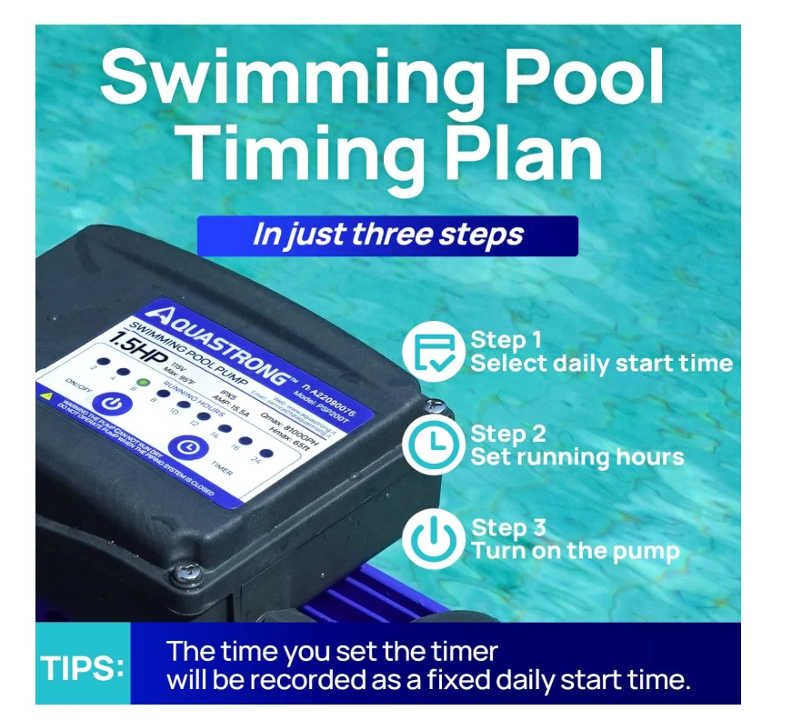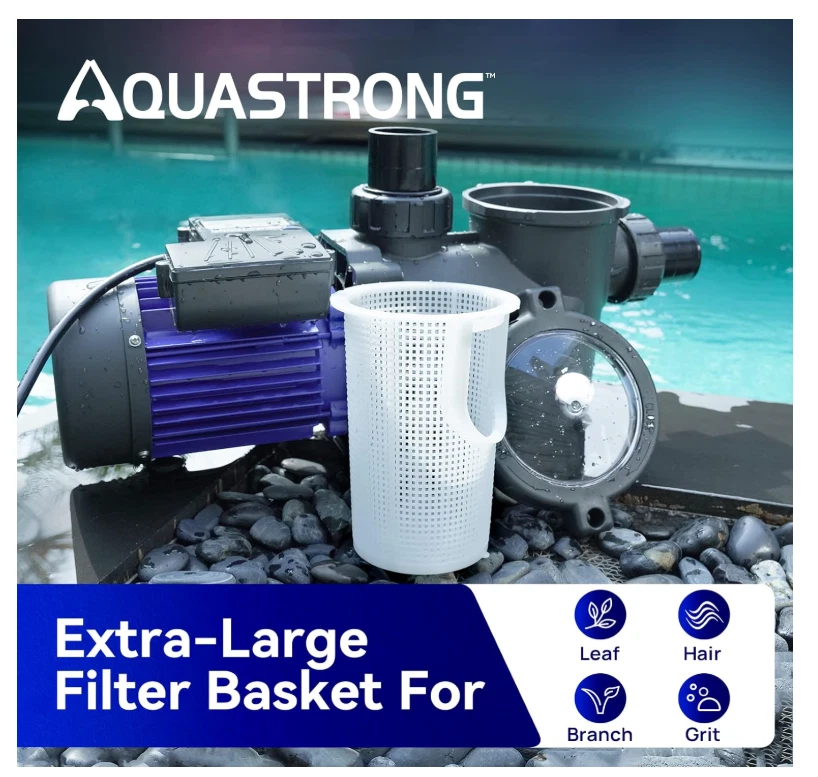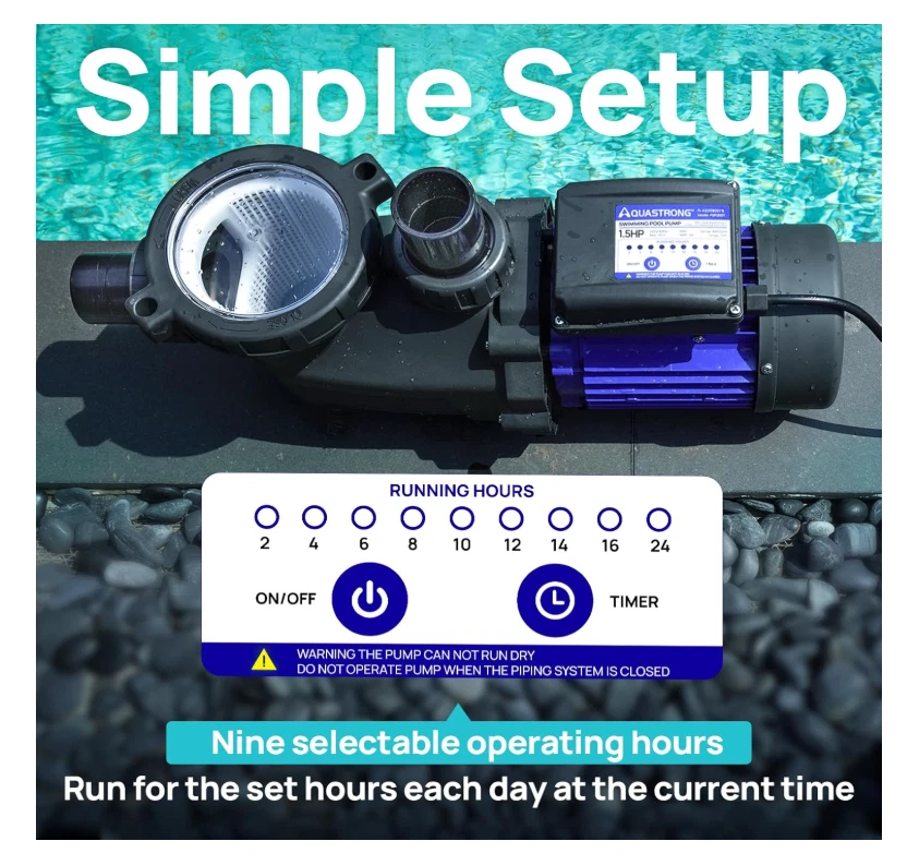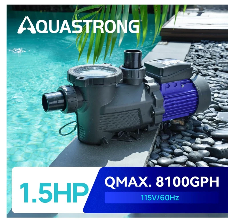Attention: The 2'' adapters MUST be mounted to the pump outlet & inlet before plumbing installation. Aquastrong product comes with a TWO-YEAR warranty to keep your water system stable and worry-free. The strong core of the swimming pool's circulation system, with MAX FLOW 8100 GPH. ETL-certified heavy-duty motor produces powerful suction with low noise, which cycles your entire pool in a short time. The 1.5 HP pool pump body is constructed with commercial-grade reinforced thermoplastic that resists corrosion, ensuring superior strength and durability. Always be reliable, energy-efficient, and quiet. Aquastrong in/above-ground pool pump continues to set the standard for value and performance. 2" ID inlet and outlet for 1-1/2" Schedule 40 PVC Pipe to ensure high flow. Check the filtration through the transparent lid at any time, and easily tell when cleaning is needed. The large filter basket can collect debris, leaves, grits, etc. 6ft cord tested for safety, performance, and compliance by UL. The 1.5HP pool pump motor with extra-large water flow ensures efficient water circulation speed, providing your family with a clean and safe swimming experience. The stable operation produces ultra-low noise, making you ignore the presence of the machine
