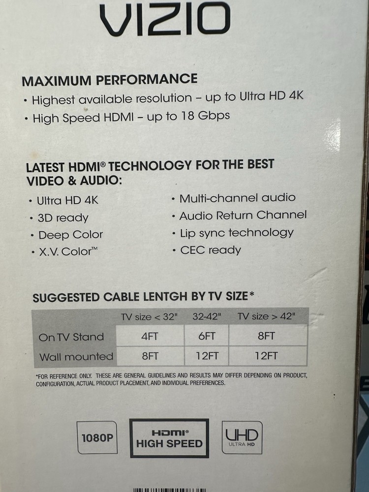 In-Box Vizio High Speed HDMI Cable 6 ft Black 6ft Premium UHD HDMI Cable