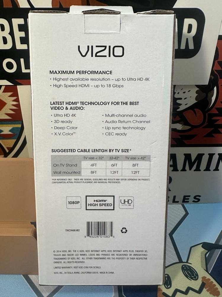 Brand:VIZIOUPC:Does not applyCountry of Origin:Chinagtin13:Does not applyOutput Voltage:naConnector(s) B:HDMI 1.4 Standard MaleConnector A:HDMI 1.4 Standard MaleColor:BlackConnector B:naMPN:TXCH6E-C2Connection Split/Duplication:naCable Length:6ft.Type:HDMI CableFeatures:na