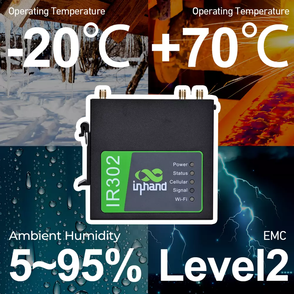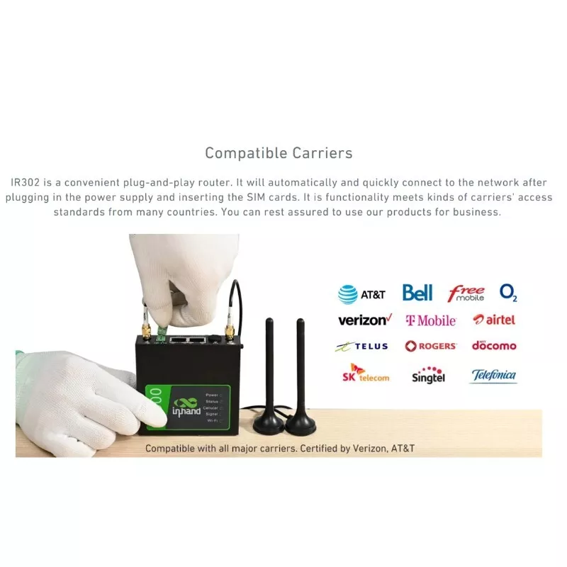 Description: 4G LTE Router: working band: LTE CAT 1, FDD: B2/ B4/ B5/ B12/ B13/ B14/ B66/ B71, WCDMA: B2/ B4/ B5; Dual sim card slot, use this cellular router with any mobile carriers that using the same frequency bands; Equipped with complete functions, it is applied in various industries and applications, suitable for family, business, outdoor, industry. This model is IR302-FQ33-WLAN, which is LTE CAT 1. LTE CAT 1 Maximum upload and download rate: 5Mbps/10Mbps. Application scenarios of LTE CAT 1: wearable devices, smart home appliances, industrial sensors, detection of hydrology and water conservancy, port logistics tracking. Shared payment class. Industrial Design & Wide Coverage: Industrial rugged metal casing, compact size for mass deployment; Transmission Distance can reach to 80 meters; Featuring both panel and DIN-rail installation.Working Temperature -4 ℉ to 158 ℉ (-20 to 70℃), Working Voltage DC 9V to 36V, works well even in harsh environments Multiple Means for Internet Access: Available with wired network access, high speed LTE CAT4 and Wi-Fi connection. One LAN port, one WAN/LAN switchable port and Wi-Fi access. Support multiple WAN access methods, including PPP、PPPoE、DHCP ; Supports WIFI, Compatible with 802.11b/g/n, AP, Client and WDS modes The IR300 is a compact M2M LTE router integrating 4G LTE, Wi-Fi, and VPN technologies. Strong Security Protection: Supports VPN, firewall and user authorization management. Strong security measures for data transmission, network and device access. -Firewall Protections: Stateful Packet Inspection (SPI), DoS attack defense; Multicast filter/Ping probe packet, Access Control List (ACL); Content URL filter, port mapping, virtual IP mapping, IP-MAC binding; - Data Security, OPENVPN protocols, Supports CA digital certificate. High Reliability & Efficient Remote management: Watchdog and multi-layer link detection mechanisms ,automatic redial and recovery; Dual-SIM failover; VRRP mechanism for backup; Failover between wired, cellular LTE networks and Wi-Fi. With InHand Device Manager cloud platform. Offers 3 years warranty and free technical support. If you are not sure about the product details , please feel free to consult. Package List: 1Pc x Device 1Pc x Power Supply 1Pc x Ethernet Cable 1Pc x Wi-Fi Antenna 2Pc x 4G Antenna (North America) How to use the router with SIM card ? Notice: If you are not sure which model you want to order, if you were encounterd trouble using the device, please tell us. We will try our best to solve the problem for you 1. Insert the SIM card into the slot 1 and attach 4G antennas to the Main and AUX connectors; then power cycle the device. To replace or insert SIM Card, the device must be powered off to avoid data loss or equipment damage. 2. Connect the LAN2 port with your PC. 3. Fill in the IP of the router on the browser (you could find the IP on the label of router). IP: 192.168.2.1 User name/password: adm/123456 4. Go to 'network >>Cellular' , select 'profile 1' under the network provider, fill in the SIM card information in the Profiles table down below: APN, User Name, Password, (User Name and Password are not mandatory), hit 'ok' and 'Apply' . Notice: Please make sure the APN is correct. If you are not sure, please confirmwith ISP or search it on Google. Some sim cards can get a static IP and require some specific APNs, please confirm with your Carrier. 5. Check the network status, 'Status >> Network connection' InRouter300 Hardware Specifications CPU Platform 580MHz RAM 128MB DDR2 Flash 32MB SPI Ethernet Ports 2*10/100Mbps fast Ethernet port, LAN/WAN port 1.5KV network isolation transformer protection Power Supply DC9-36V, over-current protection, anti-reverse connection, 2 PIN industrial terminal block SIM Card Dual drawer-type SIM card slots. 2FF SIM Wi-Fi IEEE 802.11b/g/n, 150Mbps Antenna Connector 3G/4G: SMA x 1; Wi-Fi: RP-SMA x 1 Note: North America models (FQ38, FQ33): 2 x SMA 4G antenna connectors. Reset Button Pinhole reset button Installation Method Panel mounting, DIN-rail mounting Storage Temperature -40 ~ 85℃ Operating Temperature -20 ~ 70℃ Humidity 5 ~ 95% (non-condensing) InRouter300 Software Specifications Network Access APN, VPDN, Private Network Access Authentication CHAP/PAP WAN Protocol PPP, PPPoE, DHCP Network Type GSM/GPRS/EDGE, UMTS/HSPA+/EVDO/TD-SCDMA, TDD LTE/FDD LTE (Please refer to the Ordering Guide for frequencies.) IP Application Ping, RouteTrace, DHCP Server, DHCP Relay, DHCP Client, DNS relay, DDNS, Telnet IP Routing Static routing NAT Supports network address translation Network Security Stateful Packet Inspection (SPI), DoS attack defense; Multicast filter/Ping probe packet, Access Control List (ACL); Content URL filter, port mapping, virtual IP mapping, IP-MAC binding WLAN Protocol IEEE 802.11b/g/n Transmission Distance 80 meters by line of sight (Actual transmission distance depends on environment of the site. QoS Management Bandwidth limit, IP speed limit Configuration Telnet, web, ssh and console Upgrade Web, Device Manager Log Local system log, remote log, and serial export of log. Power down saving of important logs.