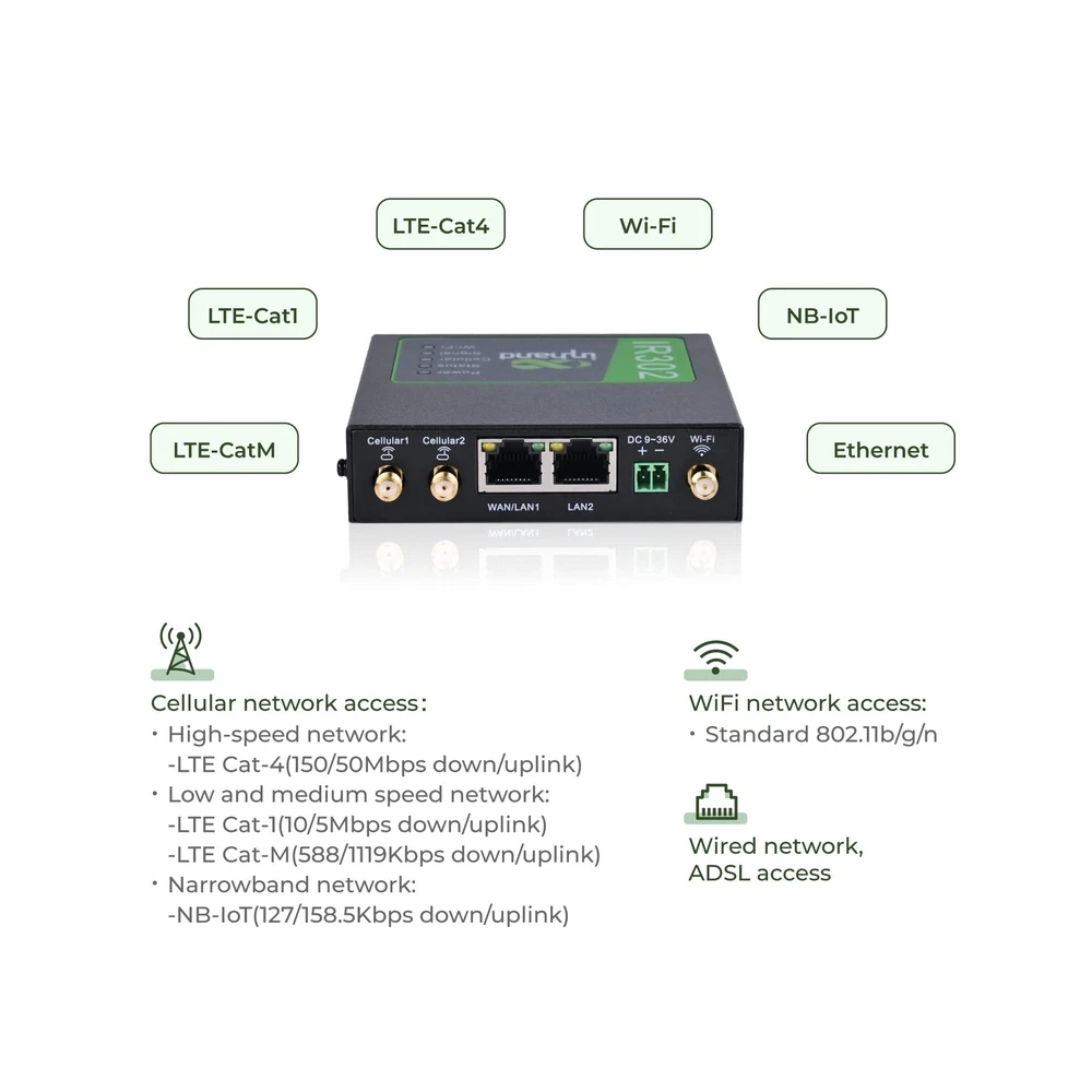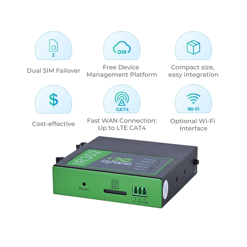 InHand Networks IR302 Industrial IoT 4G LTE VPN Cellular Router, LTE Cat 4+ Wi-Fi, Dual sim Card Slots, Management by Cloud Platform, DI/DO Port, Support T-Mobile, AT&T & Verizon, UL Certification Description Features: 4G LTE Router: working band: LTE CAT4, FDD: B2/ B4/ B5/ B12/ B13/ B14/ B66/ B71, WCDMA: B2/ B4/ B5; Dual sim card slot, use this cellular router with any mobile carriers that using the same frequency bands; Equipped with complete functions, it is applied in various industries and applications, suitable for family, business, outdoor, industry. Multiple Means for Internet Access: Available with wired network access, high speed LTE CAT4 and Wi-Fi connection. One LAN port, one WAN/LAN switchable port and Wi-Fi access. Support multiple WAN access methods, including PPPPPPoEDHCP ; Supports WIFI, Compatible with 802.11b/g/n, AP, Client and WDS modes The IR300 is a compact M2M LTE router integrating 4G LTE, Wi-Fi, and VPN technologies. Strong Security Protection: Supports VPN, firewall and user authorization management. Strong security measures for data transmission, network and device access. -Firewall Protections: Stateful Packet Inspection (SPI), DoS attack defense; Multicast filter/Ping probe packet, Access Control List (ACL); Content URL filter, port mapping, virtual IP mapping, IP-MAC binding; - Data Security, OPENVPN protocols, Supports CA digital certificate. High Reliability & Efficient Remote management: Watchdog and multi-layer link detection mechanisms ,automatic redial and recovery; Dual-SIM failover; VRRP mechanism for backup; Failover between wired, cellular LTE networks and Wi-Fi. With InHand Device Manager cloud platform. Offers 3 years warranty and free technical support. If you are not sure about the product details , please feel free to consult Product Details: Brand: inhandgo Model Name: IR302-FQ38-WLAN-IO Special Feature: QoS, Access Point Mode, Guest Mode, WPS Frequency Band Class: Single-Band Wireless Communication Standard: 802.11n, 802.11b, 802.11g Compatible Devices: Personal Computer Frequency: 2.4 GHz Recommended Uses For Product: family Included Components: ANTENNA Connectivity Technology: Wi-Fi Manufacturer: InHand Networks Model Number: IR302-FQ38-WLAN-INHANDGO Brand Name: inhandgo Model Name: IR302-FQ38-WLAN-IO Included Components: ANTENNA Number of Ports: 2 Control Method: Remote Data Transfer Rate: 150 Megabits Per Second LAN Port Bandwidth: 10/100Mbps Voltage: 36 Volts (DC) Controller Type: Switch Maximum Upstream Data Transfer Rate: 50 Megabits Per Second Number of Antennas: 2 Is Electric: Yes Recommended Uses For Product: family Connectivity Technology: Wi-Fi AntennaType: Retractable Operating System: RouterOS Security Protocol: WPA-PSK,WPA2-PSK Additional Features: QoS, Access Point Mode, Guest Mode, WPS Frequency Band Class: Single-Band Wireless Compability: 802.11n, 802.11b, 802.11g Compatible Devices: Personal Computer Frequency: 2.4 GHz Item Dimensions L x W x H: 3.54"L x 3.54"W x 0.98"H Shipping Most orders will be shipped within 1 business days once we receive your payment. Except on weekend or public holidays. A shipping notification will be emailed to you once your order has been shipped. International shipping via eBay Global Shipping Program. No shipping to AK, HI, PR, APO/FPO, US Protectorates and PO Box. Payment We Accept Payment Via PayPal and All Major Credit Cards. Return We stand behind our products. Items can be returned for exchange or full refund within 30 days from the date you receive your merchandise. Return shipping is the responsibility of buyer unless the return is a result of our mistake (i.e., your receive the wrong item). We will pay for shipping replacement back to you if an exchange of the same product is requested. Contact us If you have any questions please contact us. We respond within 1 business day or less.