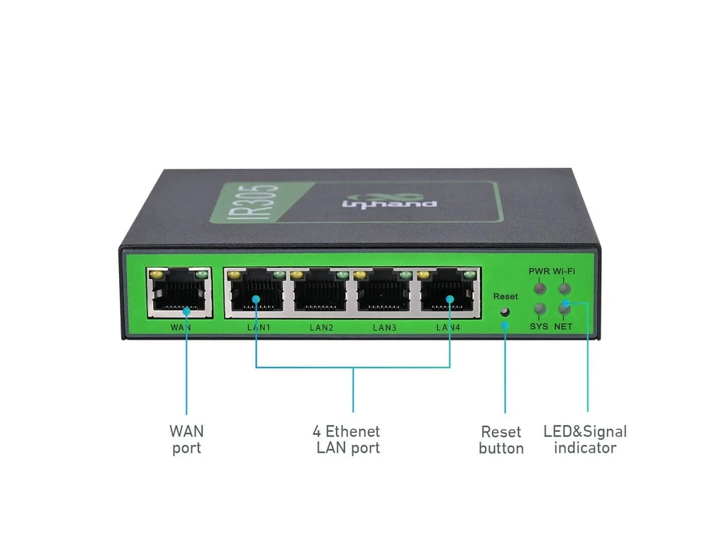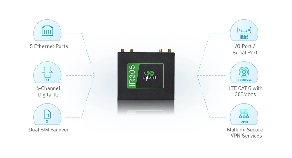 InHand Networks IR305 Industrial Iot LTE 4G VPN Router, 5 Ethernet port,dual sim, Wan failover, serial port, Remote Connection,Link backup, Mu-mimo,VLAN, for AT&T, T-Mobile & Verizon(CAT4 & RS232/485) Product Details Style: LTE CAT4 & RS232/485 Brand: inhandgo MPN: IR305-FF38-WLAN-S-INHANDGO UPC: Does not apply EAN: Does not apply Brand: inhandgo Model Name: IR305-FF38-WLAN-S Special Feature: QoS, Access Point Mode, Remote Access Frequency Band Class: Single-Band Wireless Communication Standard: 802.11n, 802.11b, 802.11g Compatible Devices: Personal Computer Frequency: 2.4 GHz Recommended Uses For Product: Home Connectivity Technology: Wi-Fi Antenna Type: Retractable Product Dimensions: 4.72 x 3.9 x 0.98 inches Item Weight: 1.83 pounds Item model number: IR305-FF38-WLAN-S-INHANDGO Date First Available: October 24, 2022 Manufacturer: InHand Networks Country of Origin: China The InRouter305 (IR305) is a dual-SIM cellular router with 5 Ethernet ports, and I/O or serial ports, integrated 4G LTE (CAT 6/4/1) and WiFi, and VPN technologies to provide easy, reliable, and secure Internet connectivity. It supports two operation modes, 4G Router mode and Wireless Router mode to provide uninterrupted multiple network access capabilities. Multiple Networking Functions IR305 is suitable for complex and large-scale network applications with its multiple networking functions, such as virtual network VLAN, static routing, OSPF, GRE, VPN DMVPN, etc. Continuity and Reliability Network Connection With Dual SIM failover and link backup, IR305 provides a reliable network connection for users. It can also provide high-quality network services by dual-SIM failover, VRRP, multi-layer auto detection and recovery of links failures. Fully Industrial Design Metal shell, IP30 protection. EMC level 3. Wide operating temperature: -20C~70C. IR305 is compact, which effectively reduces the space of installation and deployment. It supports DIN rail mounting, lug mounting and wall mounting, which is suitable for a variety of IoT deployment sites. Device Manager-Free Remote Centralized Management Platform IR305 is compatible with InHand Device Manager, a free centralized cloud management platform, allowing to remotely configure and monitor the status and parameters of IoT devices by SNMP V1/V2c/v3 protocol. Payment Back to Top We accept Paypal and All Major Credit Cards. Shipping & Handling Back to Top Item will be shipped FREE standard shipping in 1 business day after payment is received. Express Shipping services are available. Tracking number will be provided. Return Policy Back to Top Items can be returned for exchange or full refund within 30 days from the date you receive your merchandise. Please contact us before starting a return request, so we can resolve any issues and provide free returns if needed. Return shipping is the responsibility of buyer unless the return is a result of our mistake (i.e., your receive the wrong item). Contact Us Back to Top If you have any questions please contact us. We will respond within 1 business day or less.