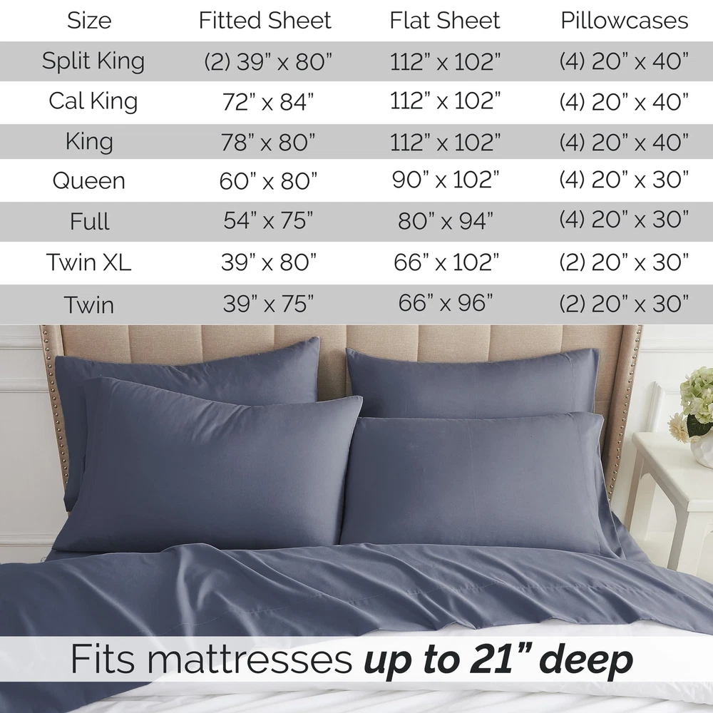 Are you tired of your fitted sheets not fitting properly on your mattresses and coming off? Our fitted sheets are 21 inches deep in size. This means they can easily fit your deep mattresses without coming off. The all-around elastic on our fitted sheets will cover your deep luxurious mattress and any toppers easily, no matter how much you toss and turn. These fitted sheets are premium quality and a snap to put on. We guarantee it. These sheets are our flagship product made with 110 GSM double-brushed microfiber fabric. Our unique method of brushing both sides makes these extremely soft and comfortable. With 21-inch deep pockets, these sheets are truly extra-deep Pocket sheet sets. Made under our trademarked Brand , Inc., a lot of attention has been paid to every aspect of the product. Starting from fabric feel, to stitching and even custom packaging. COMES WITH MANUFACTURER's ONE YEAR WARRANTY FROM DATE OF PURCHASE. Cleaning Instructions: Machine Wash Cold before use and with like colors. Tumble Dry low setting. Do not use Bleach. Remove Promptly. Luxury Lifestyle at Incredible Value: Luxurious, comfy Queen size sheet set in ultra-soft brushed microfiber for the most cozy and restful sleep you've ever had; No-shrink, no-fade, no-pill material stays beautiful for the life of the sheets. Queen Sheet Set Deep Pocket: The 21" deep queen fitted sheet has strong elastic around the entire hem to stay tucked on thick mattresses and toppers, including pillow-top, Euro-top, foam toppers. No more slipping or untucking. Softer with Every Wash: Heavenly softness that gets better with each wash. Comfy Queen size sheets that wrap you in silky smoothness for a luxurious sleep. Lightweight and breathable, perfect for year-round use. Fade-Resistant & Durable: These bed sheets, queen size bed, are Machine washable and tumble dryable, our sheets stay vibrant and fresh as new, wash after wash. Choose from many colors to suit your bedding and home décor aesthetic. 6-Piece Deep Pocket Sheets Queen Size Bed Set Includes: (1) Fitted Sheet 60" wide x 80" long x 21" Deep; (1) Oversize Flat Sheet 90" wide x 102" long; (4) Pillowcases 20" wide x 30" long