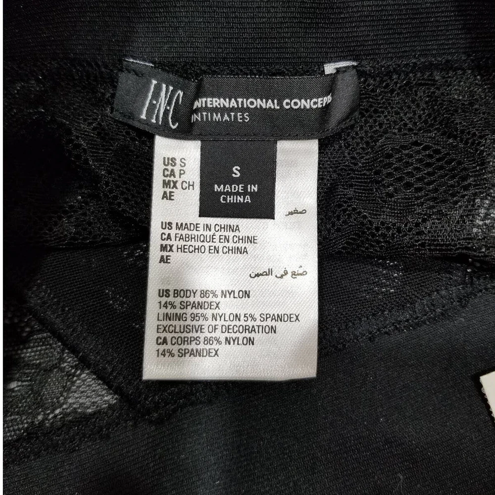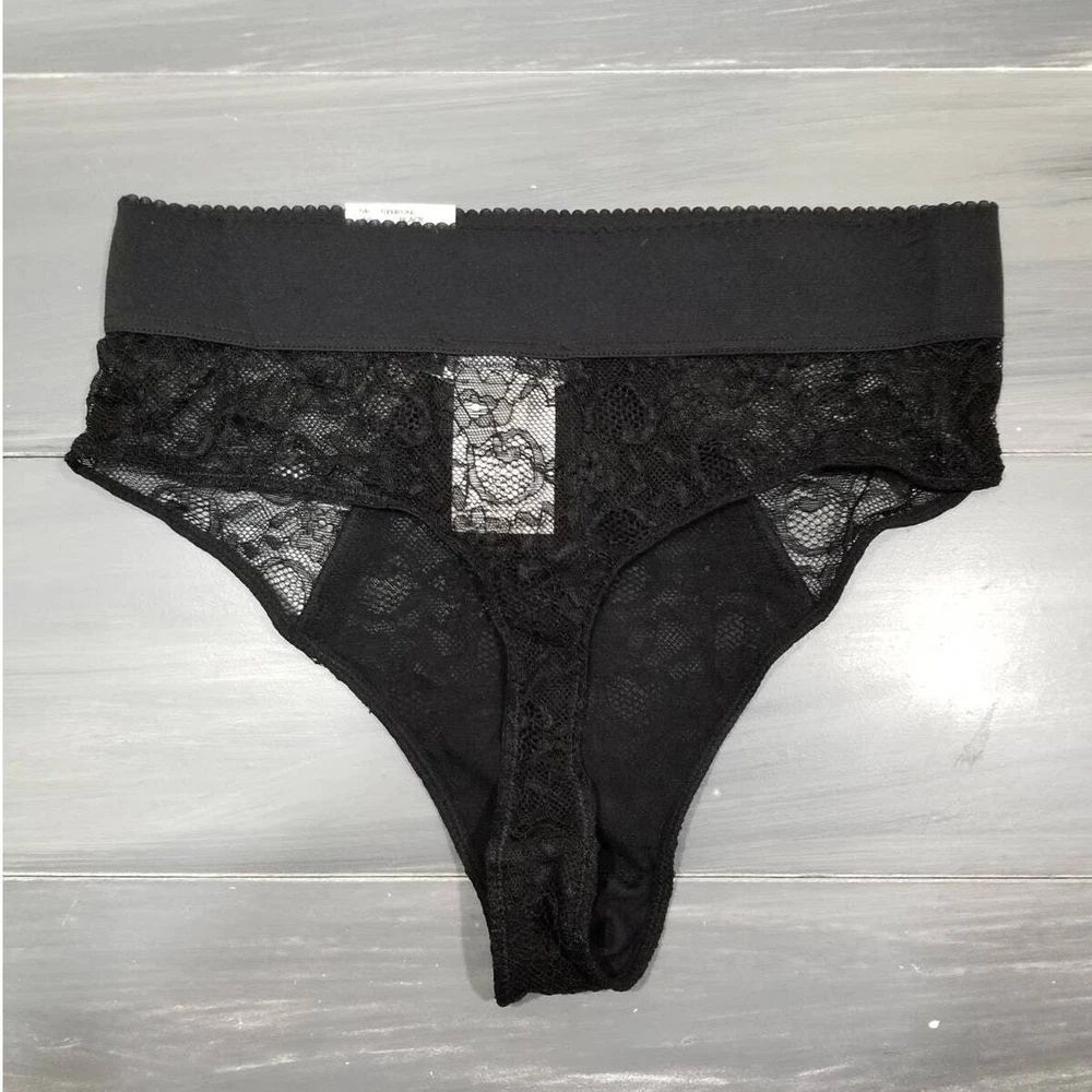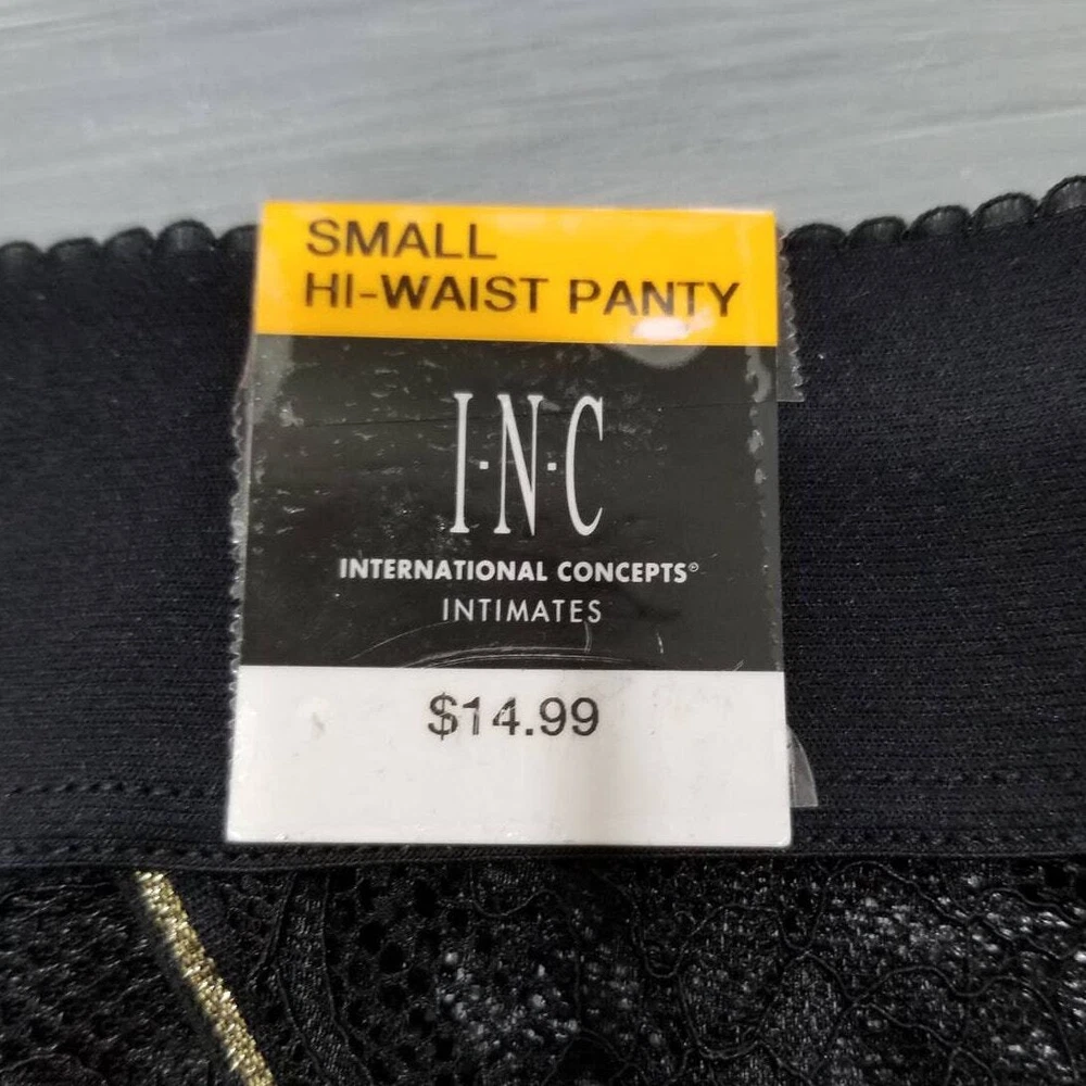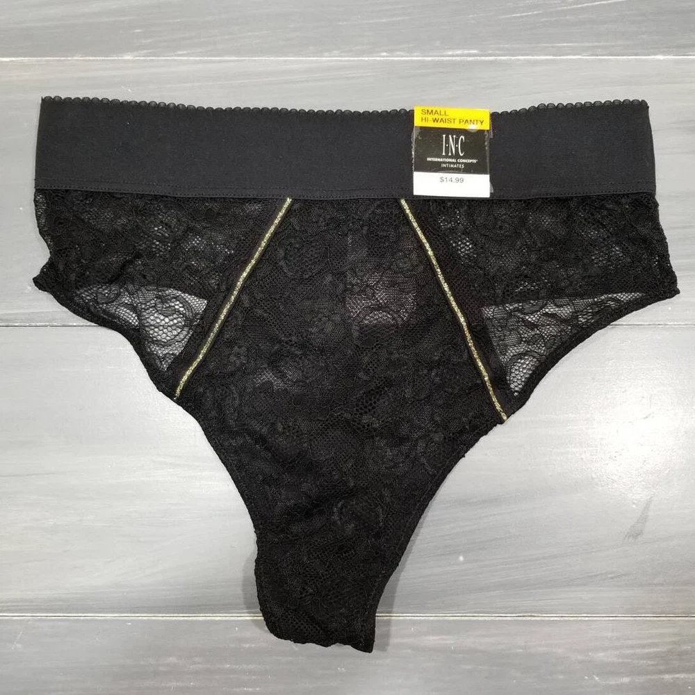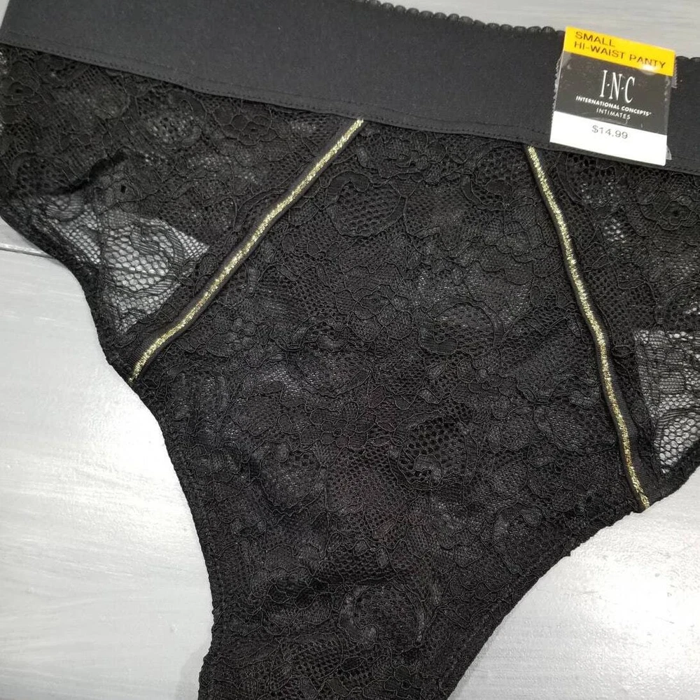 Inc International Concepts Women's Lace High-waist Thong Underwear Size: Small Color: Black pretty allover lace, wide elastic waistband, high-waist thong Coverage: Thong; little to no back coverage Wide, elastic waistband Lined panel at front Cotton Gusset Nylon/spandex Machine washable New with tags. Paper hang tag may be torn or have tape or stickers attached/detached Inv: I103
