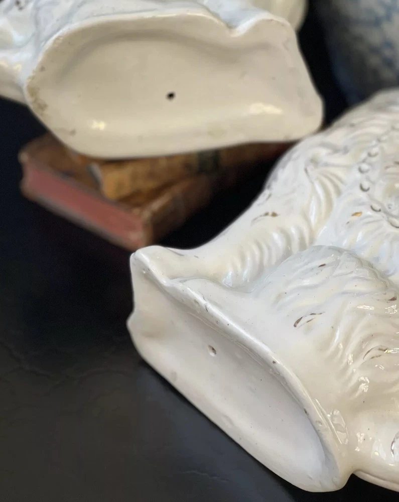 Glorious Rare 19C Antique Period Cavalier King Charles Spaniel Staffordshire Royal Game Fox Hunt Hound Mantle Dog Pair • White with Gold Markings • Classic English Staffordshire Spaniels • 9.75” Height This is a stunning pair of antique white and gold spaniel mantle dogs featuring traditional formal expressions, yet each one with its own warm personality. In versatile scale and classic form, this pair of stately right and left facing canine figures will bring a touch of English countryside to any setting in which they are placed. This beautiful find with sought after softly and perfectly aged original patina will make a stunning showpiece on its own or as part of a collection or arrangement. Expected age related wear only. Softly time aged patina as is characteristic to early examples. Superb surviving pair with all clues to their past and origin, fully present. Gallery quality original examples to own and treasure. Display ready. Height 9.75”