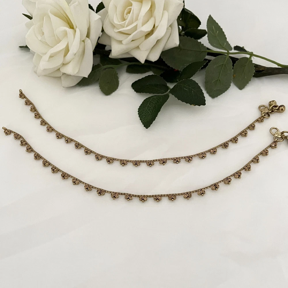 Antique gold plated slim payal elegant and light ONE SIZE Package consists of 1 set of anklets/Payal Picture shown is a real product you get what you see Actual colours may vary . This is due to computer monitors displaying colours differently and everyone can see these colours differently. We try extremely hard to ensure our photos are as life-like as possible, but please understand the actual colour may vary slightly from your monitor. Picture shown is a real product no filters Consistent exposure to perfume can harm jewellery due to the presence of oils, synthetics including ethyl alcohol, and certain colour dyes. These ingredients can cause jewellery to lose its sheen, erode metal coatings, or create a dull layer making the jewellery appear discoloured. Packaged securely in a box bubble wrap along with a Organza gift bag for safe keeping Hand made Condition: Brand New Quality checked My jewellery is check to make sure no damages and are in perfect condition Dispatched same day Standard postage will be either Royal Mail 1st class depending on weight and size, or Hermes parcel shop Please let me know if you have any questions If you have any issues, please contact me within 48hrs of receiving the item [buyer pays return postage] code 340