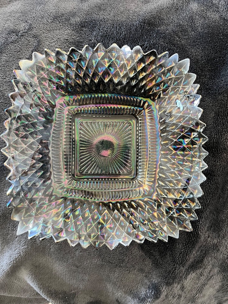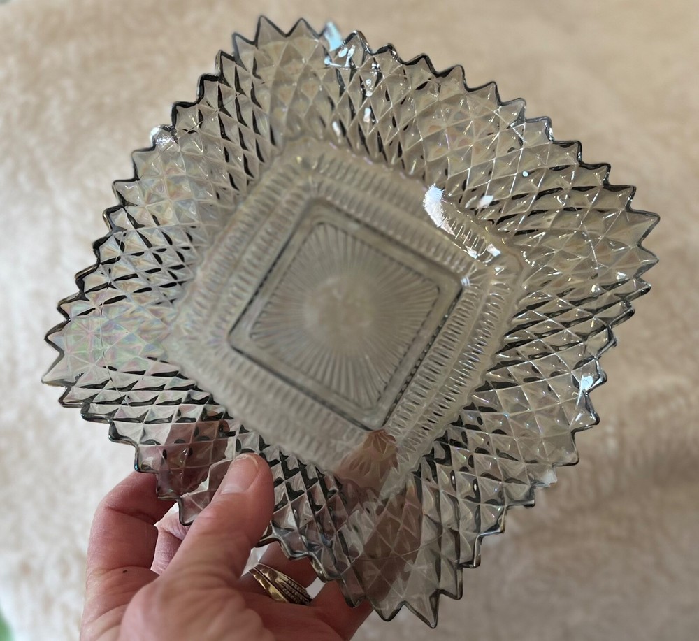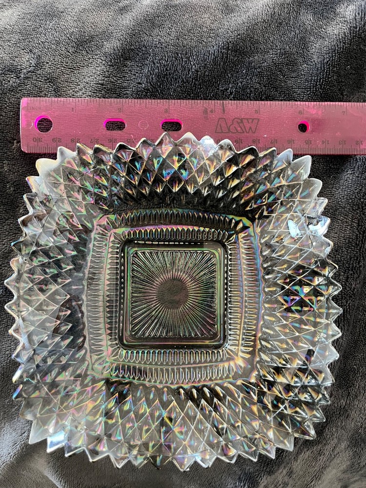 Experience the charm of vintage elegance with this Indiana Glass Smokey Gray Iridescent Ruffled Diamond Point Edge Dish Bowl. Crafted in the 1950s, the piece boasts a stunning diamond pattern, pressed glass production style, and a captivating gray color that exudes a timeless allure.Perfect for storing your cherished trinkets or as a decorative piece to enhance your home's aesthetic, this original bowl is a testament to the craftsmanship of its era. Its ruffled edges add a touch of sophistication, making it a delightful addition to any collection or decor.