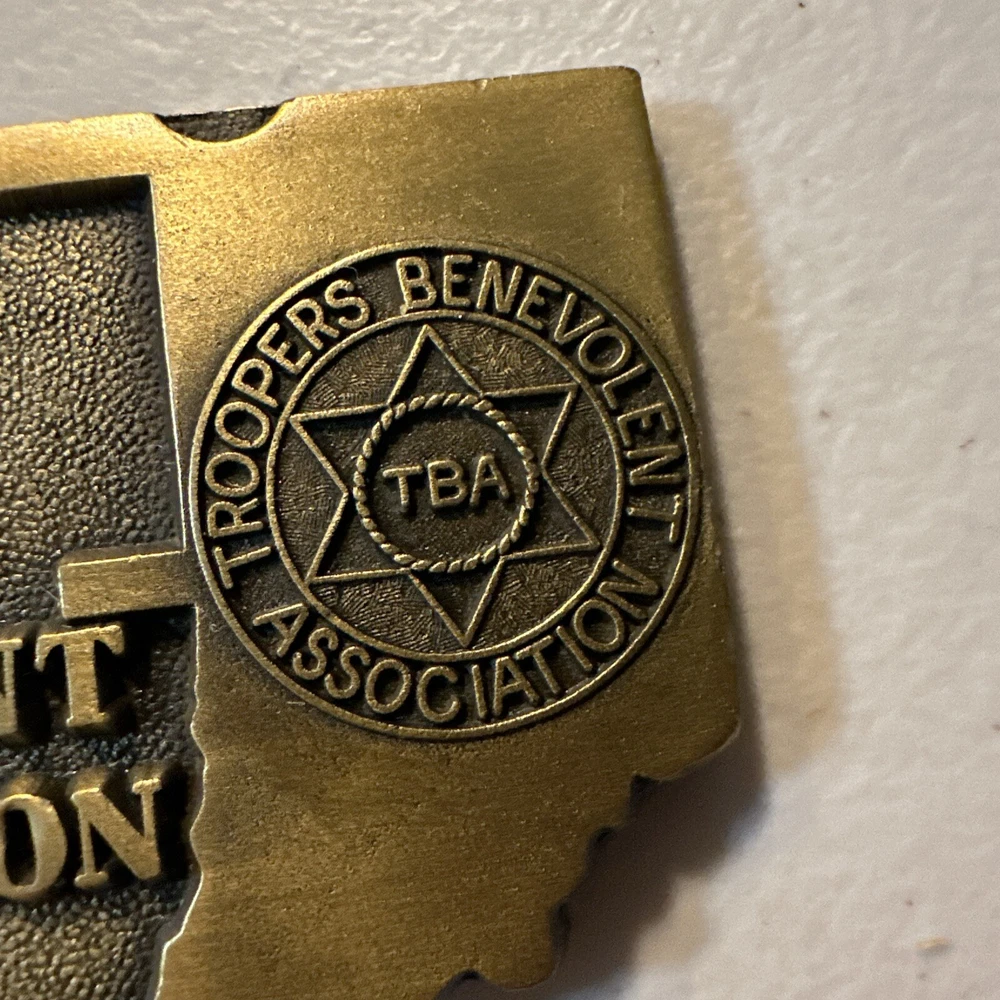 Show your support for the Indiana Troopers Benevolent Association with this stylish men's belt buckle. The buckle features a striking gold and black design that will complement any outfit. The buckle is perfect for anyone looking to add a touch of vintage accessory to their wardrobe. Crafted by Winters Associates, this high-quality buckle is made to last. It is designed for men and has a troopers theme, making it the perfect addition to any collection. Whether you are a fan of vintage accessories or simply looking for a unique piece to add to your wardrobe, this Indiana Troopers Benevolent Association Men’s Belt Buckle is a great choice.