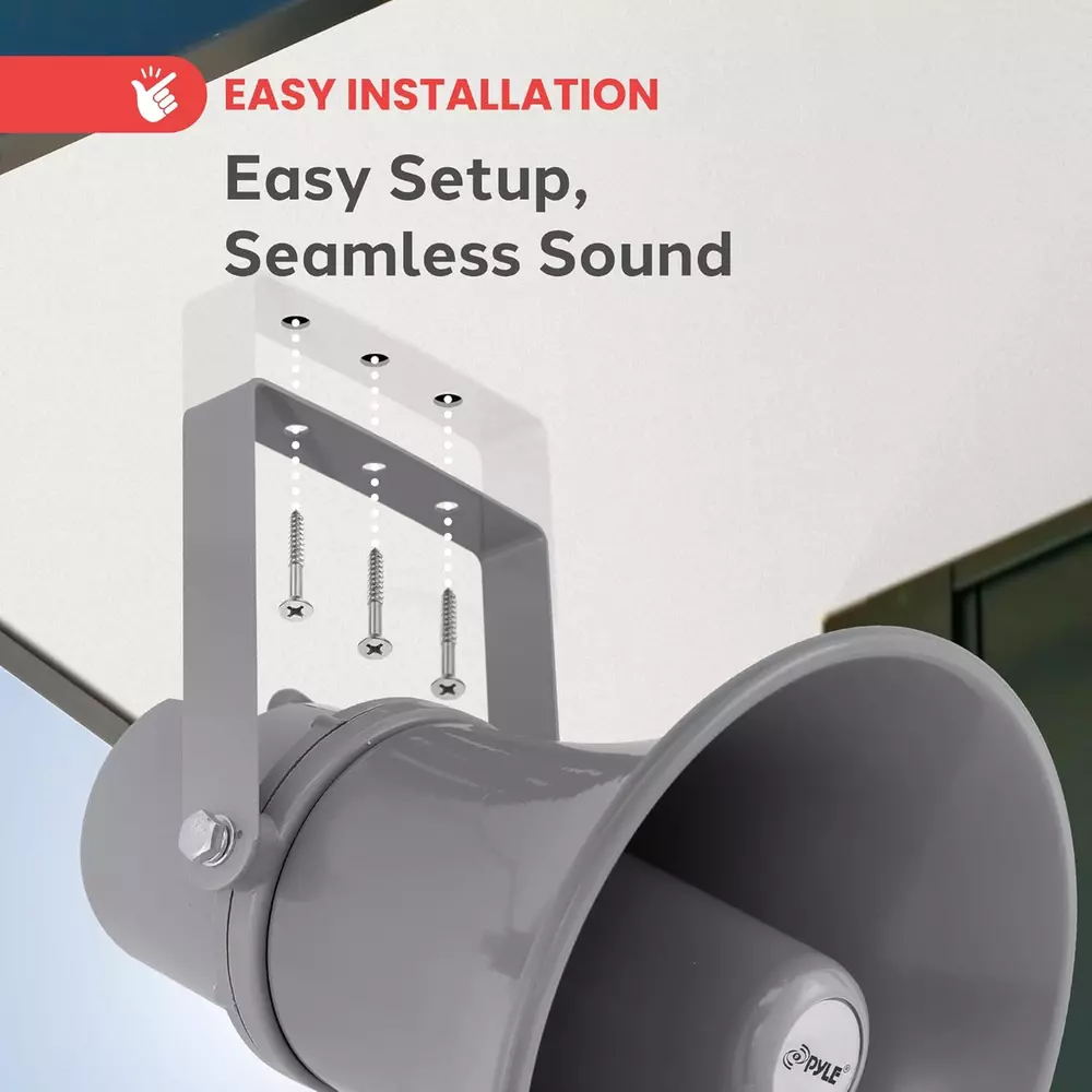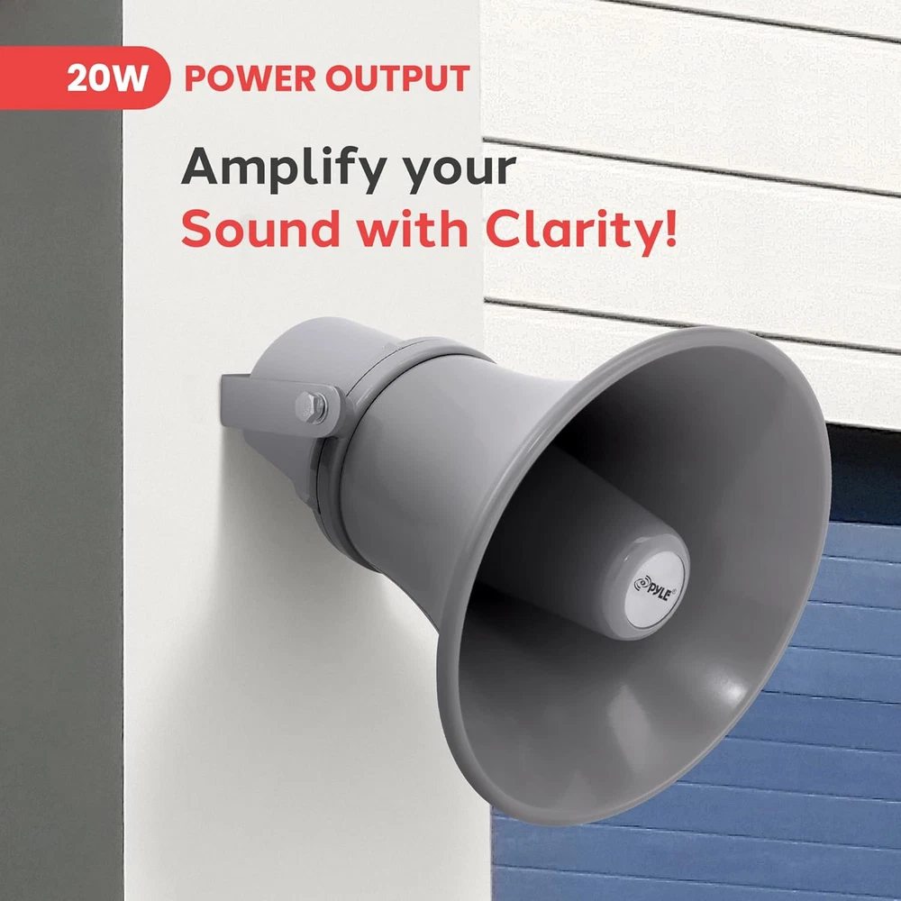 20 WATT POWER: Amplify your sound with clarity with this heavy-duty PA horn speaker. It produces high powered 20 watt sound which is enough to achieve your desired loudness so you can play your favorite tracks as loud as you want and with style 400Hz - 5KHz FREQUENCY RESPONSE: Efficient enough to achieve your desired response, this 9.7-inch compact horn pa outdoor loudspeaker audio horn speaker has 8-ohm impedance, 102dB SPL, & 400Hz - 5KHz frequency range for full-range sound reproduction FOR 70V AUDIO SYSTEM: Pyle horn pa speaker horn indoor/outdoor megaphone is great for your 70 V audio system. Perfect for outdoor PA systems when you need your voice heard far and wide. Includes a 70 Volt transformer tappable at 20, 10, & 5 watts EASY INSTALLATION: The mountable public address power horn speaker outdoor pa speaker comes with mounting bracket and hardware to make installation easier. The power horn only weighs 5.97 lbs and measures 9.7" H x 9.7" W x 11.3" D in total ALUMINUM HOUSING: This compact horn loud speaker music horn speaker sports an aluminum housing structure. The heavy-duty housing and structure provides a strong foundation and it is super easy to mount and install to your existing sound system 9.7-Inch Indoor/Outdoor with 70 Volt 20 Watts PA Horn Speaker