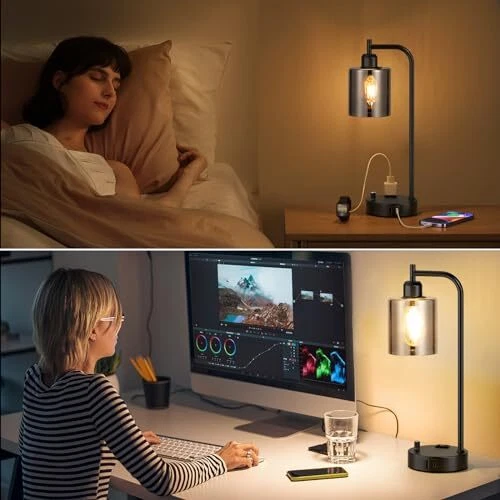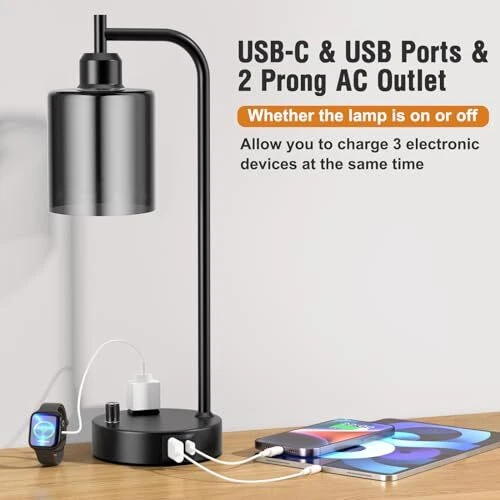 Return Policy Fast Delivery Trusted seller Industrial Desk Lamps for Office Set of 2 - Fully Dimmable Bedside Lamps with USB A C Ports and Outlet, Black Nightstand Lamps with Grey Glass Shade for Living Room, Table Lamps for Bedrooms Reading Product Description STEPLESS DIMMABLE LAMP - You can turn on/off and turn up/dim the lights by rotating the dimmer knob. The operation is simple and suitable for people of any age. Compared to 3-way dimming lamp, this bedside lamp has more brightness settings. This means that each lamp set can meet the lighting demands of various usage scenarios, such as sleeping and reading. Compared to touch lamp, the lamps have a more stable controller and you won't be troubled by frequent malfunctions of touch sensors. USB-C & USB & AC OUTLET CHARGING PORTS - Each farmhouse nightstand lamp integrates with a USB-C port, a USB port and a 2-prong AC outlet (5V/2.1A), which are available for use whether the black table lamps set of 2 are on or off. With that you'll have an easy access to charge mobile phones, tablets, kindle readers, power banks, e-watch, mini-humidifier and others. TWO 6W LED BULBS INCLUDED - You will receive two 6W E26 LED bulbs which worth $12, bonus but high quality, no flickering, no buzzing and less heat output. It has a bright light and easy on the eyes, rated to last 25,000 hours. And it is perfectly suitable to use the thomas edison lamp as bright desk lamps for home office. MODERN DESIGN FOR INDUSTRY STYLE - Adopted thick cylinder glass shade, pairs with rust-proof matte black finish iron, these rustic bedside lamps set of 2 perfectly combine a touch of vintage style with modern industry design, suitable for decorating anyw in home and office, such as bedroom, living room, dorm, guest room, kids room, and also perfect gift choice for festivals, birthday and housewarming. 'S WORK WITH SINCERITY - As a 6-year old store, we have been committed to providing customers with the most suitable lighting fixtures. The bedroom lamps for nightstand set of 2 are the modern aesthetic decor that we have newly developed to give back to our customers. We will provide you with customer service throughout the entire process, whether it is pre-sales, during sales, or after sales. If any problems arise, please contact us, we will ensure that you receive new and intact lamps! Shipping Returns Payment Shipping Shipping is FREE to all addresses other than APO/PO boxes in the lower 48 states. All our stock ships from US-based warehouses. Shipped via USPS or UPS (depending on location and package weight) Unless stated otherwise, all orders will ship within 24-72 hours of your payment being processed. Check our feedback to see the great reviews of FAST shipping we offer. Returns Seller does not accept returns Payment We currently accept payment via eBay managed payments only. Once payment is cleared, we will dispatch your shipment within 1-3 business days. Please refer to the "Shipping" tab for more information regarding shipping speed to your destination.