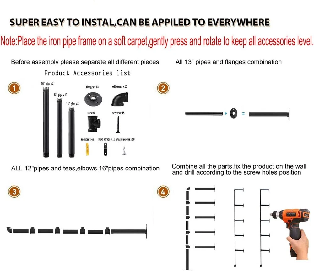 Item Height:Does not applyRoom Type:KitchenFinish Type:PaintedWeight capacity:Maximum weight: 5E+1 PoundsBack Style:BacklessSize:12D x 60W x 70H inIncluded Components:Instruction ManualProduct Name:Industrial Wall Mount Iron Pipe Shelf BracketType:Does not applyUPC:7445042448497Style:Retro_styleModel Name:Industrial Wall Mount Iron Pipe Shelf BracketSpecial Feature:Heavy DutyMin Required Door Width:12 InchesAge Range (Description):AdultAssembly Required:YesFurniture Finish:BlackItem Weight:17.6 poundsWeight Limit:5E+1 PoundsProduct Dimensions:12"D x 60"W x 70"HItem Width:Does not applyItem Length:Does not applyMaterial Iron, Metal:Mounting Type Wall MountBrand:Does not applyNumber of Items:2Shelf Type Tiered Shelf:Shape TrapezoidInstallation Type:Wall MountShelf Thickness:70 InchesRecommended Uses For Product:bookshelf, kitchen shelf, bathroom shelf, flowers shelfgtin13:7445042448497Number of Shelves:Does not applyProduct Care Instructions:Wipe with Dry ClothSpecific Uses For Product:Books, Kitchen items, Bathroom items, Flowers