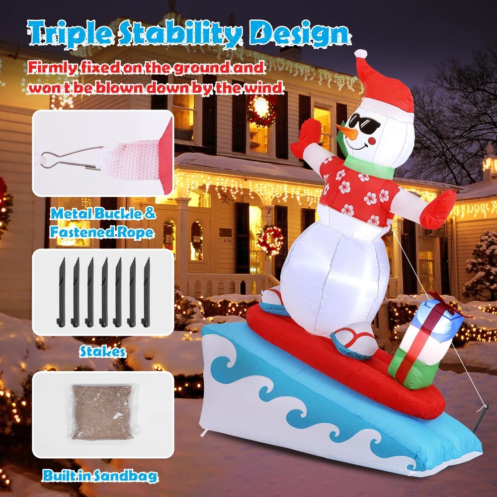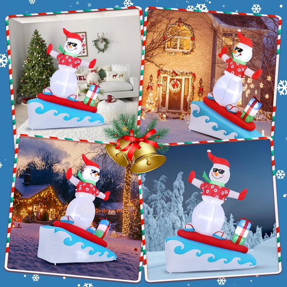 6FT Inflatable Snowman with LED Lights Surfing Snowman Blow Up Yard Decorations Xmas Decorations for Xmas Party Indoor Outdoor Home Garden Lawn Surfing Snowman Inflatable: This 6FT Christmas inflatable outdoor decoration seems to have just returned from surfing in the ocean and brought Christmas presents for you and your family, which will certainly give you, your family and guests a good mood. Your children may also hope to have a cute inflatable friend to accompany them at Christmas. This snowman inflatable is an ideal Christmas gift for kids, its vivid and funny appearance will make them love it at the first sight. Inflatable snowman with LED Lights: The built-in warm white LED lights help this Christmas decorations outside inflatable light up your garden and create a happy and warm Christmas atmosphere in the evening, which will easily catch the eyes of children, neighbors and guests. All of you can dance or talk happily in the warm light forgetting all troubles. Our light up snowman is ideal for both outdoor and indoor family Christmas party decorations to enliven the festival atmosphere. High-quality Inflatable Christmas Decorations: Made of high-quality umbrella cover fabric, this Christmas inflatables snowman can be used without worries in snowy or rainy days. With excellent stitching umbrella fabric, this inflatable christmas ornament won’t be torn apart or fade, and will accompany your family at Christmas next few years. What a perfect inflatable Christmas yard decoration. Christmas outdoor inflatables with Good Stability: There are 1 built-in sndbag, 3 6.6ft ropes and 7 stakes to help to fix the blow up snowman. You can easily install the outdoor snowman on the lawn, in the yard or in the garden. The inflatable snowman outdoor will be firmly fixed on the ground and won’t be blown down by the wind. Just let this Christmas inflatable snowman bring you laughter and joy at Christmas and enjoy a happy and wonderful Christmas party! Fast Inflation and Deflation: The snowman inflatable is quipped with a powerful air blower. Plug in and zip up, you'll see a inflatable snowman in 30s. Unplug and zip up, the snowman blow up can be quickly deflated. The 6.6ft power cord reduces the distance limit of power supply. Just feel free to have a Christmas party in the yard. Putting the Xmas inflatable snowman in front of the door of your store, shopping window will make them more eye-catching and attract more customers. Precautions: 1. Do not cover the surface of the blower during inflation. 2. Keep away from sharp objects. 3. Keep the plug and blower away from water. guarantees to serve you! If you have any questions, suggestions, ideas, please feel free to contact us!