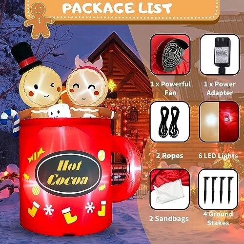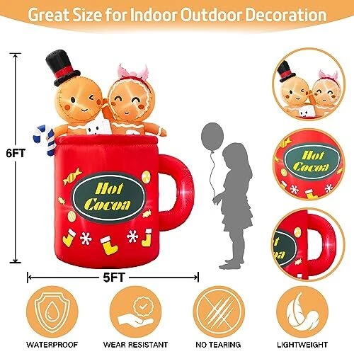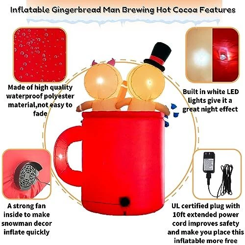 30 Days Return Policy Fast Delivery Trusted seller Gingerbread Inflatable Christmas Outdoor Decorations 6FT Cute Giant Blow Up Gingerbread Man Hot Coca Inflatables Yard Decor Light Up Led Lights Xmas Blowups for Indoor Outside Lawn Vacation Product Description Durable & Waterproof Material:This 6ft tall cute gingerbread inflatable christmas yard decorations made of thickened fabric which is waterproof,weather-proof,lightweight,fadeproof.The tighter stitching process to improve durability of hot cocoa inflatable gingerbread man blowups.This giant light up Led lights blow up ginger breadman inflatables outdoor decor will create a festive focal point in your outside front yard.It will creat a joyous and xmas festive holiday atmosp for your family Safety & Reinforcement Design: This funny gingerbread christmas inflatables outdoor decorations is equipped with 2 Fasten Ropes, 4 Ground Stakes and 2 fixed heavy sandbags that make it secure very well to the ground and no need to worry that it will fly away with the wind. Our large gingerbread blow up lawn decor adopt 12 volt power adapter to provide a safer for your inflation process, so that you can enjoy the joy of the vacation with more confidence Built-In Bright 6 LED Lights & Humanized Design: This merry christmas inflatable ornaments features 2 cute gingerbread men sitting together in hot cocoa mugs playing dice, very funny. The build-in 6 LED lights are super bright which makes the lighted christmas blow up yard decorations show a bright effect at night and light up your yard, garden. Your kids and neighbors will be unconsciously attracted and create a warm winter night. For indoor and outhouse use Self-inflates Fast & Easy to Use: Built in a powerful blower, just zip up the zipper and plug in, the huge xmas inflatable decorations will self inflate in a short time. Then simply secure the inflatable christmas ornaments with stakes and ropes. Once the holidays are over, just Unplug it, self-deflate quickly and store it in the carry bag. Note: please make sure the zipper is closed and the blower is facing up when inflating Best Christmas Ornaments for Any Occasion: The inflatable gingerbread man is for any holiday event or party. Both kids and adults will love this fun presents christmas decor. Great for indoor, outside, front yard, patio,lawn, garden, stage prop, party, restaurants, cafes, home, party, Xmas, Holiday, Festivals, Vacation, Mardi Gras, New Years. The only thing you are worried about is just the 6 feet gingerbread inflatable Christmas will be stolen from your yard Shipping Returns Payment Shipping Shipping is FREE to all addresses other than APO/PO boxes in the lower 48 states. All our stock ships from US-based warehouses. Shipped via USPS or UPS (depending on location and package weight) Unless stated otherwise, all orders will ship within 24-72 hours of your payment being processed. Check our feedback to see the great reviews of FAST shipping we offer. Returns As our valued customer, we will do our best to make sure the product you receive arrives to you on time and as expected. If you are not satisfied with your purchase, please contact us within 30 days of receiving your order to process a return. Payment We currently accept payment via eBay managed payments only. Once payment is cleared, we will dispatch your shipment within 1-3 business days. Please refer to the "Shipping" tab for more information regarding shipping speed to your destination.