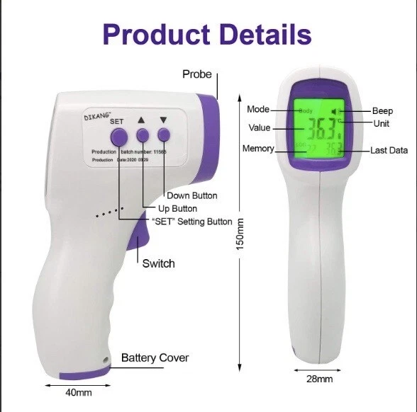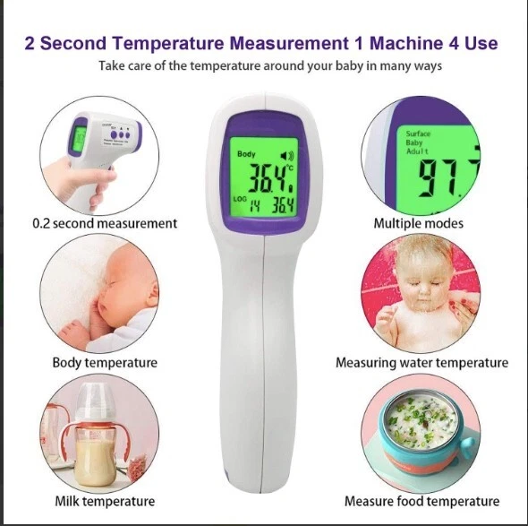 Infrared Thermometer, Digital Infrared Forehead Thermometer Household Body Temperature Meter Non-contact Home Fast Measuring Recommended by medical experts for consistent and reliable performance Designed for all ages - adults, infants, and elders 1-second fast measurement with instant reading Equipped with intelligent light indicator for fever warning Records 35 sets of readings for better tracking Features rapid and accurate measurement in 2 seconds 【FAST AND ACCURATE】With newest high precision infrared sensor which is recommended by medical experts following vigorous clinical tests to confirm its consistency and reliability, Vigorun Temporal Thermometer will perform excellently in instant temperature measurement. 【MULTI-MODE THERMOMETER】The digital fever thermometer is designed for all ages, adults, infants and elders. It not only supports forehead or ear function, but is able to take room/object temperature. ℃ and ℉ are easily switchable. 【BEST CHOICE FOR BABY】1 second fast measurement with instant reading, plus mute mode, just take the temperature without waking your baby up. 【INTELLIGENT LIGHT INDICATOR】Equipped with fever warning system, the thermometer for fever will indicate temperature status with corresponding lights and beeps. 【35 SETS OF MEMORY】 35 sets of readings are recorded for better tracking the changes of body temperature. Features: Rapid and accurate measurement in 2 seconds. Keep personal safe to measure temperature without surface contact. ℃/℉ Switchable and one button operation. Body temperature mode/ surface temperature mode switchable. High body temperature (fever) alert. Specifications: Measuring distance: 2-3.2 inch Automatic shutdown: about 30 seconds Body Mode Range: 34℃-43℃ Surface Mode Range: 0℃-93℃ Package Included: 1 x Body Thermometer 1 x User Manual