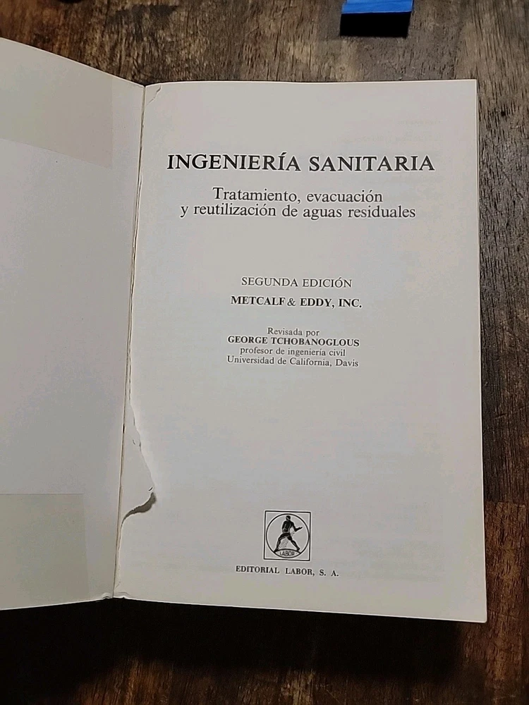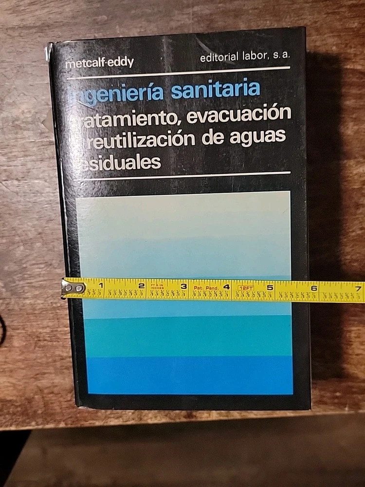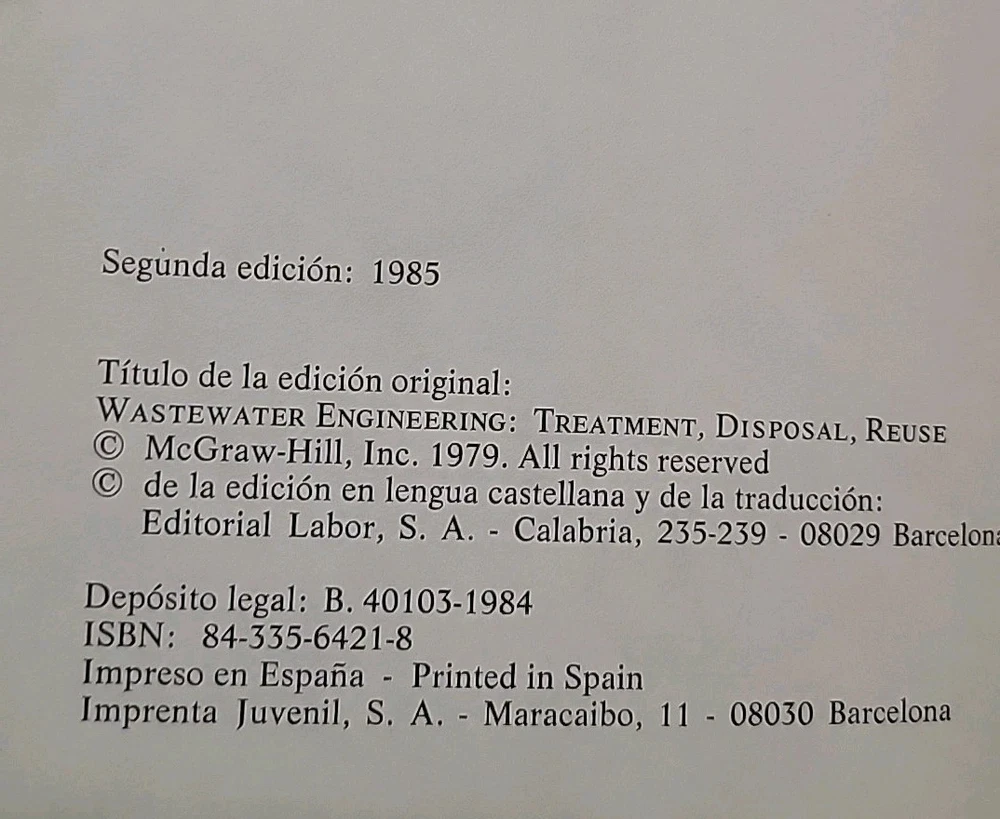 The product is a SPANISH VERSION Metcalf-Eddy textbook titled Sanitary Engineering Wastewater Treatment, Disposal, and Reuse. "Ingeniería Sanitaria Tratamiento Evacuación Y Reutilización De Aguas Residuales" by author George Tchobanoglous. Published by McGraw Hill in 1985, this 969-page paperback book is part of the Editorial Labor series. Written in Spanish, this textbook covers the subject areas of water and wastewater, catering to high school, adult education, and vocational school levels. With a vintage feel and illustrated features, this textbook is designed for beginner to advanced learners interested in the field of wastewater reuse. See photos. Very Rare book.