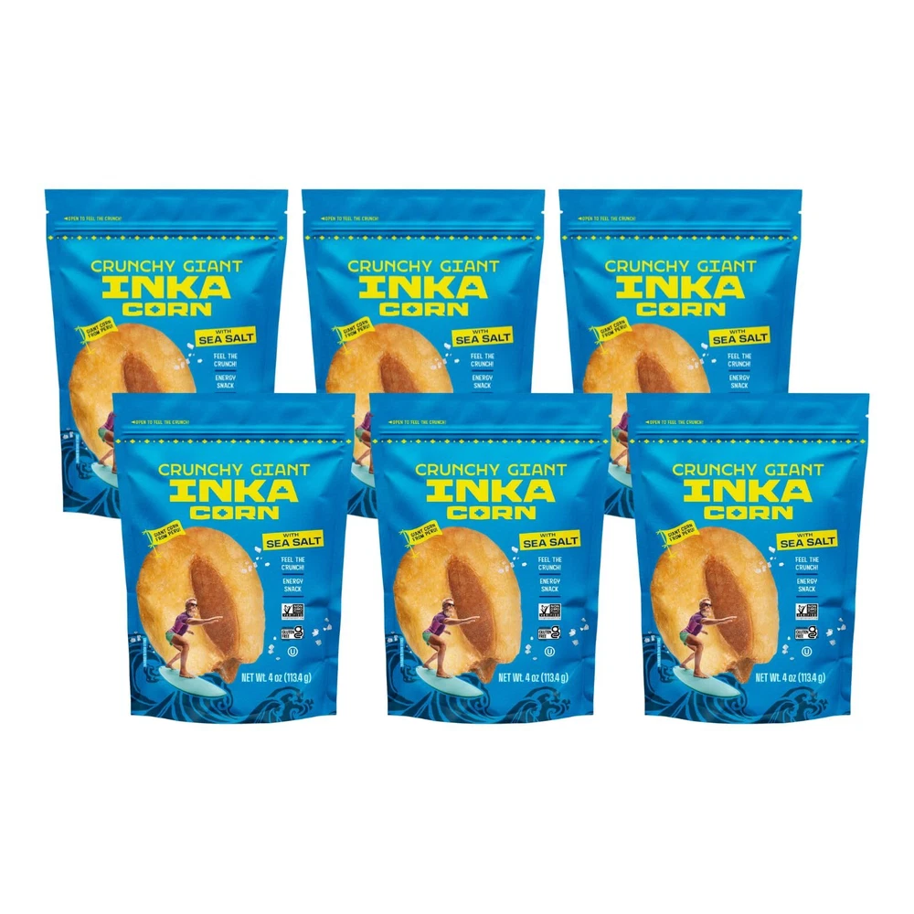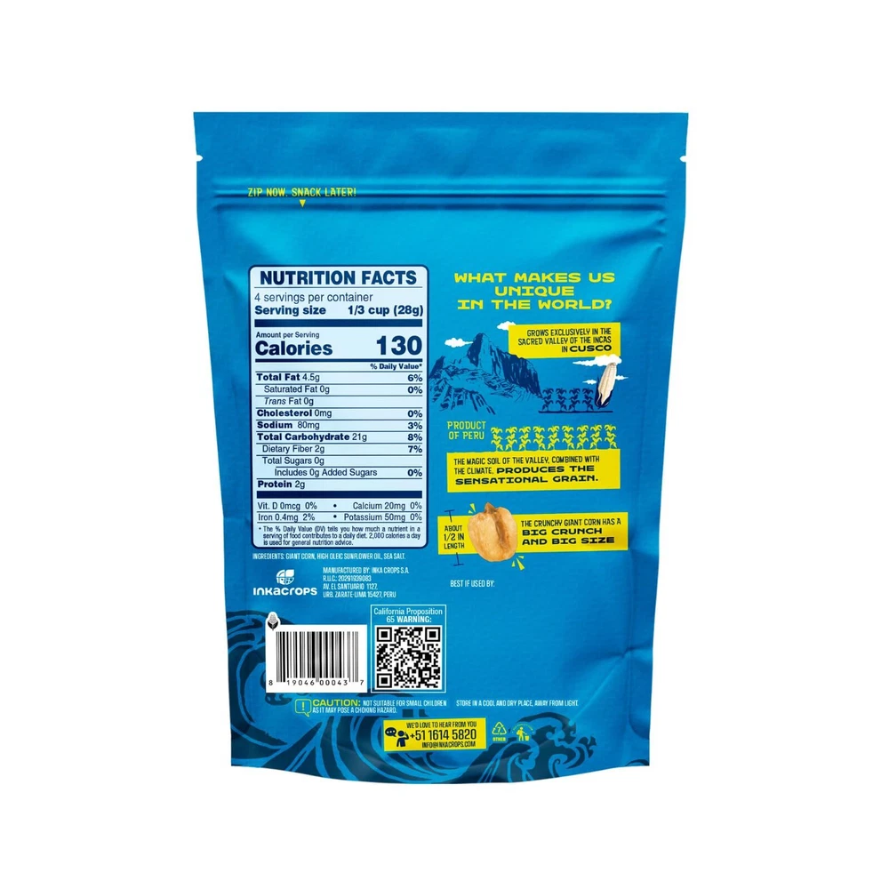 Original Roasted Giant Corn, 4 Ounce -- 6 per case. Deliciously roasted with only salt, comes the most delicious and crunchy treat this part of the globe has to offer. Did we mention its BIG?, I mean, the real Giant Corn of the Inkas. Ingredients: Corn, palm olein and sea salt. Dairy free, Gluten Free, Vegan, Wheat Free, Yeast Free Gluten-Free & Non-GMO: Made from premium giant corn, these roasted corn nuts are gluten-free and free from genetically modified ingredients, ensuring a healthy and natural snack option. Lightly Salted, Bold Flavor: Enjoy the satisfying crunch and lightly salted taste that makes these corn nuts an irresistible snack for any occasion. Convenient 4-Ounce Bags: Each pack contains six 4-ounce bags, perfect for on-the-go snacking, sharing with friends, or keeping at home for a quick, tasty treat. No Artificial Additives: Inka Corn Nuts are crafted without artificial flavors, colors, or preservatives, delivering a pure and wholesome snacking experience. Versatile Snack: Great for parties, road trips, or as a crunchy topping for salads and soups—these corn nuts are a versatile addition to your pantry.