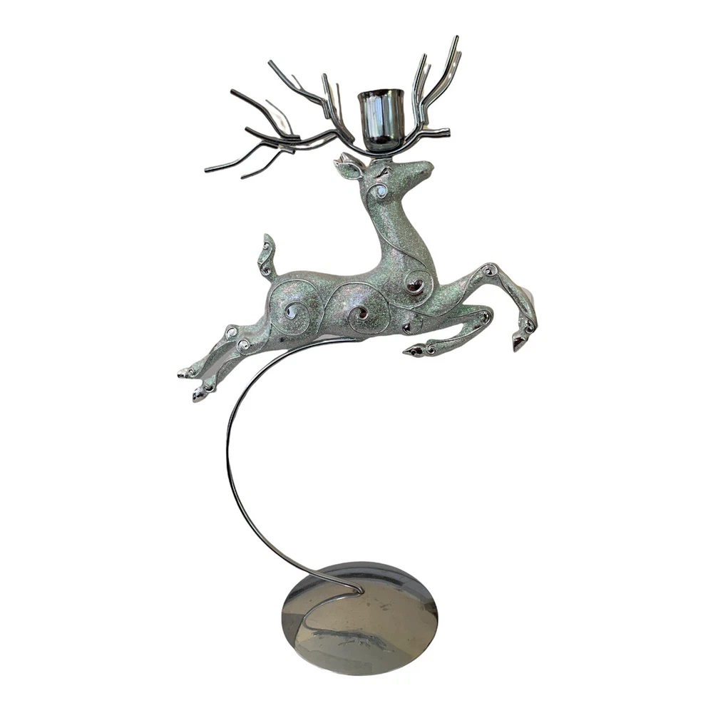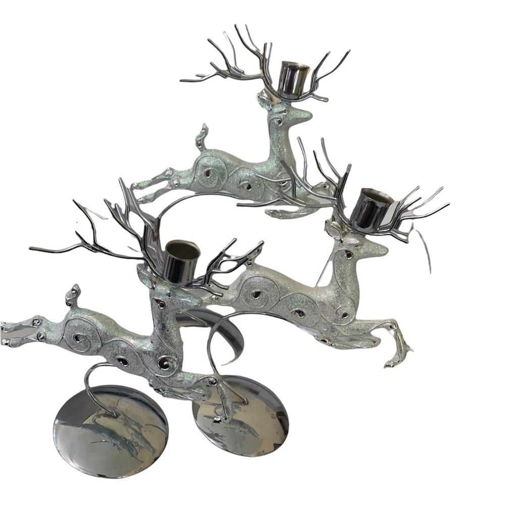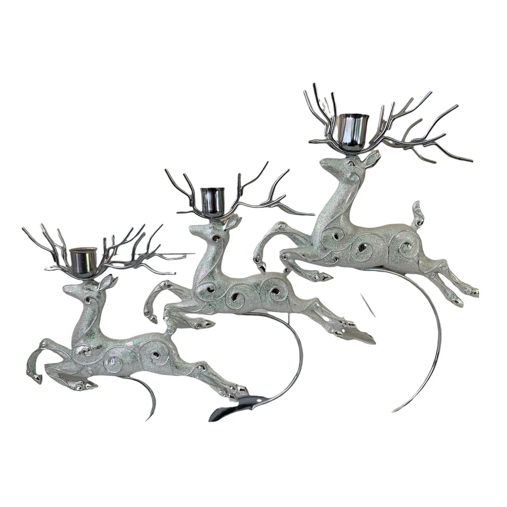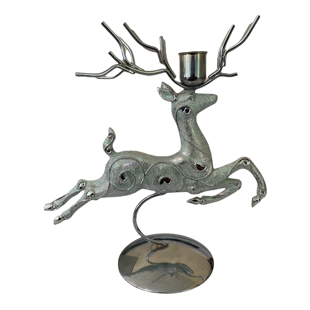 Set of 3 Leaping Reindeer Candleholders. Silver Glitter, with a Swirling design . Each on is on a stand. The candle is held on the antlers. New, with sticker on bottom of one deer. Retails for $50.00 Smoke Free Home. We provide FAST Shipping, same day if purchased by 3:00 PM EST. International Sales Ship through International Shipping Program. Free returns. New items must be unopened, unused. Thank you for considering our listing, we value your business.