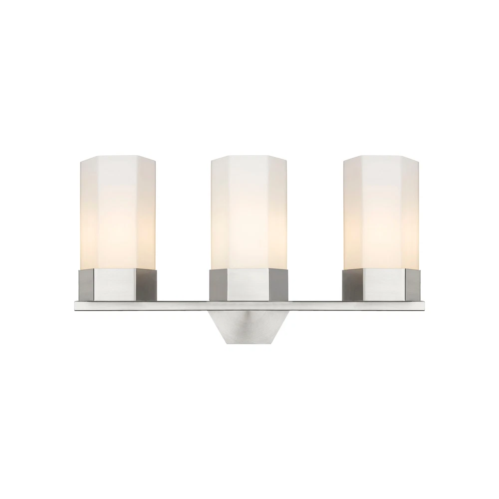 Geometric design is the star of the Claverack Collection. The hexagonal details of the metal frame is accentuated by the similarly shaped glass shades. Claverack offers a full line of fixtures to suit any project or space.UL/CUL Damp RatedRated for 100 watt maximum per socketCompatible with Incandescent, LED, Fluorescent and Halogen bulbsWall-mounted with 2mm heavy cast backplateFixture may be mounted up or downFeatures hexagon design details and glass shadesWeight: 9.1 poundsBulb Shape: T SeriesSocket Type: E26Light Bulb Included: NoFixture Dimmable: Yes Free Shipping Over $49.99* Details Innovations Lighting Claverack - 3 Light 9" Wall-Mounted Bath Vanity Light Product Description: Geometric design is the star of the Claverack Collection. The hexagonal details of the metal frame is accentuated by the similarly shaped glass shades. Claverack offers a full line of fixtures to suit any project or space. UL/CUL Damp Rated Rated for 100 watt maximum per socket Compatible with Incandescent, LED, Fluorescent and Halogen bulbs Wall-mounted with 2mm heavy cast backplate Fixture may be mounted up or down Features hexagon design details and glass shades Weight9.1 pounds Bulb ShapeT Series Socket TypeE26 Light Bulb IncludedNo Fixture DimmableYes
