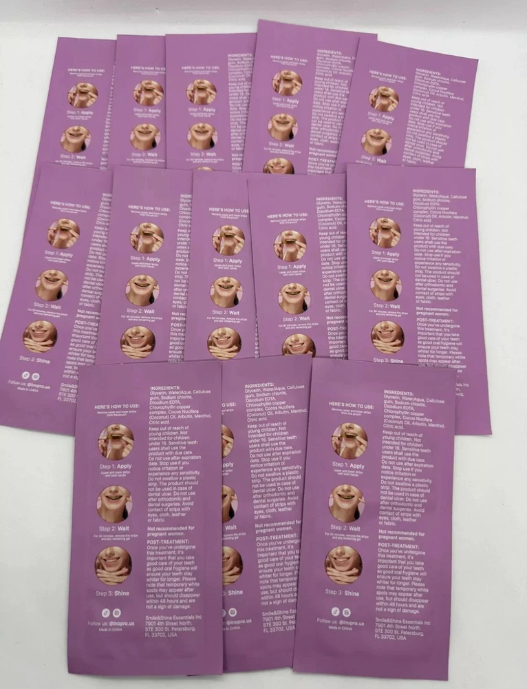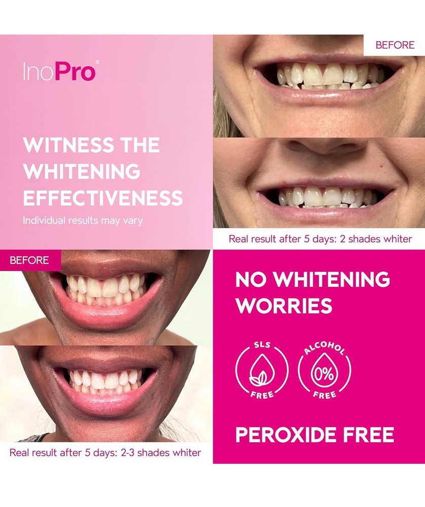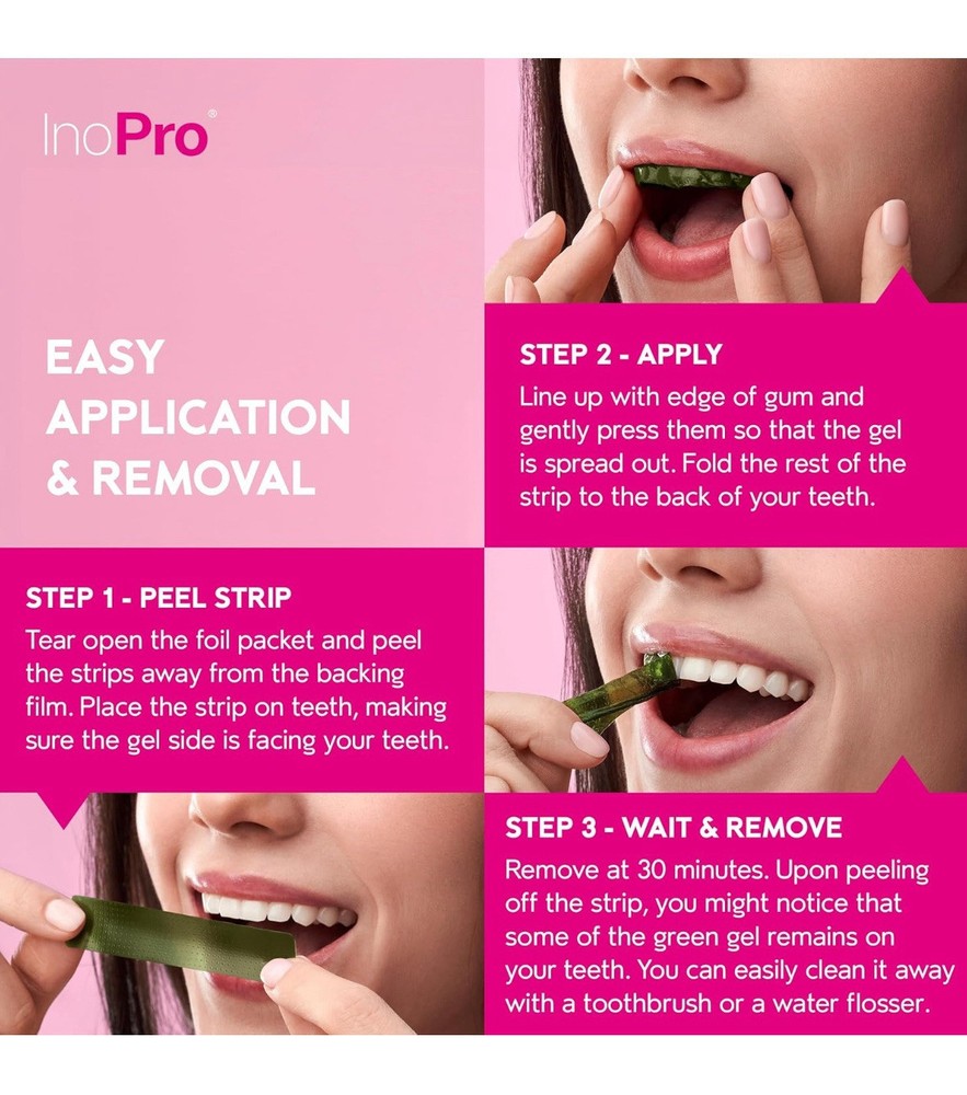 Active Ingredients: Coconut Oil, Hydrogen Peroxide, Sodium Hydroxide Size Type: Regular Size Flavor: Coconut MPN: INOPRO, Green Strips Expiration Date: 10/27 Type: Teeth Whitening Strips Product Line: Inopro Features: Enamel Safe, For Sensitive Gums, Organic, Paraben-Free, For Sensitive Teeth Model: Inopro green whitening Strips Brand: Inopro