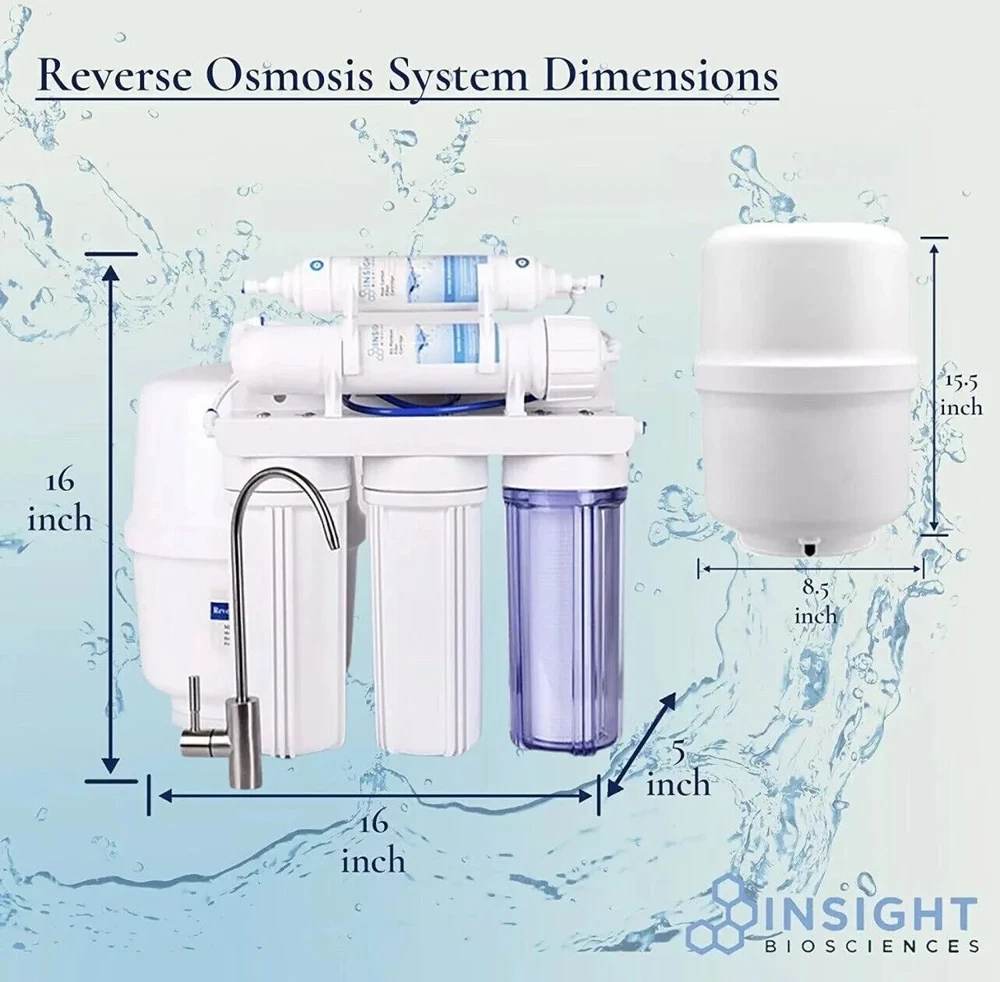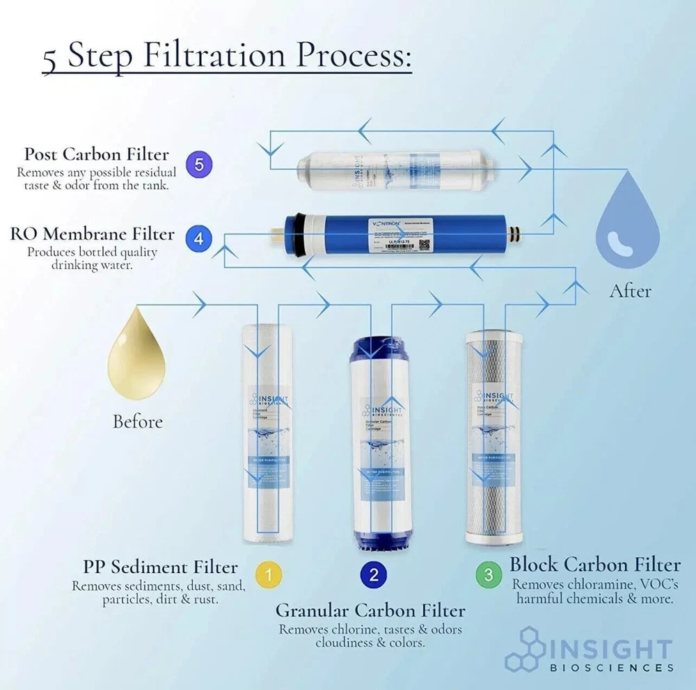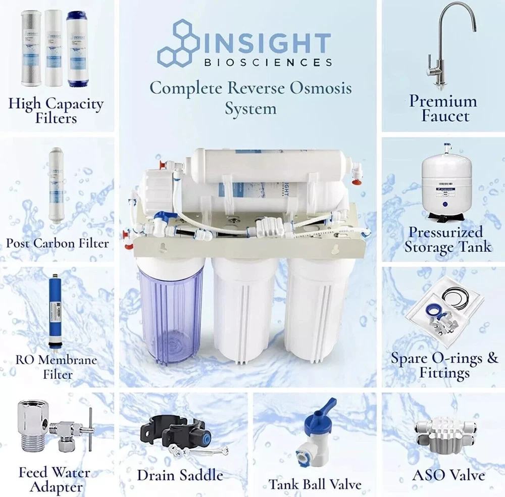 New Insight Biosciences 5-Stage CE Certified Reverse Osmosis Water Filtration System Product Details PREMIUM QUALITY FILTERS :- The Insight Biosciences reverse osmosis system is built with super long-lasting filters; Our 5 Stage, ROS5-50, under Sink water filter system is the most durable system in the industry and will last for decades; It is designed, assembled, and engineered to guarantee water quality and safety HIGH PERFORMANCE RO WATER FILTER SYSTEM :- Our CE certified, ROS5-50 reverse osmosis filtration system is the only technology able to remove up to 99% of contaminants, removes heavy metals, including arsenic, cadmium, lead, mercury and many more; Also, removes chlorine, fluoride VOCs and 1000+ contaminants; Enjoy clean, safe, great tasting water every time you turn on the faucet EASY INSTALLATION AND MAINTENANCE :- Now you do not need to waste money on professional installation; Our water filter system is designed for do-it-yourself installation with all parts and filters included for the best do-it-yourself installation experience; This countertop reverse osmosis filter fits under a standard kitchen sink EQUIPPED WITH PREMIUM FAUCET & PARTS :- Our under-sink & countertop filtration system comes with our premium, 100% lead-free, designer faucet, along with NSF Certified Food grade tubing and parts to provide contamination-free, safe and pure water; High quality leak-free quick connect fittings provide a guaranteed grip and does not rely on a water leak detector to protect your home like other brands