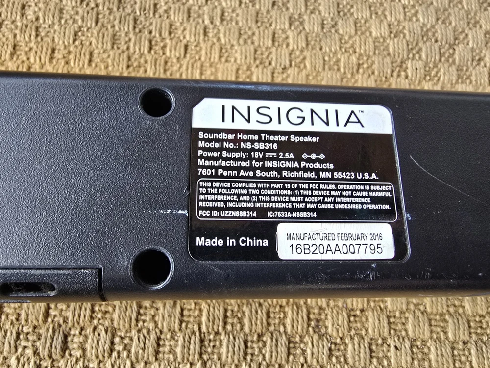 Audio Inputs:AUX, Digital Coaxial RCA, Digital Optical TOSLINKImpedance:naModel:NSSB314Color:BlackType:SoundbarSmart Home Compatibility:naFeatures:BluetoothShape:RectangularSystem Configuration:2.0 ChannelDriver Size:2.5 inConnectivity:Bluetooth/WirelessCountry/Region of Manufacture:Unknowngtin13:Does not applyUPC:Does not applyRMS Power:25 WBrand:InsigniaMPN:NSSB314