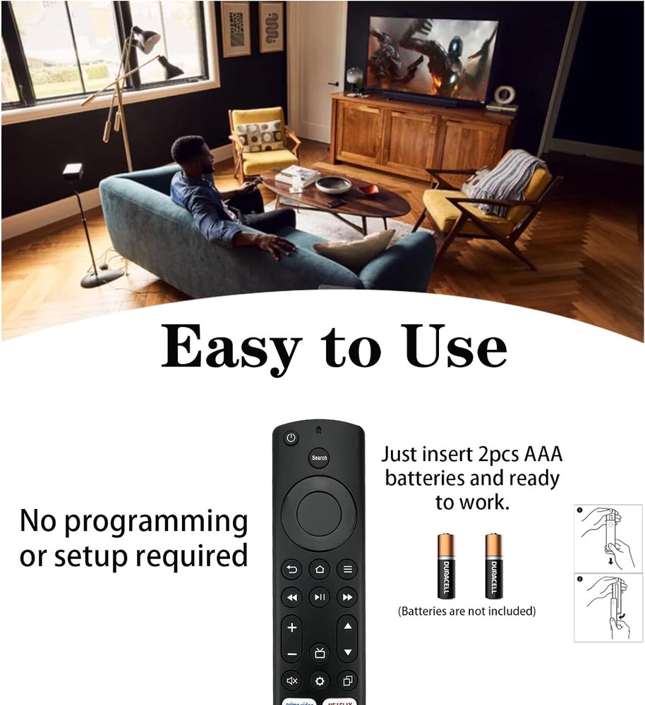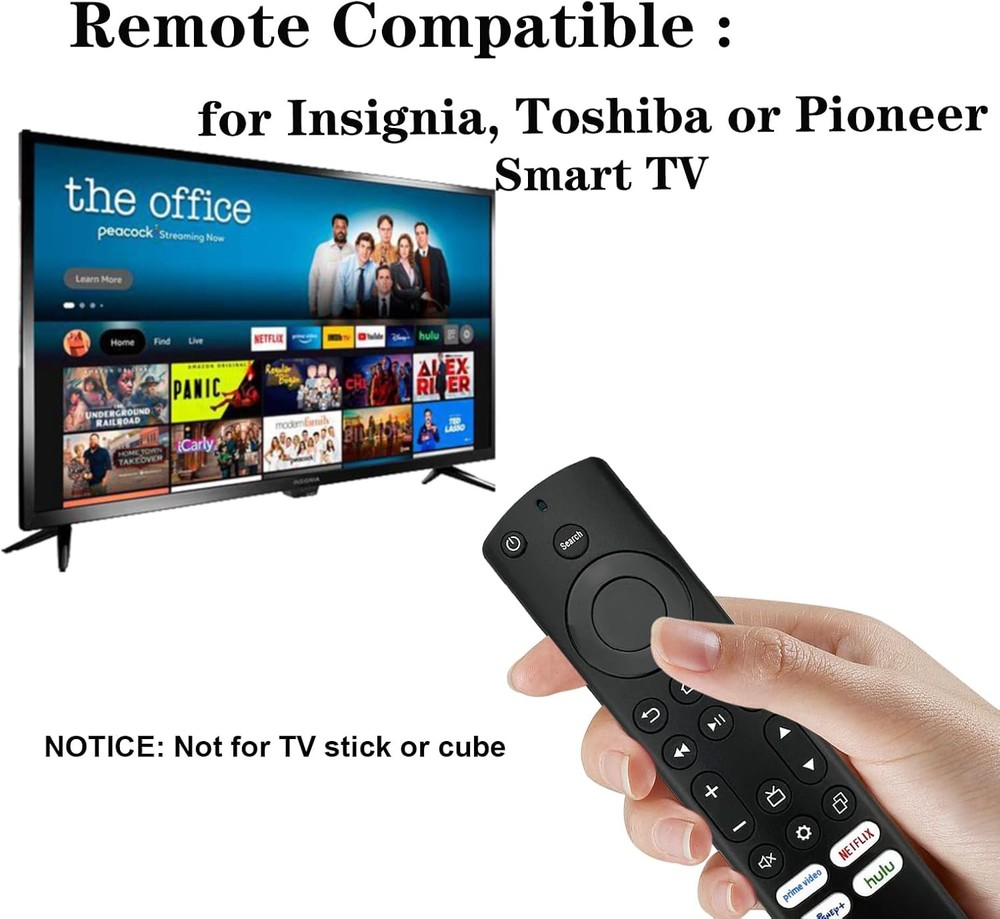 Replacement Remote Control for Insignia, Toshiba, Pioneer Smart TV, Compatible with Fire Series Device (Not for Stick and Cube) Product Details Product Dimensions: 6.25 x 1.51 x 0.71 inches Item Weight: 1.44 ounces Batteries: 2 AAA batteries required. Manufacturer: Luyeper Country of Origin: China Brand: Luyeper Special Feature: Ergonomic Max Number of Supported Devices: 1 Compatible Devices: Television Connectivity Technology: Infrared Applicable: Replacement TV remote control compatible for Insignia, Toshiba, Pioneer, Amz Omni Series, 2-Series, and 4-Series smart TVs with FireOS built-in (no voice function) No Need to Setup: This is an infrared smart TV remote that works out of the box, please do not restore the original factory settings of the TV Quality: This smart TV remote replacement can accurately control distances up to 32 feet, has a maximum response time of 0.2 seconds to the TV, and supports tests with more than 120,000 clicks 4 Shortcut Keys: The replacement TV remote control features 4 shortcuts for popular streaming channels. Remote with shortcut buttons can quickly take you to the app. It makes your life easier Premium After-Sale Service: We offer 30 days after-sale service. If you have any questions about your order, please feel free to contact us directly and we will get back to you within 24 hours