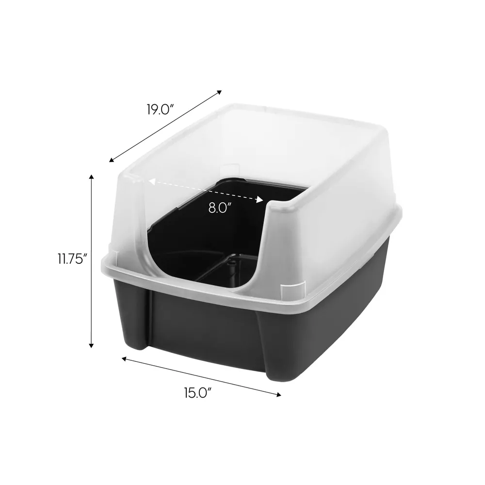 Inspired Essentials Cat Litter Box with Shield and Scoop has extra tall walls on three sides to help contain litter and spray while keeping dirt out. Open top cat litter container provides quick and easy access, while the deep litter pan design gives your cat a semi-private space. The high-polished interior surfaces and included cat litter scoop make the litter box easy to clean. Recessed bottoms and molded-in feet keep the IRIS cat litter box in place and the molded-in rims around the pan add strength and stability to the litter box tray. The cat litter container comes with a matching litter scoop for easy cleaning, and the scoop is designed to fit anywhere in the litter pan. Inspired Essentials, Open-Top Cat Litter Box with Shield and Scoop, is designed to offer cats plenty of room and quick accessibility Inspired Essentials cat litter box includes a matching litter scoop and polished interior for easy cleaning Recessed bottom and molded-in feet allow litter pan to fit neatly in all types of spaces. Cat litter boxes include matching litter scoops and high polished finish for easy cleaning Dimensions: 19.00"L x 15.00"W x 11.75"H Color: Black