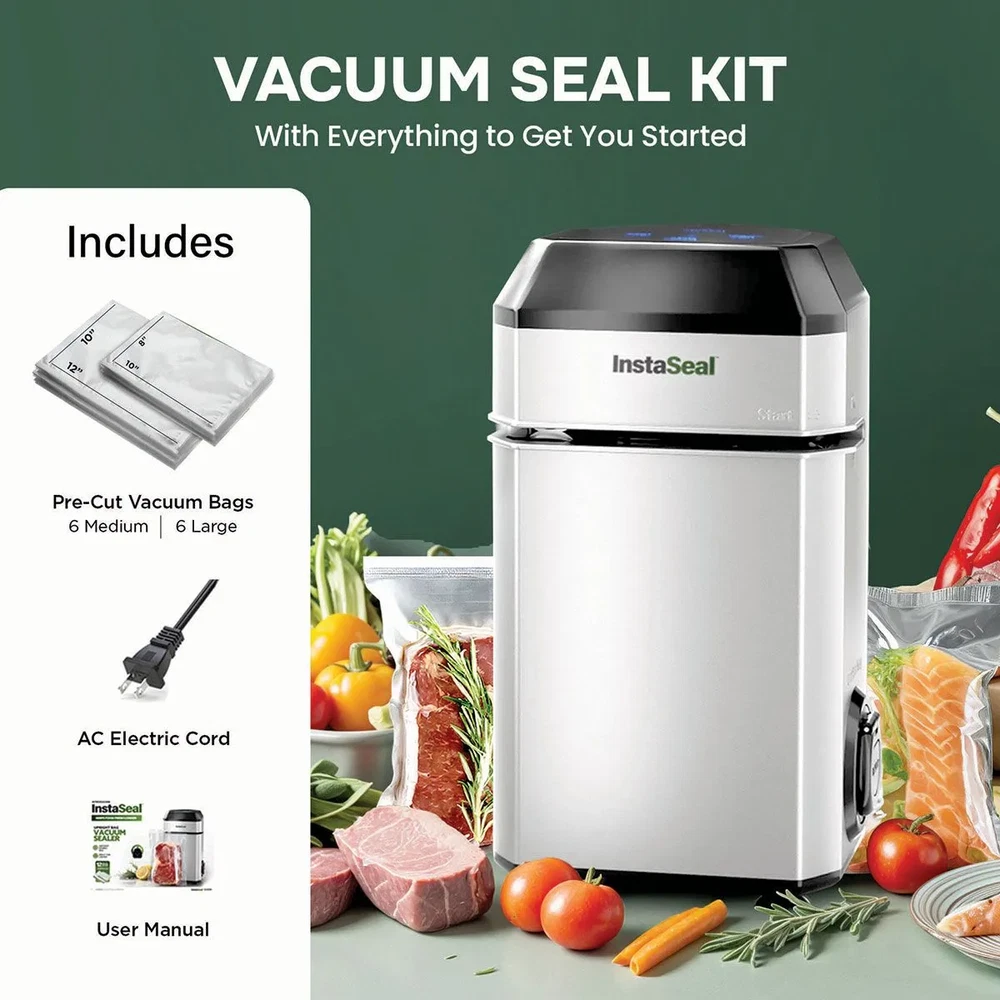 InstaSeal Food Vacuum Sealer Machine with 12 Bags, Patented Upright Food Saver Vacuum Sealer Machine Allows to Vacuum Seal Liquids, Food Sealer Vacuum Sealer for Food Saves & Keeps Food Fresh Longer INSTASEAL VACUUM SEALER MACHINE: Get started with everything you need, including the space-saving Insta Seal upright food sealer vacuum sealer for food, user manual, and AC electrical cord, and a set of 12 pre-cut bags. The no-leak design prevents spills, while the airtight double seal locks in flavors. NO-SPILL, NO-LEAK DESIGN: Upright food vaccum sealer seals from the top to prevent spills and leaks during the process, making it ideal for soups, stews, and other liquids. Provides secure sealing for liquids, preventing spills and messes in your refrigerator or freezer. PREVENTS FREEZER BURN: Removing air and sealing bags locks in flavor and prevents exposure to elements that ruin food over time. COMPACT FOOTPRINT: Most food vacuum sealer machine take up a ton of space. With dimensions of 5” (W) x 5” (L) x 9” (H), the space-saving Insta Seal food vacuum sealing machine is easy to store in your kitchen cabinet or countertop. SAVE TIME & MONEY: Preserve a variety of foods with ease, from meats and vegetables to soups and leftovers, ensuring they stay fresh and flavorful. Cut down trips to the grocery store, buy in bulk, and batch cook. EASY TO USE: A simple and effortless process for sealing bags makes it easy to preserve your raw ingredients and leftovers. Vacuum functions are conveniently located on the top of the sealer for intuitive operation. AIRTIGHT DOUBLE SEAL: InstaSeal Vacuum Sealer ensures food stays fresher for longer compared to traditional freezer bags, with no risk of freezer burns. CONVENIENT PRE-CUT BAGS: Includes 6 medium and 6 large pre-cut vacuum bags for immediate use, offering sizes of 8” x 10” and 10” x 12” respectively. AUTOMATIC SENSOR: Smart Sensor technology automatically removes air from bags and stops when sealing is complete, simplifying the vacuum sealing process, making sure all air is out, and preventing oversealing and damage to delicate foods.