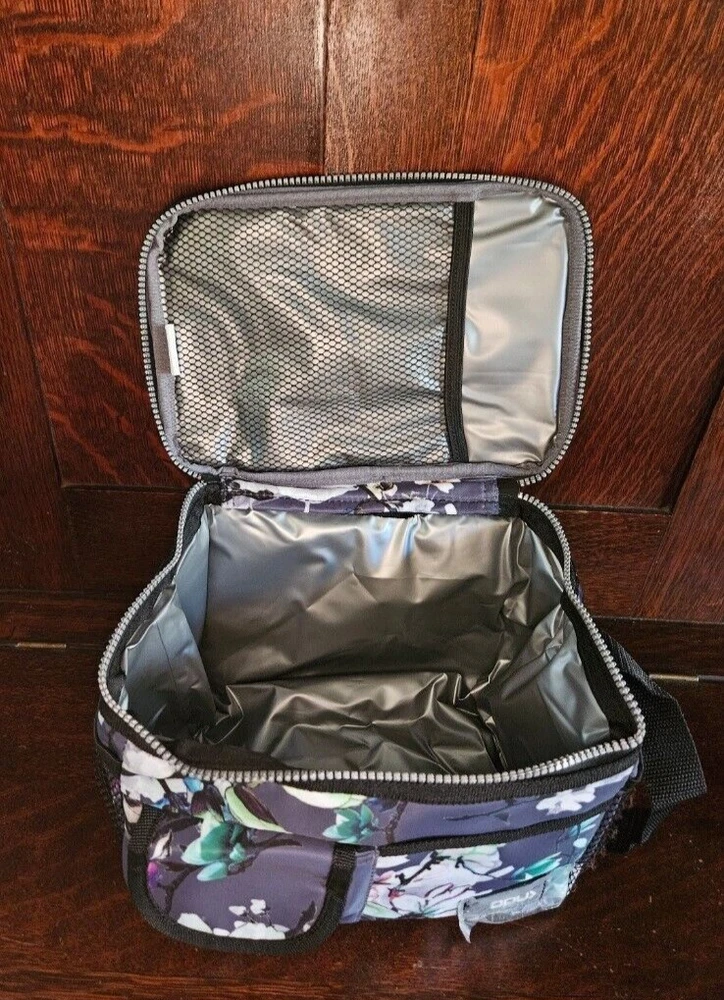 Brand new Opux classic insulated lunch box with pouches. It is 10" x 7" x 7.75" and made of polyester. It is said to hold up to 14 cans of soda in it.