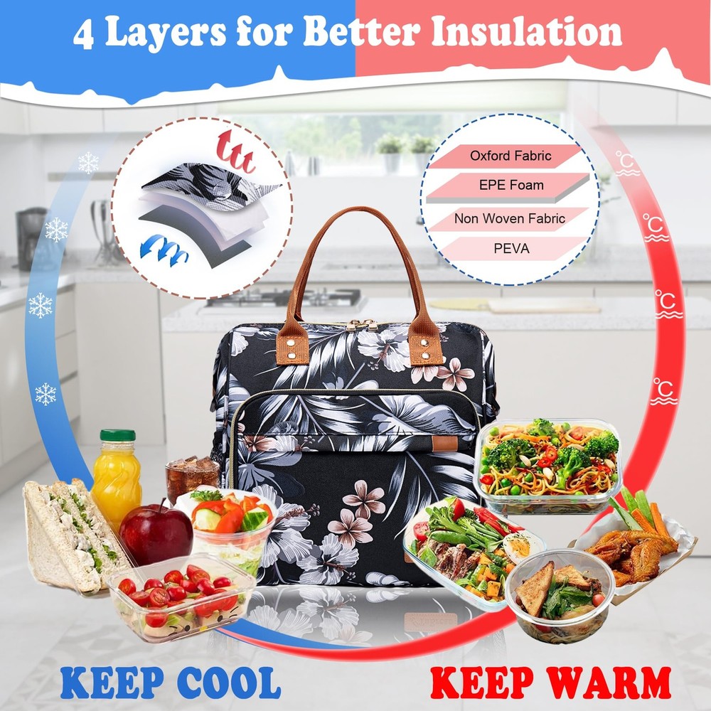 MULTIPLE POCKETS: TuErcao insulated lunch bag: 1, Features one main zippered compartment to keep your food and fruits warm or fresh. 2, The front zipper pocket great for your headphones, data cable. 3, The velcro pocket suitable for holding cutlery or your snacks. 4, The back privacy zippered pocket is for your necessities like keys, credit cards, and small change. 5, Two mesh pockets are for drinks, beer, cola, water bottles, shoulder strap or tissues LEAKPROOF & THERMAL INSULATED: TuErcao reusable lunch bags are equipped with waterproof ethylene vinyl acetate lining, which is soft, leakproof, and easy to clean. Padded with 6mm EPE foam and 900d polyester & composite tarpaulin outer fabric will keep your food fresh or warm when you're on the go DIMENSIONS & CAPACITY: TuErcao lunch bag dimensions are 10.25" x 6.3" x 10.5" (L x W x H). The main compartment has large capacity and can fit 16 cans 330ml colas. It can hold all of your food like sandwiches, salad, snacks, drinks, and fruits for the entire day PORTABLE & CONVENIENCE: TuErcao insulated lunch box features one reinforced handle on top for carrying as a handbag or tote bag. And comes with a detachable & adjustable shoulder strap which can be adjusted from 15" to 27" for carrying as a shoulder bag or crossbody bag DURABLE MATERIALS: Premium reinforced metal dual zippers, secure zipper closure, and sturdy buckle ensure smooth open and maximum durability. Our Insulated lunch box follows a strict set of specifications and quality standards WIDE USAGE: This lunch bag can use as a cooler bag, small ice chest, tote bag, work bag, travel bag, picnic bag, beach bag, sundry bag, food delivery bag, reusable grocery bags, reusable shopping bags. This insulated lunch tote is perfect for a family time, house warming, birthday party, picnic and more