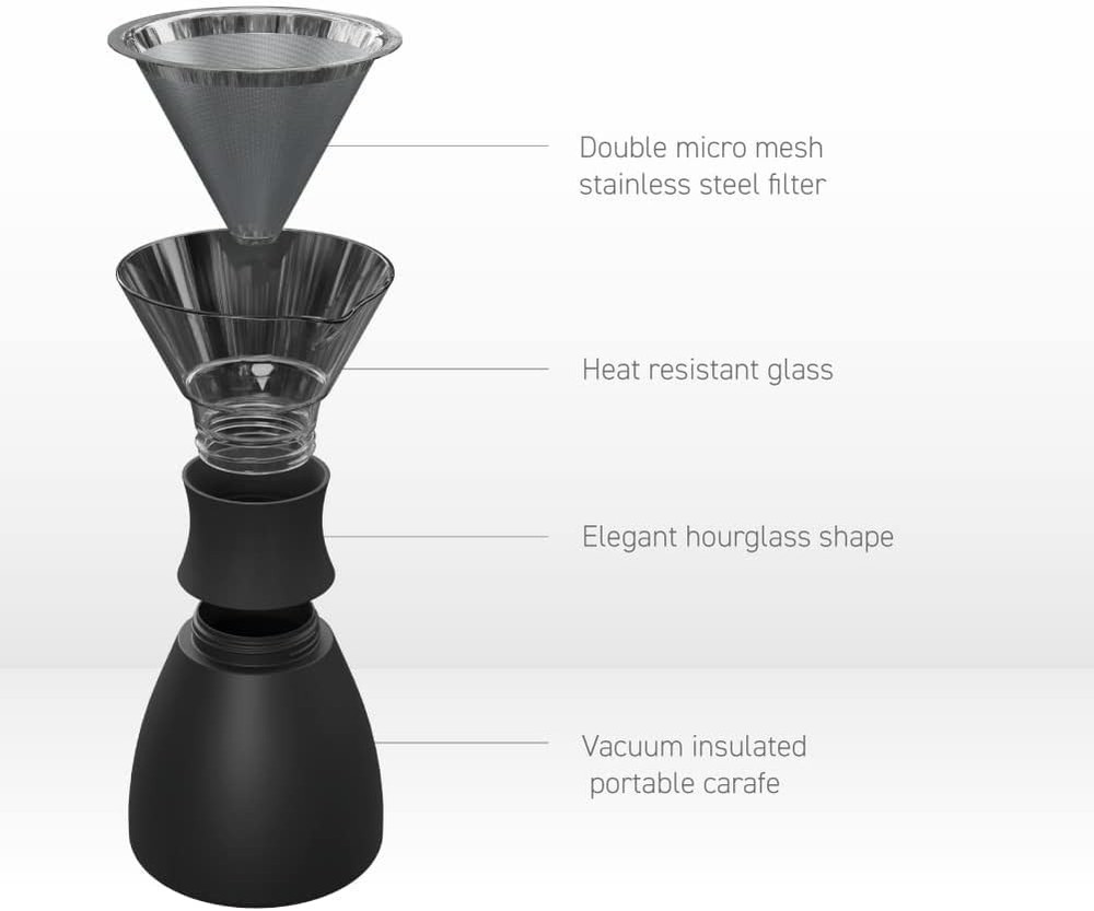 Premier Pour Over Craftsmanship - This 32-oz. coffee carafe pour over dripper is made with heat-resistant borosilicate glass and features an ergonomic, easy-carry design that makes it ideal for single cup use, hosting parties, or all-day enjoyment. Hot and Fresh Coffee Up to 12 Hours - A double-walled, vacuum-insulated design helps our coffee carafe retain drink temperatures for 12 hours to ensure a bold, fresh-brewed taste from the moment you make it until the last drop Stainless-Steel Micro Mesh Filter - Each pour-over coffee dripper features a reusable micro mesh filter that blocks debris, coffee grounds, and impurities from impacting taste, which means no more expensive paper filters. Ecofriendly, Reusable, BPA Free - Crafted with food-grade materials, our pour-over coffee maker is stain and odor resistant, easy-to-clean, and super portable for use at home, work, or traveling. Advanced Temperature Retention - This pour-over coffee maker offers insulated, copper-lined double-walled technology that makes it heat resistant for easier gripping and helps keep coffee hot and fresh for an amazing 12 hours at a time! Perfect for early mornings or long stretches at work.