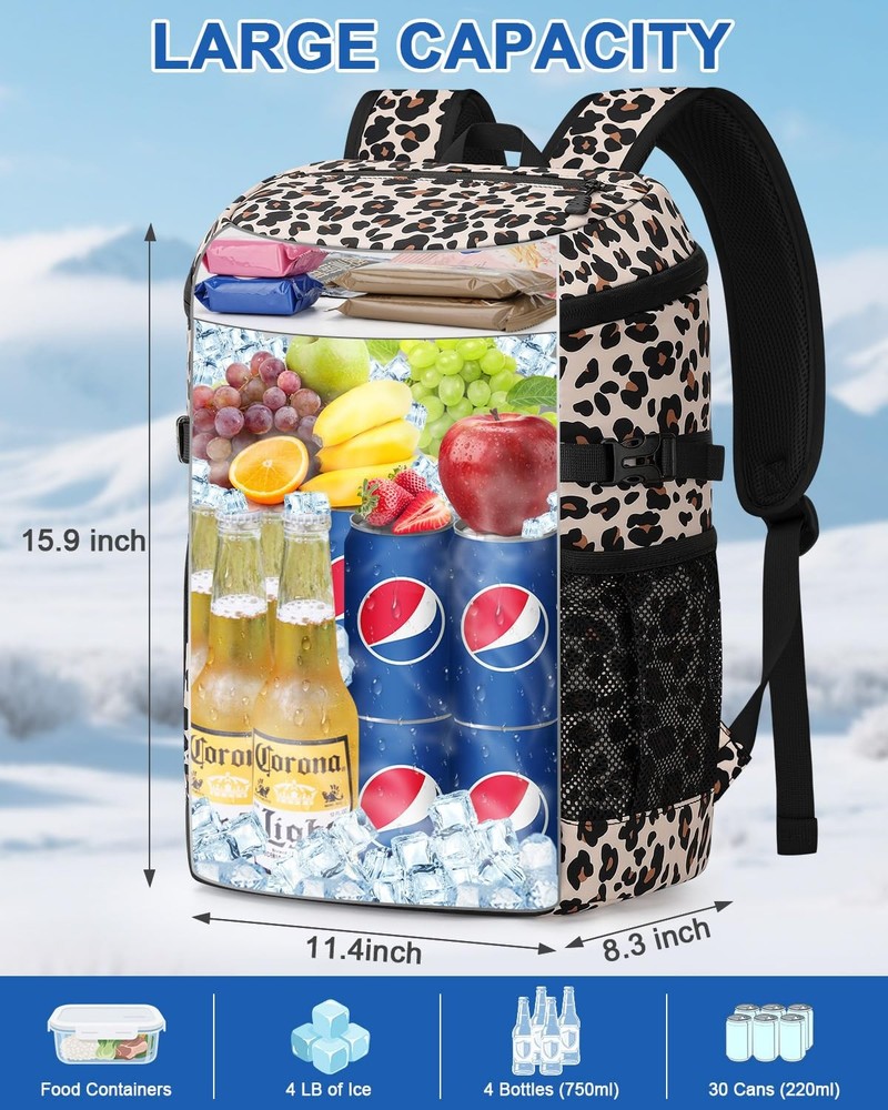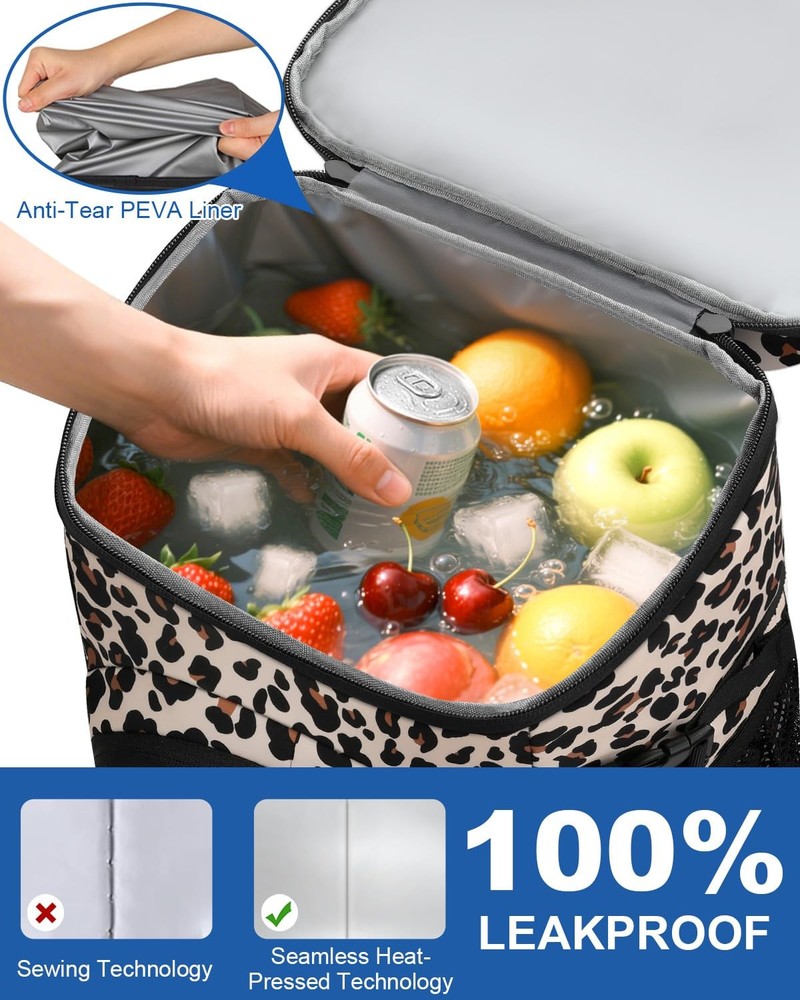 insulated cooler backpack keeps food and drinks hot or cold for up to 16 hours. Featuring a leakproof, food-grade liner and multiple compartments for easy organization, it's perfect for lunch, hiking, camping, fishing, or travel. Lightweight, comfortable, and designed for both men and women. Weight: 1.32 lbs Material: Upgrade Insulated & Leak-proof & Waterproof Cooler Backpack Size: 12.6 x 8.9 x 3.3 inch Color: Black/Khaki/Gray/Blue/Cow Print/Leopard/Pink Upgraded Insulation Technology: Our backpack cooler features multi-layered, high-density foam insulation and a food-grade PEVA lining that work together to maintain the temperature of your food and drinks for up to 16 hours. Whether you're packing hot lunches or cold beverages, backpack coolers insulated leak proof performs in all conditions. Enjoy fresh, safe meals and perfectly chilled drinks no matter how long you're out Leakproof Cooler Backpack: Engineered with a durable EPVA liner and seamless hot-pressing construction, this cooler provides 100% leakproof protection. Cooler backpack insulated waterproof prevents liquids from seeping through, even when carrying ice or sauces. Plus, the interior wipes clean in seconds. Keeps your gear dry and eliminates cleanup hassles—so you can focus on fun, not messes Spacious Multi-Compartment Cooler Bag: Features a generously sized main compartment for storing meals and fresh ingredients, a top zipper pocket for keeping dry snacks secure, front utility pockets with elastic cords for utensils or small tools, and 2 mesh side pockets for quick-grab items like water bottles or umbrellas. Ensures your essentials stay neatly organized and within reach with our insulated backpack cooler—eliminating clutter and saving time Ergonomic Comfort for All-Day Wear: Our ice chest backpack ergonomically designed with thick, breathable back padding and wide, adjustable shoulder straps that are cushioned for added comfort and airflow. Even when fully loaded, weight is evenly distributed to reduce pressure. Our backpack coolers offer unmatched comfort for all-day carrying—say goodbye to sore shoulders and sweaty backs Multi-Purpose Insulated Cooler Backpack : More than just a coolers, our lunch backpack is designed for versatility across all your activities—whether hiking rugged trails, lounging at the beach, fishing by the lake, or camping on weekends. Its durable, leakproof construction and thoughtfully organized compartments keep your food and drinks fresh, hot, or cold for hours. Experience unmatched convenience and peace of mind, making every outing more enjoyable and hassle-free.