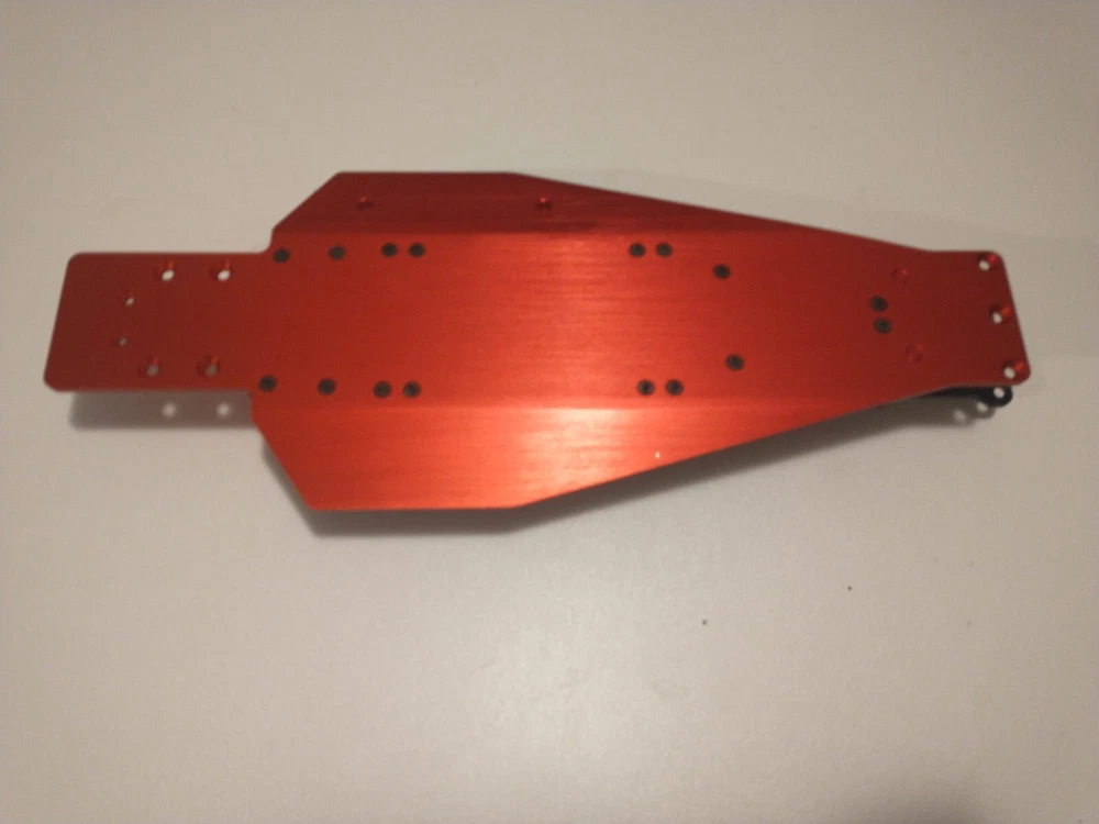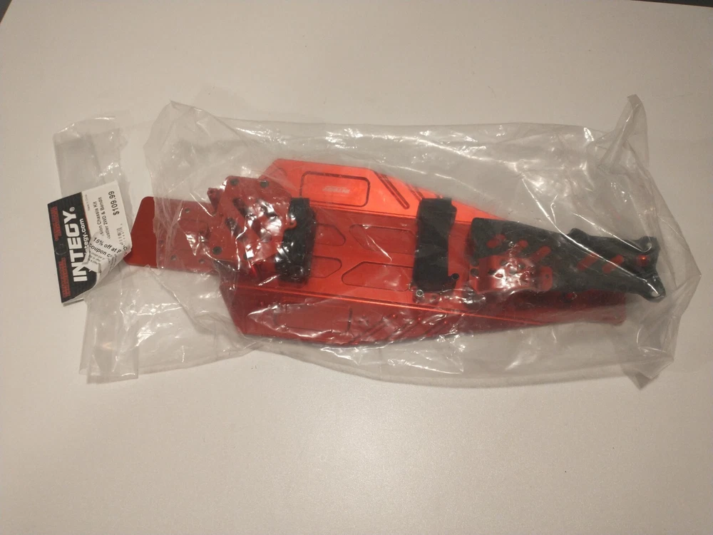 This aluminum chassis from Integy is new and has never been used. It was, however, opened and inspected. The kit uses all countersunk hex head hardware. There is one small scratch in the paint that you can see in the last two pictures of this listing. What you see in the pictures is what you will receive. There is no stickers included or manual. From Integy's website: OVERVIEW Add chassis stiffness and head turning anodized aluminum at the same time to your 1/10 Bandit with our Performance Conversion Kit! The stock molded chassis is replaced by an anodized aluminum lower deck that is milled out in strategic areas to lose dead weight without hindering chassis strength. A carbon fiber plate up front stiffens up the steering area, and hook-and-loop fastener battery straps hold your battery securely in place – no more accidental battery packs ejecting from the vehicle! All sales are final, and no returns are accepted. Please contact me if you have any questions about this lovely upgrade!