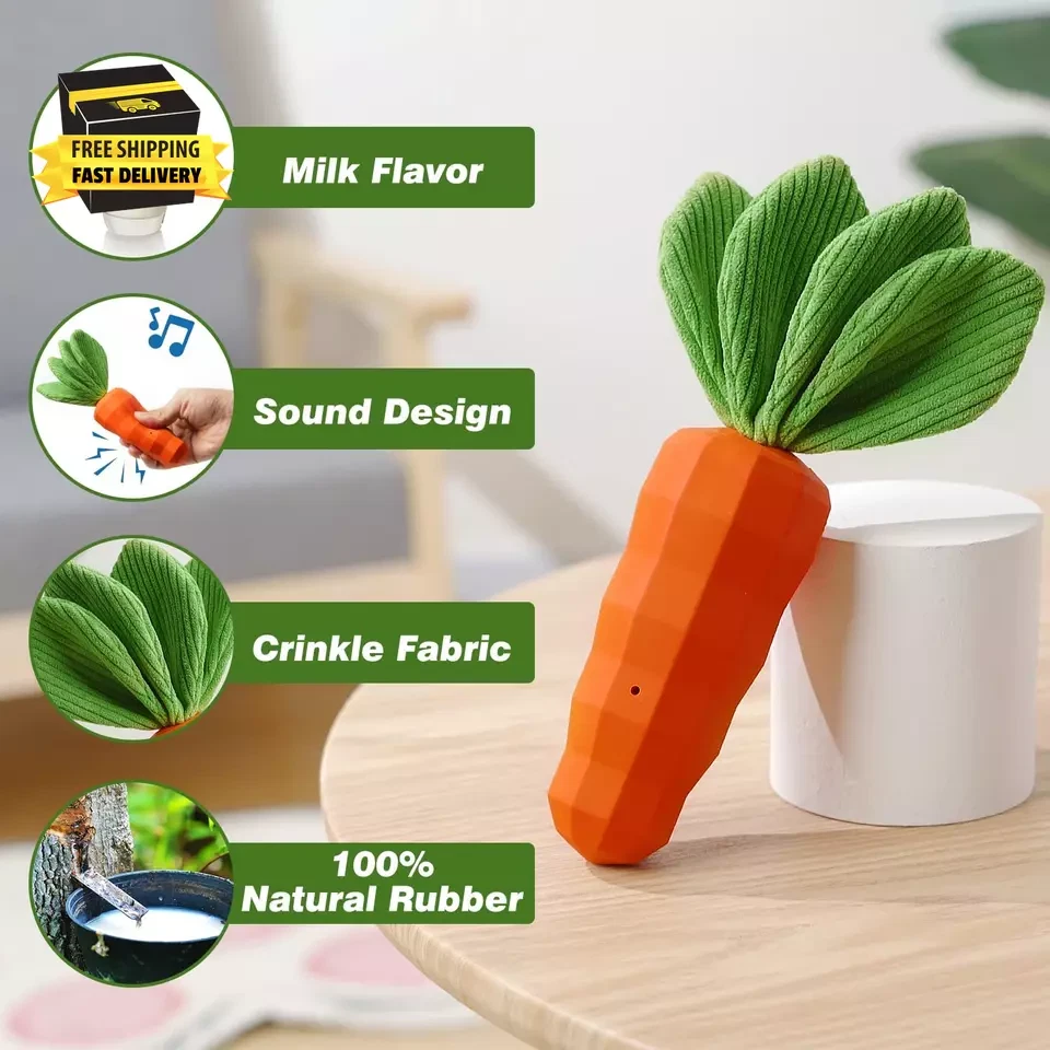 Green Leaves made of no stuffing plush with crinkle paper inside. Orange Carrot Body made of natural rubber. Toy dimensions is 9 in * 1.8 in. Squeaker Inside - Your dog's favorite new squeaky toy! The sounds would not too loud. Dogs can chew with this squeaky toys during the night and do not wake up the whole house. Milk Flavor & Rubber - Dog chew toy made of natural rubber materials for medium breed dogs. Milk flavor design easily attracts your dog's attention and arouse the chewing instincts of your dog. Dental Health Care - Raised texture on the surface effectively helps clean up the dirt and some food residues left on your dog's teeth. Reducing discomfort during the teething period and protecting them from oral diseases greatly. Interactive & Training - Interactive play, training games activity are good for strengthening the affection between you and your dog. Developing and Maintaining the dog's physical alertness. Accompany & Anxiety Relief - Let you dog far away form loneliness. Helping your dogs relieve anxiety and loneliness, and provide comfort even in complex environments such as transitions to new homes, thunderstorms, and travel.