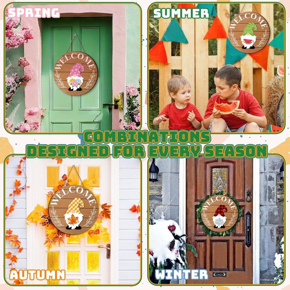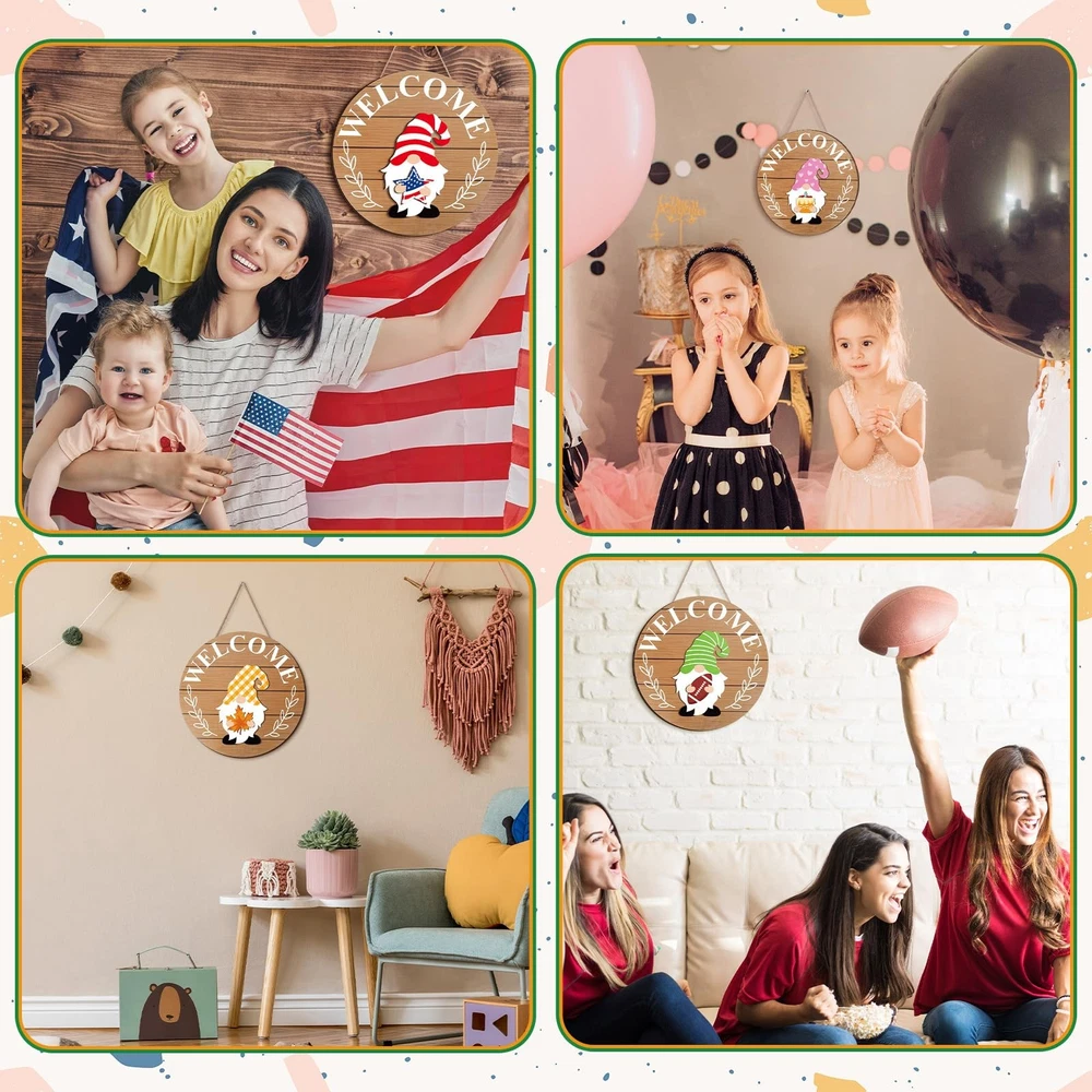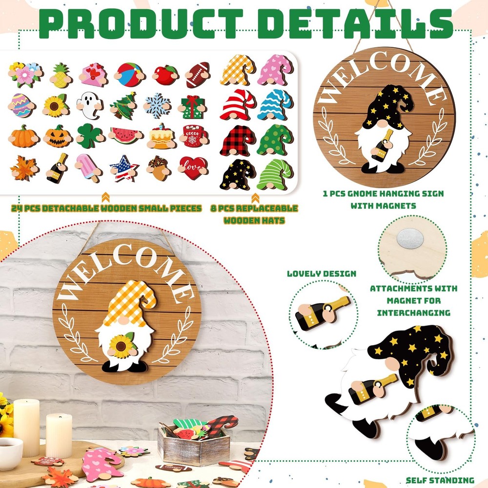 Features: Magnet design: The gnome interchangeable seasonal sign is attached to the magnet and iron plate by hand, which can be replaced more easily. Housewarming gift: This abundant holiday signs decor set is suitable for housewarming parties, a practical gift for neighbors or friends, and they will be cheerful and lucky to receive the gift. Specifications: Main material: wood Color: as shown in the picture Size: as shown in the picture Package includes: 1 x Welcome home sign 8 x Hats 24 x Swappable pieces Notes: Manual measurement, please allow slight errors on size. The color may exist a slight difference due to different screen displays. Warning: this product contains magnets. Keep away from children and pets. Interchangeable Welcome Sign: you will receive 1 welcome home sign, with 8 detachable hats, and 24 seasonal accessories, each with a magnet for easy replacement, numerous styles are convenient for you to combine at will, which can meet your daily needs Material and Size: the Interchangeable winter wooden Gnome decors are made of wooden material, strong and reusable, safe and reliable, light and portable; The wall hanging sign is about 12 x 12 inches/ 30 x 30 cm, the size of the hat is about 4.05 x 3.62 inches Beautiful Appearance: these DIY gnome seasonal decors are exquisite and beautiful in design, namely stars, pumpkins, gift boxes, maple leaves, flowers, etc., which can meet your different decoration needs Nice Choice for Home Decoration: these heart wooden gnome decor are in medium size, which can be placed on your layered tray, shelf or mantle; They can be changed every month of the year according to your own preferences; Note that Not for food contact; Decorative use only Exquisite Presents: this gnome sign can be applied as an exquisite gift for birthday, wedding, Christmas and other festivals, you can give it to your parents, friends, colleagues or other people to express your sincere wishes and make them feel happiness