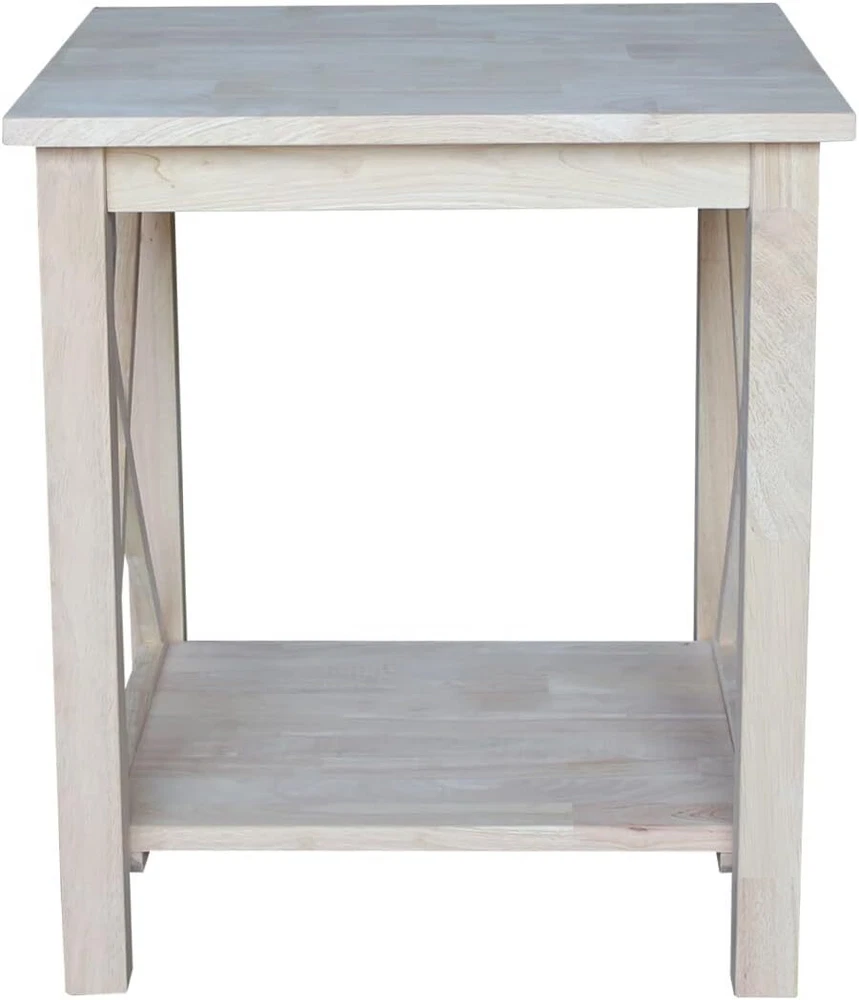 International Concepts Hampton End Table, Unfinished Product Details Brand: IC INTERNATIONAL CONCEPTS Product Dimensions: 22"D x 22"W x 25"H Maximum Weight Recommendation: 200 Pounds Color: Unfinished Product Care Instructions: Wipe with Dry Cloth Item WeightFrame Material: 31 PoundsWood Top Material TypeShape: Rubber WoodSquare Made from solid parawood One Shelf Decorative X design Assembly required Unfinished This practical, beautiful table from International Concepts is the perfect accent piece to your family room, living room, bedroom or entryway. This solid wood table is part of a high-quality collection of wood furniture that will easily complement any décor. Parawood – a hardwood known for its durable, strong, and environmentally friendly nature – is used to craft these traditional, unique tables. Whether you are creating a casual or elegant look and feel in your home, the occasional table from International Concepts will be a perfect match.